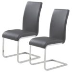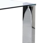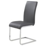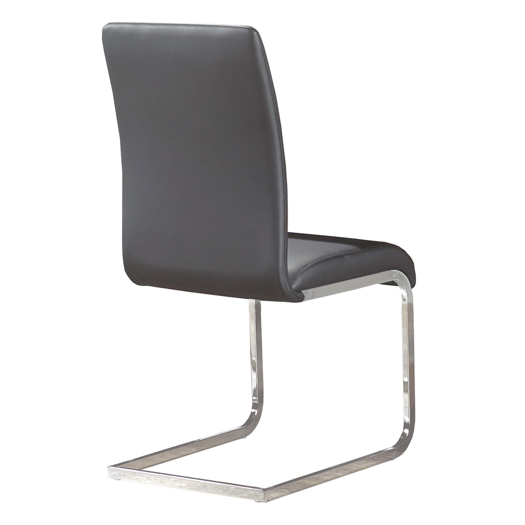 The clean lines of contemporary design are perfectly defined with this dining table. The rectangular posts with their chrome finish and the clear glass table top come together seamlessly to create a beautiful table with a light airy feel. Great for open concept areas where you don’t want to close off the space, or even for tighter spaces where you want to create a more open feel. Contemporary style chair with chromed metal frame and faux leather seat. The subtle curves on the chair back and seat provide plenty of comfort.