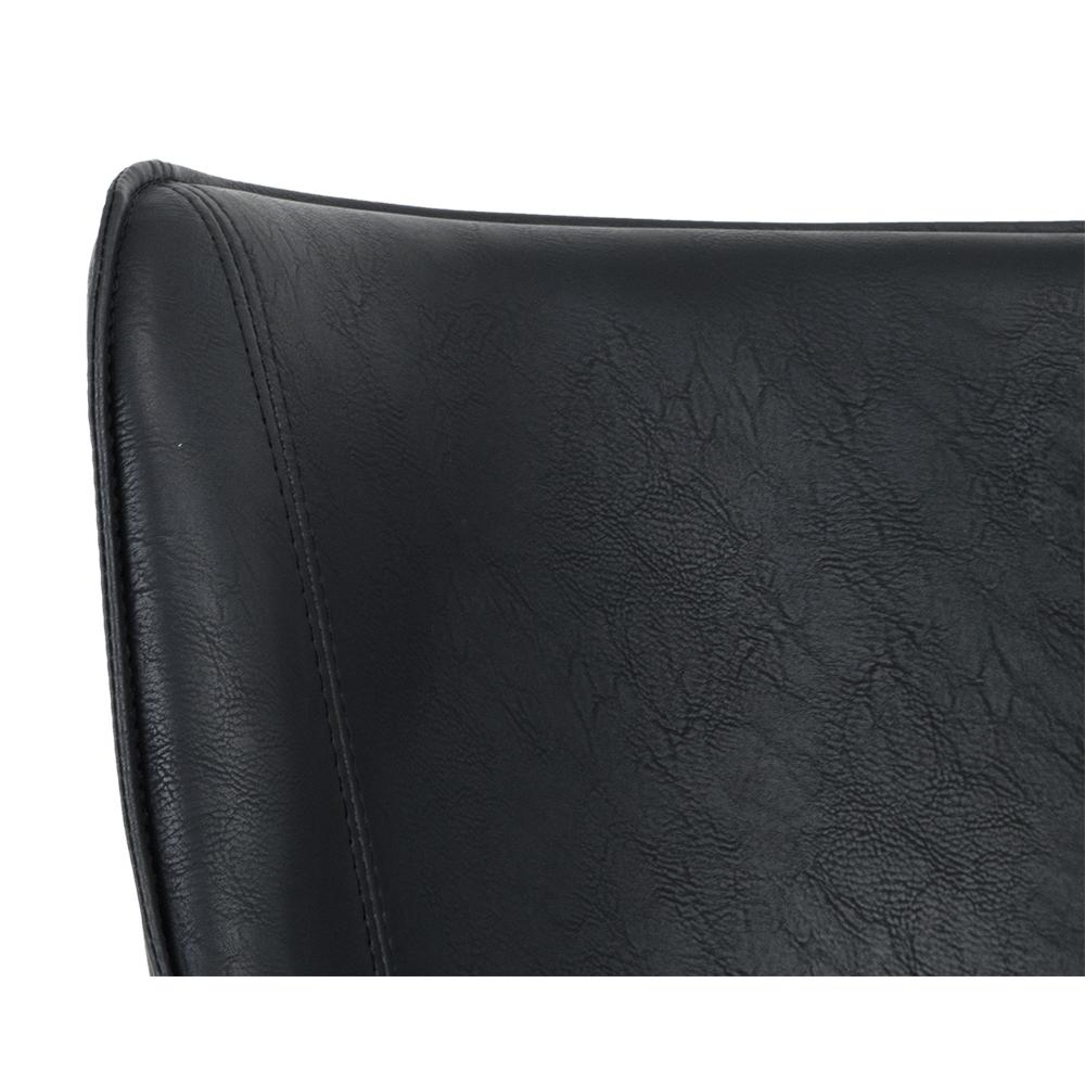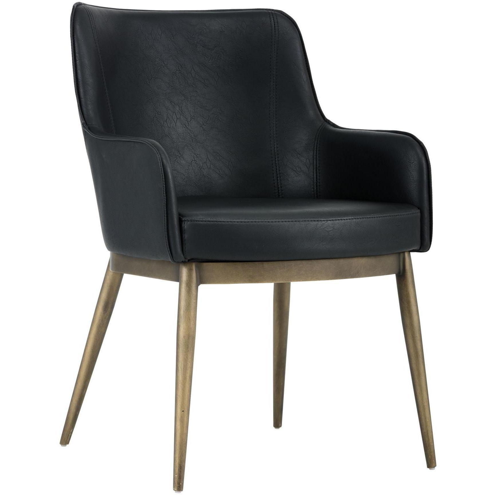 This compact barrel back armchair will add rustic and mid-century modern styling to dining and living spaces. Stocked in our vintage black faux leather with antique brass steel frame and legs. Handle With Care: This design has been crafted with faux leather. Faux leather is manufactured to reflect the natural characteristics of leather; as such, colour variations, markings, wrinkles, grooves, and light scratches are appreciated characteristics. No two pieces will be alike. Visit our Product Care page for more information on how to ensure the lasting beauty of this piece.