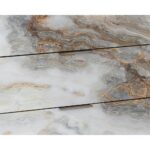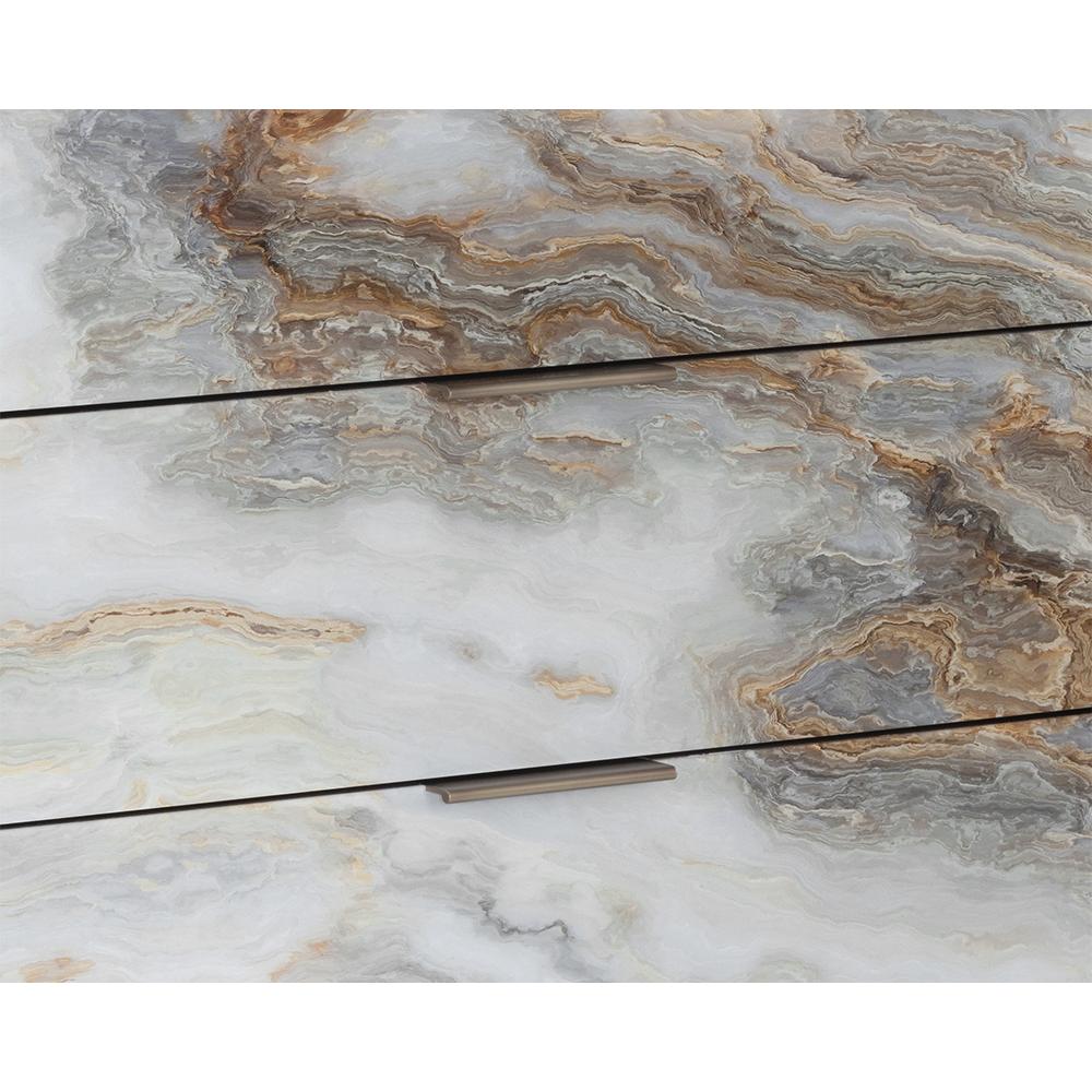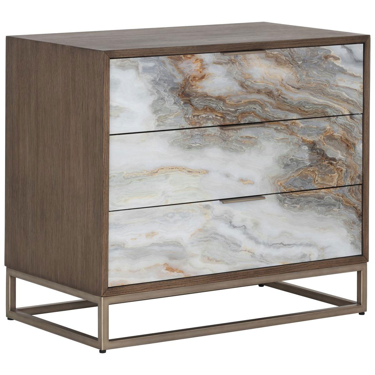 Incorporate a touch of extravagance to any bedroom space with this brilliant nightstand that is full of rich detail. Features a brown wooden base in an oak veener with printed acrylic doors that share a likeness to mother of pearl. Ample storage is available inside the three cabinets which includes soft close doors. Completed with steel legs in a brass finish. Pairs well with the Fuentes dresser.