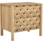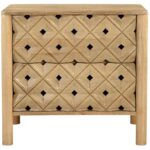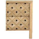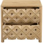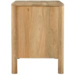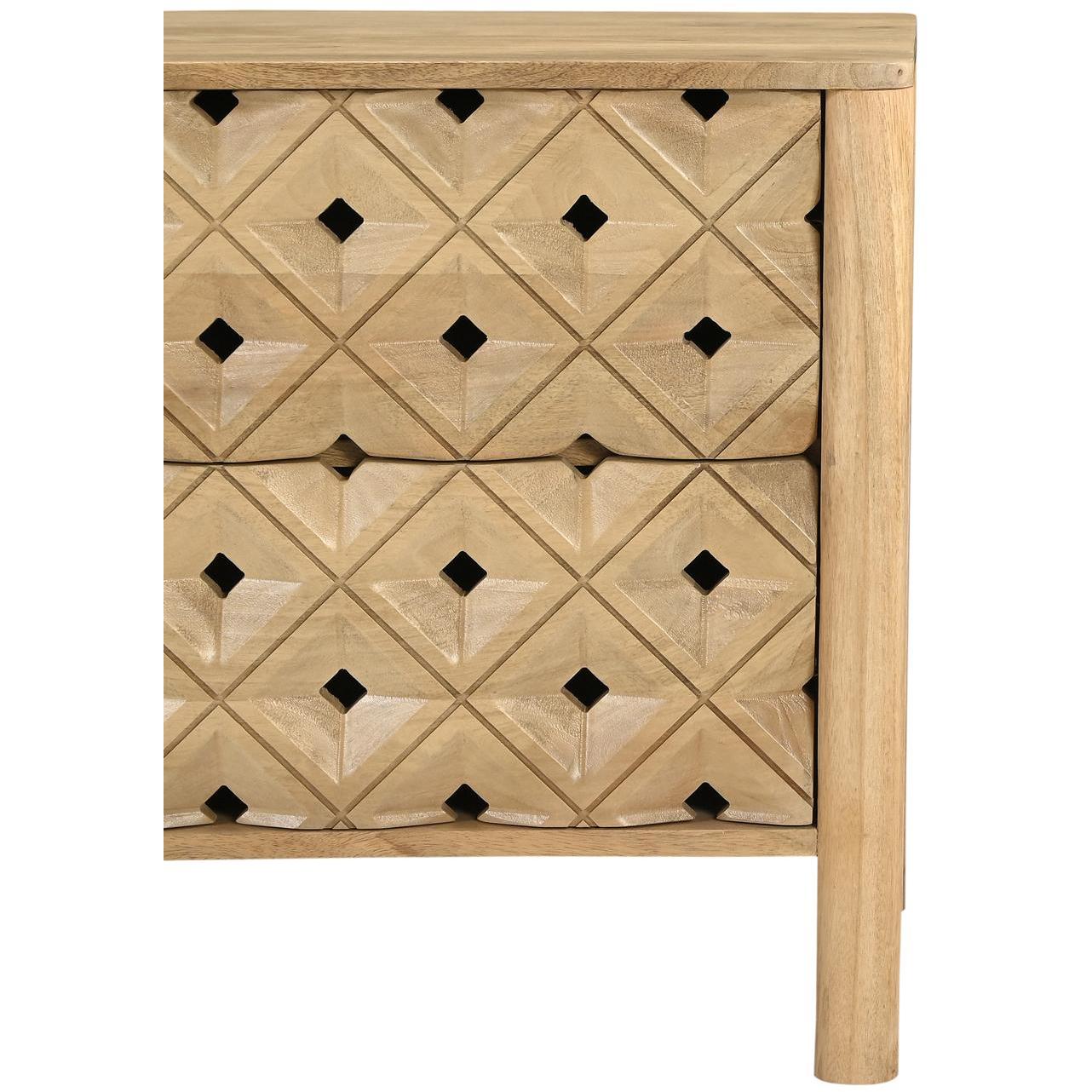 Carved from solid mango wood, the Fulton nightstand’s geometric, off-centered front creates a striking focal point. Two push-to-open drawers offer effortless functio nality. The natural finish showcases the wood’s rich grain, celebrating its inherent beauty.