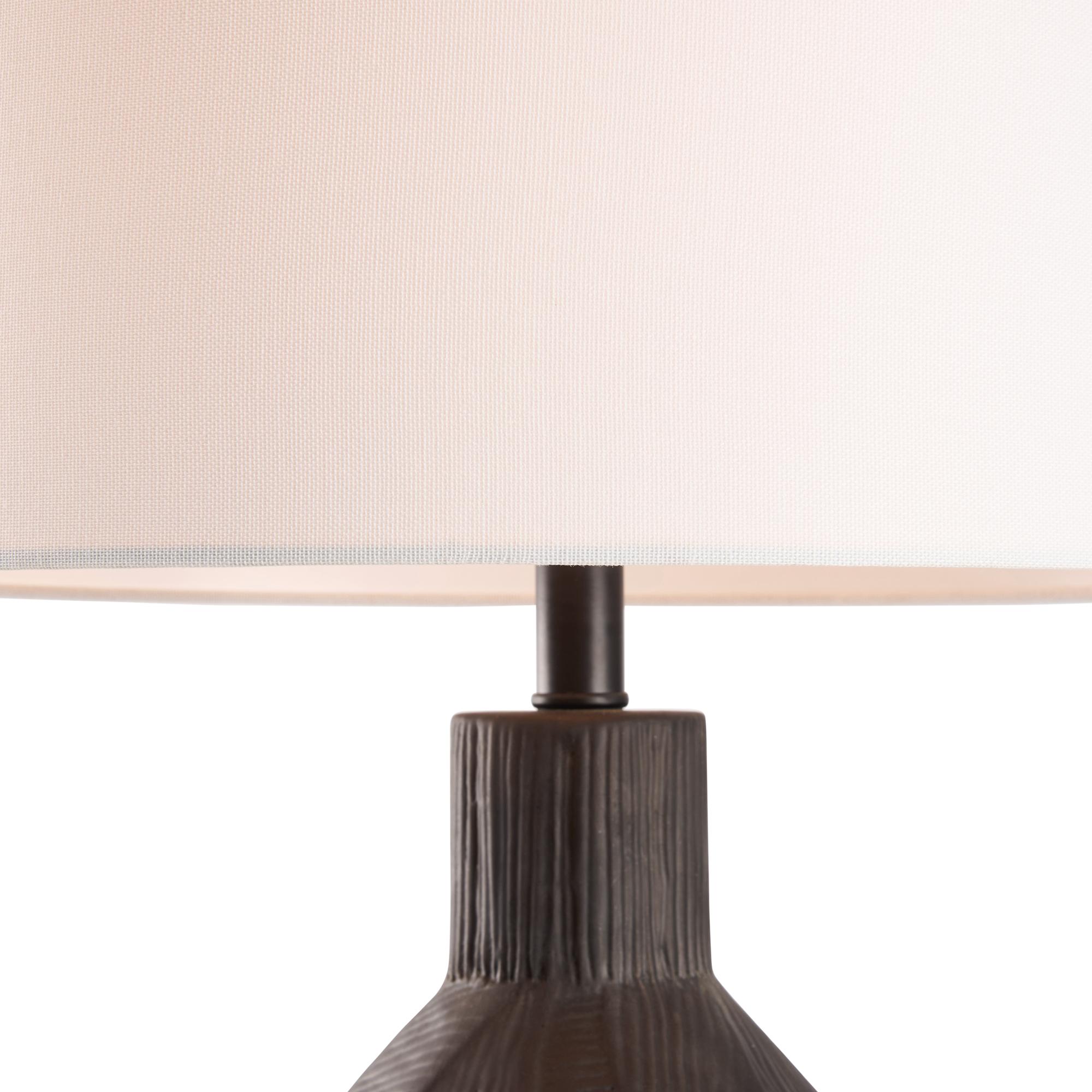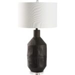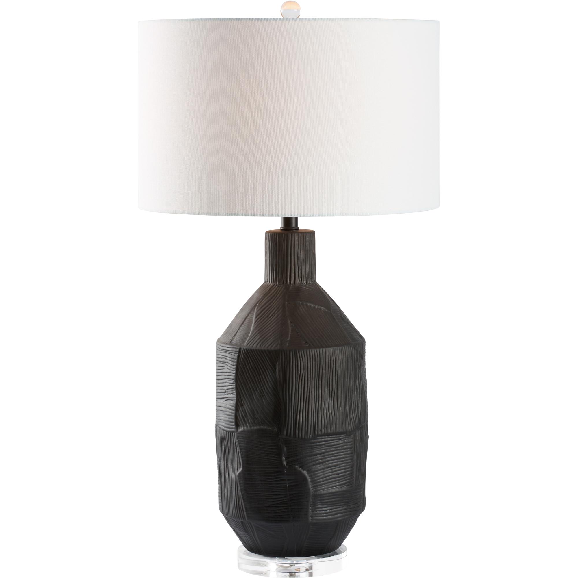 This ceramic lamp showcases a matte black finish accented by subtle lines and textures, creating a soft, understated elegance. Its minimalist design adds a touch of quiet sophistication.