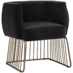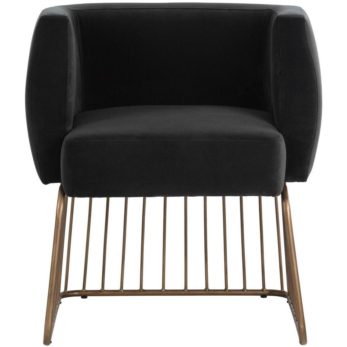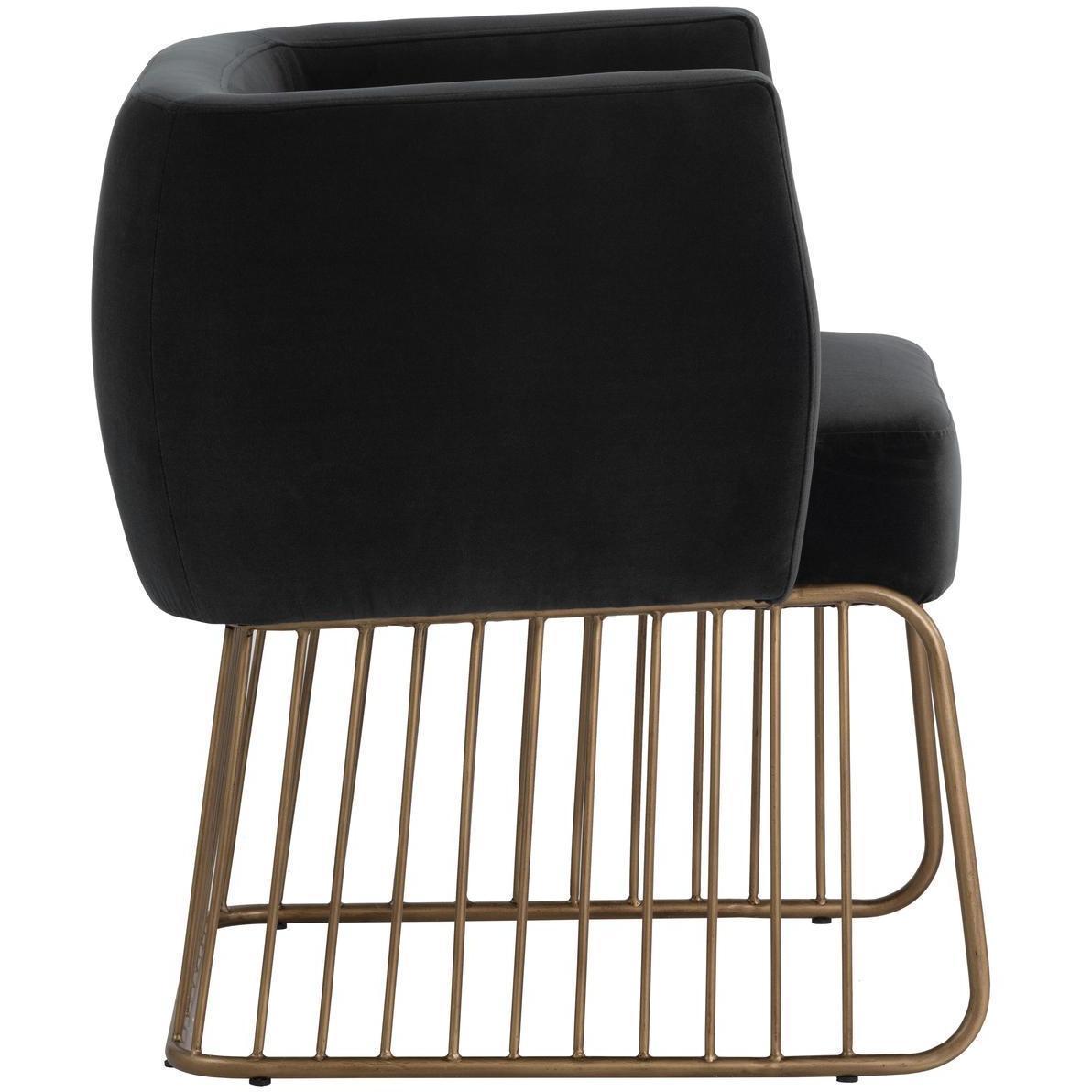 Rustic and modern charm come together in this dining chair. Stocked in our soft forest green and shadow grey fabric with a comfortable seat and unique brushed antique brass cage-style base. Perfect for dining, lounge and office spaces.