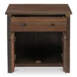 Finished in a rich dark brown, this reclaimed neem wood Gene charging nightstand offers a harmonious blend of form and function, merging modern technology with timeless elegance. Two doors reveal open shelving, while a soft-close drawer provides discreet storage. Crafted with mango wood, an integrated wireless charging top compatible with both Mac and Android devices adds a contemporary touch to this sophisticated piece.