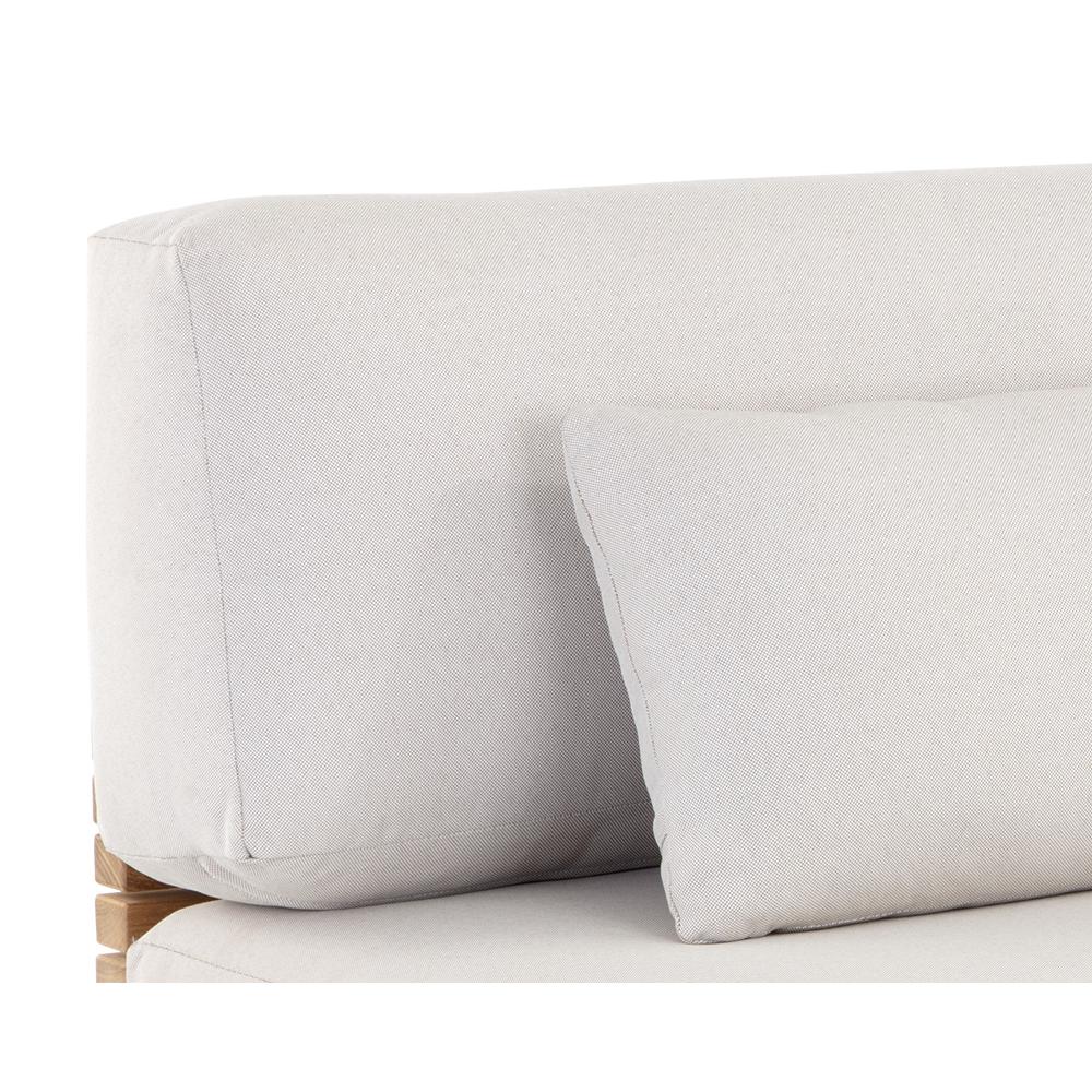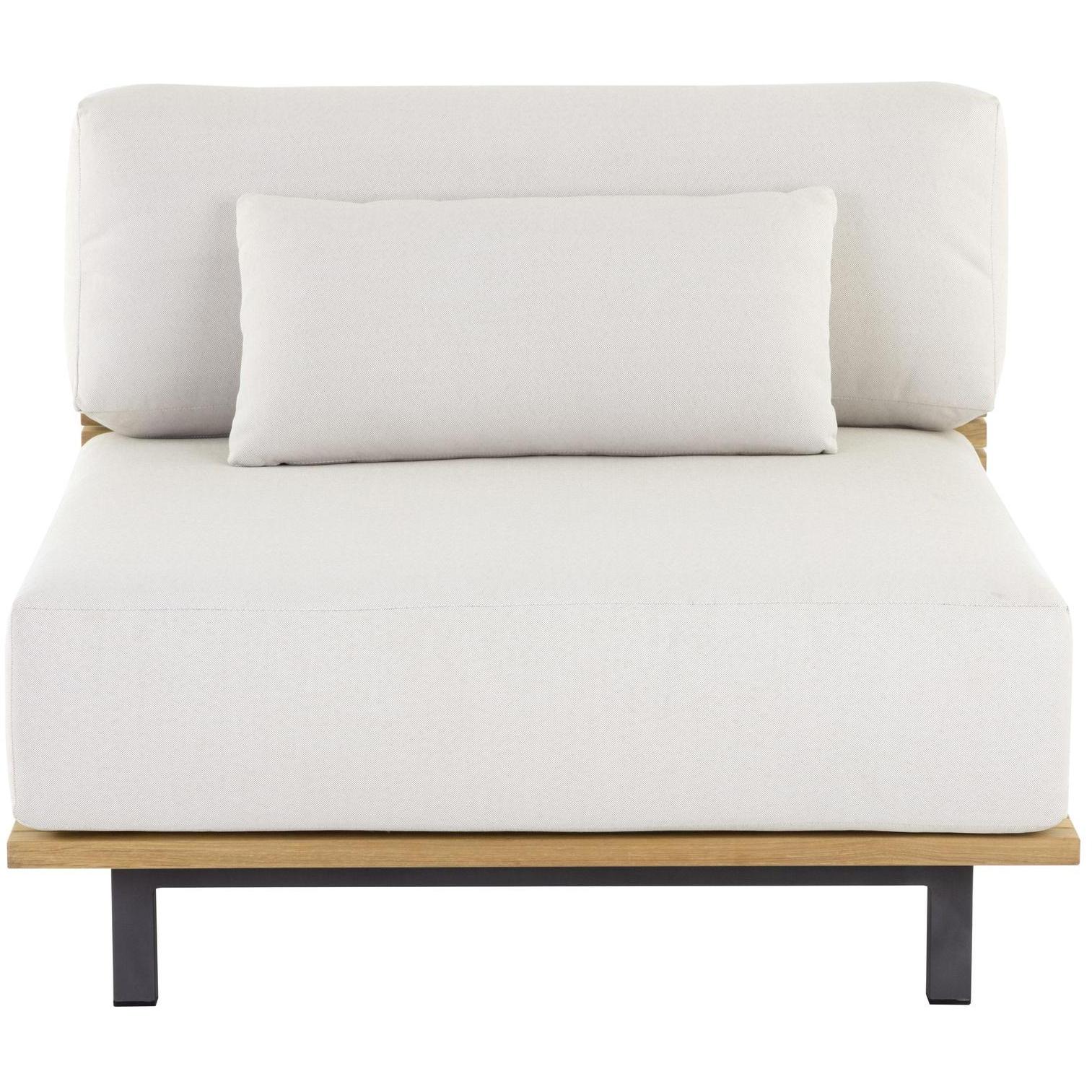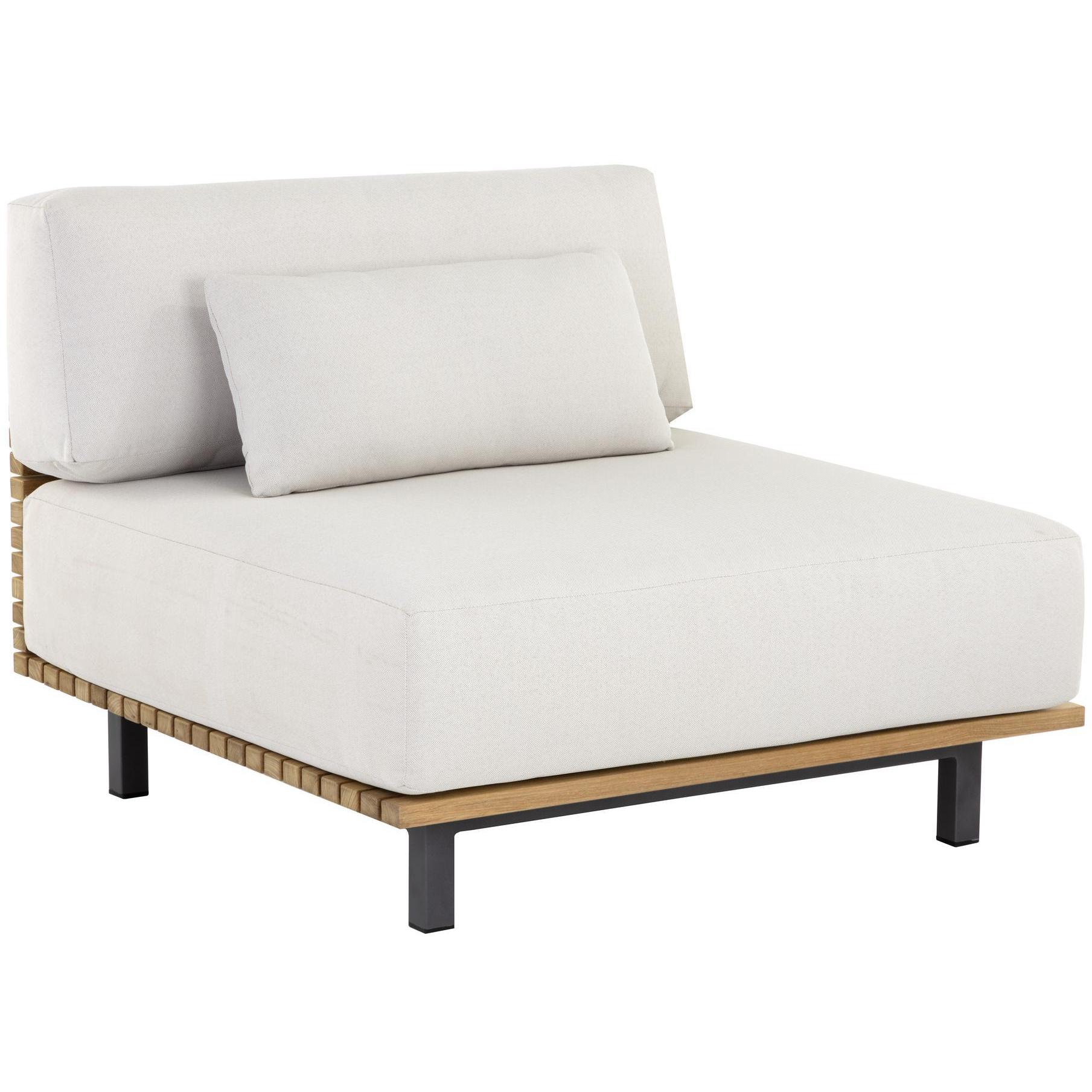 Appreciate warmth and sunlight while seated in an outdoor dining space inspired by the Arizona desert. This modern armless chair features upholstery in palazzo cream fabric, atop a natural teak wood frame. Finished with a powder-coated aluminum base. Suitable for indoor and covered outdoor spaces.