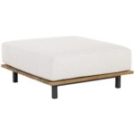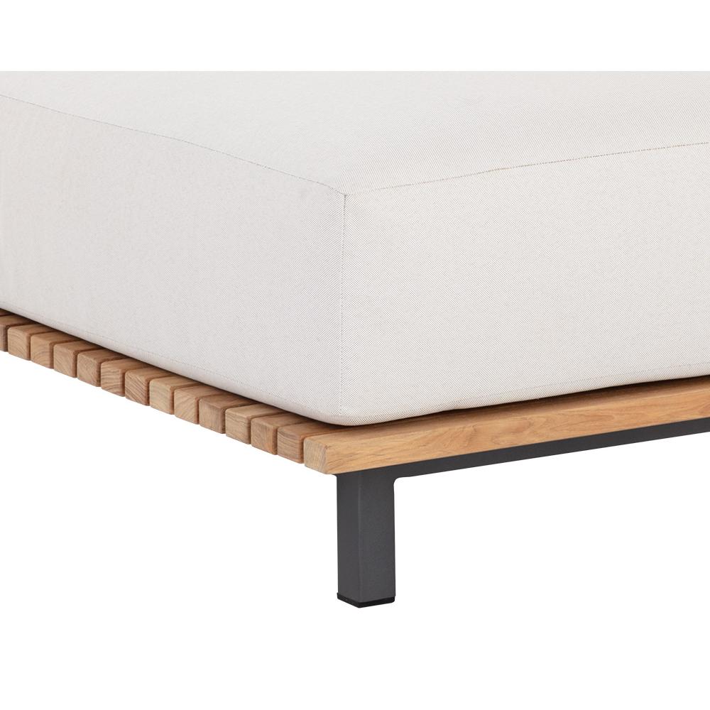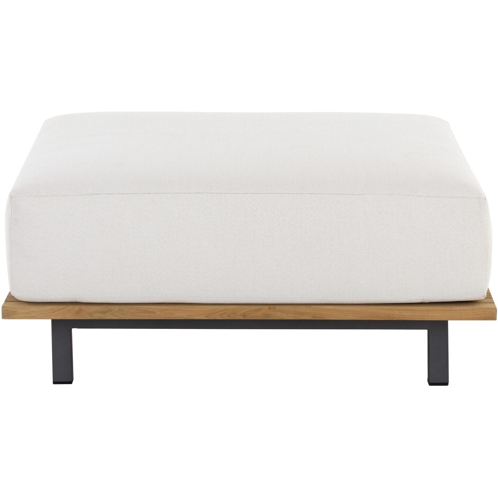 Appreciate warmth and sunlight while seated in an outdoor dining space inspired by the Arizona desert. This modern ottoman features upholstery in palazzo cream fabric, atop a natural teak wood frame. Finished with a powder-coated aluminum base. Suitable for indoor and covered outdoor spaces.