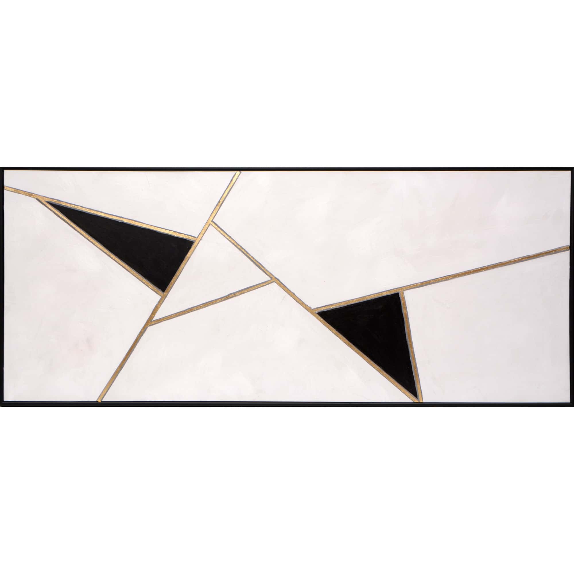 This contemporary painting features a lively, geometric design of white, black and gold paint. Features a black finished wood floater frame. Each artwork is hand-painted and will feature slight variations that make every piece unique.