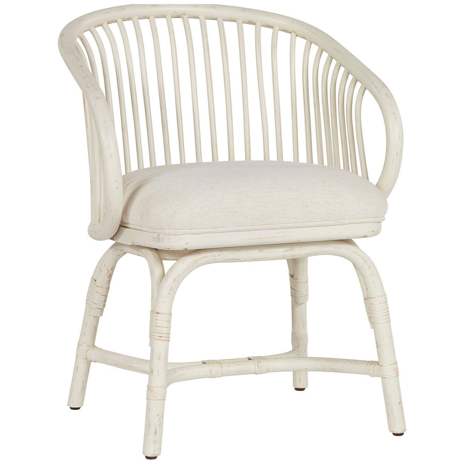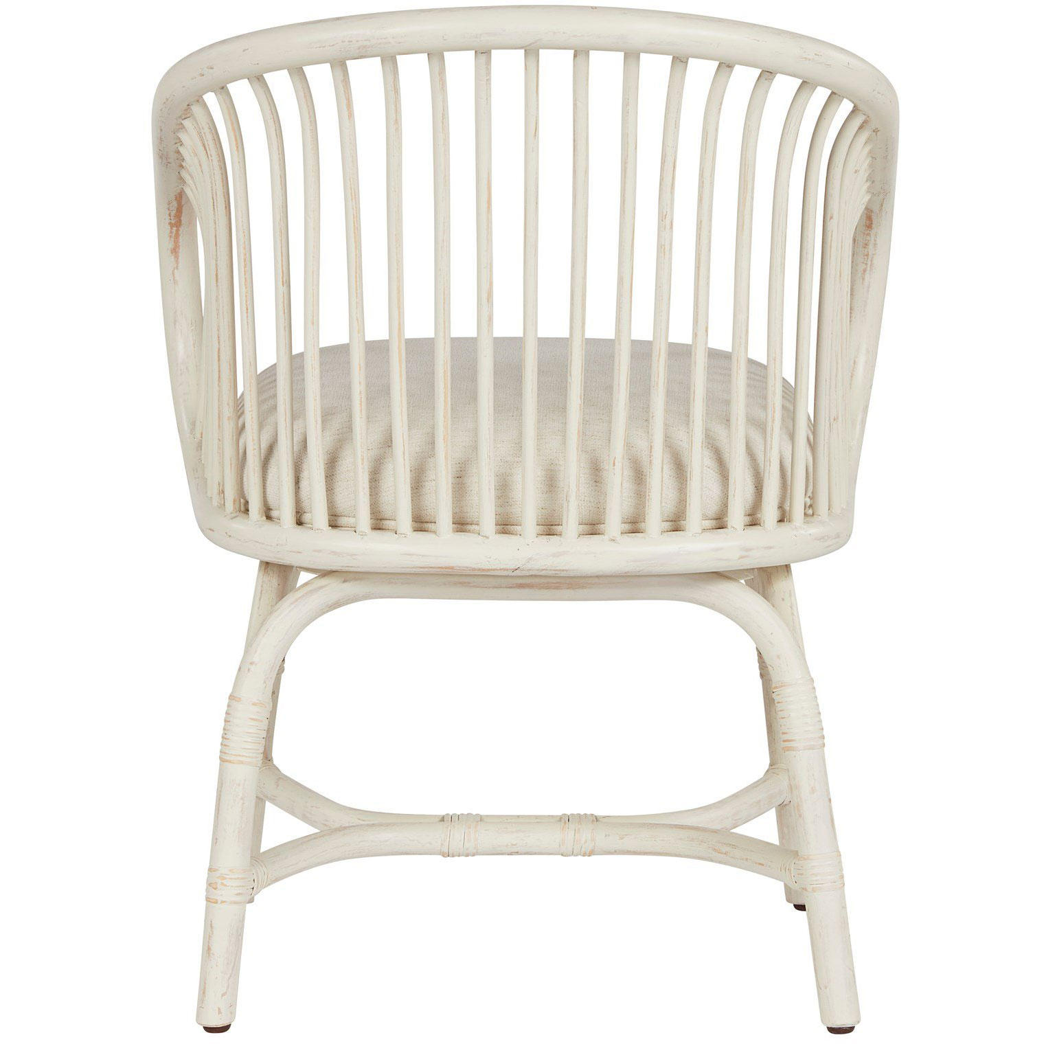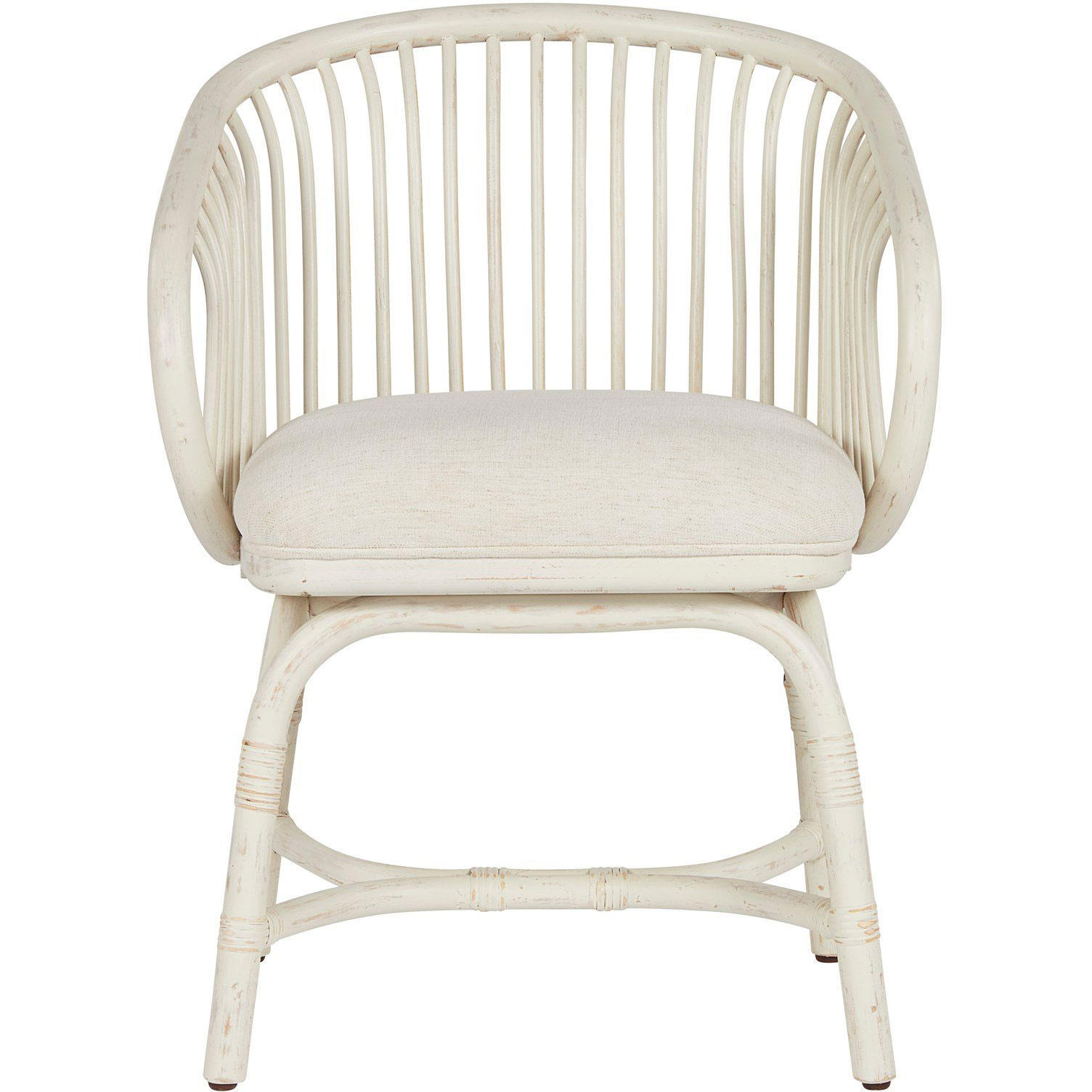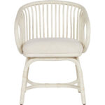 Casual yet contemporary, the Aruba Rattan Chair showcases a rounded, open-air back with gently integrated texture details, a crisp white finish, and a plush upholstered seat.