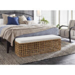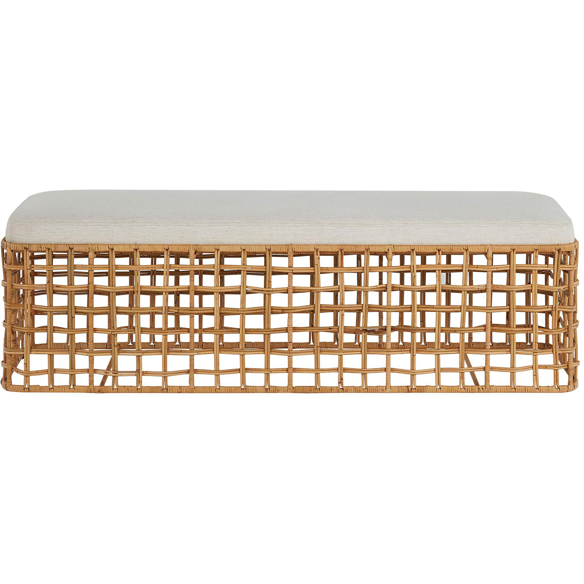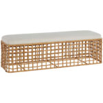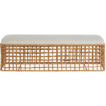 A full-bodied texture piece, the Rattan Bench features an interlaced wicker body with an upholstered seat, making it the perfect accent piece for bed-ends, hallways, and more.