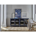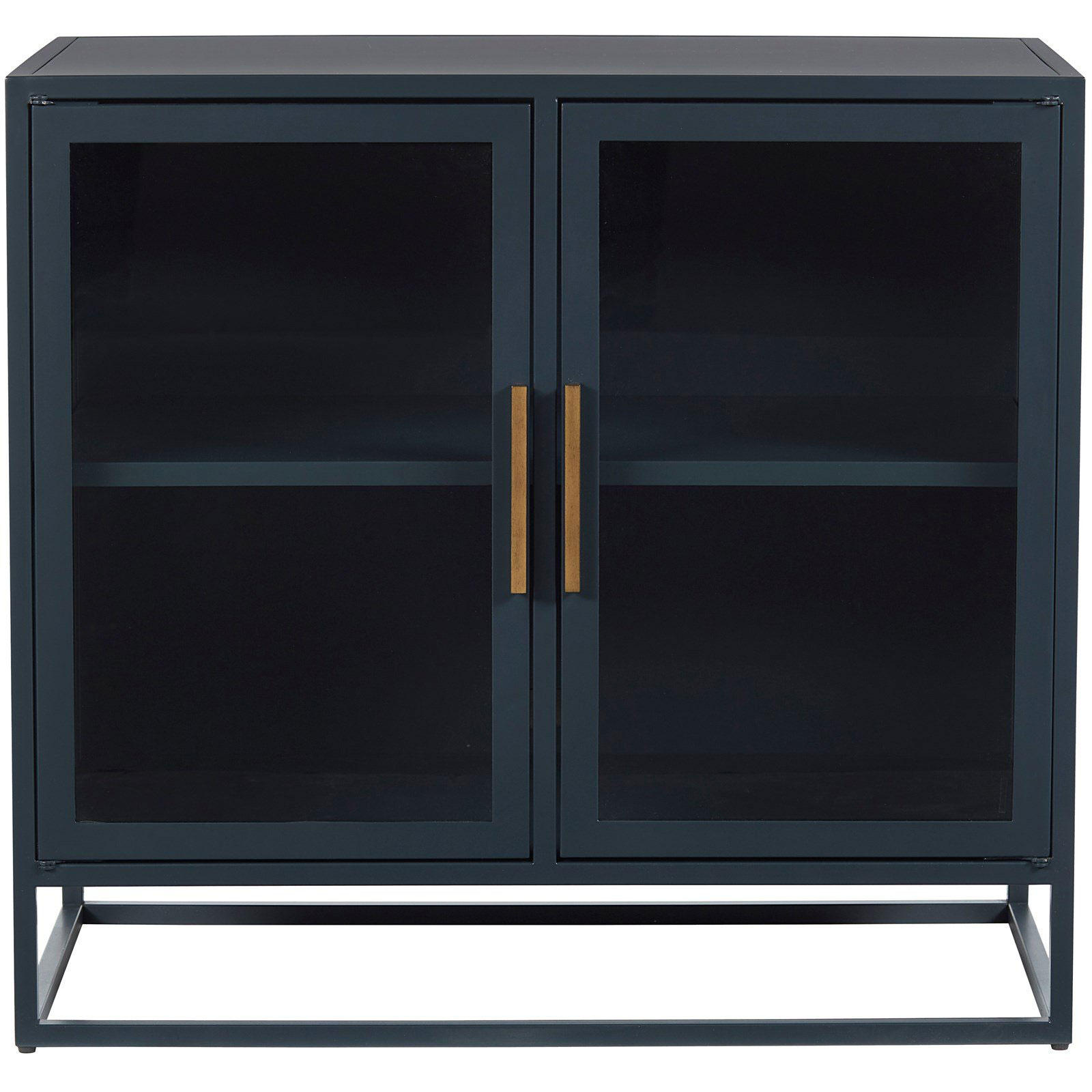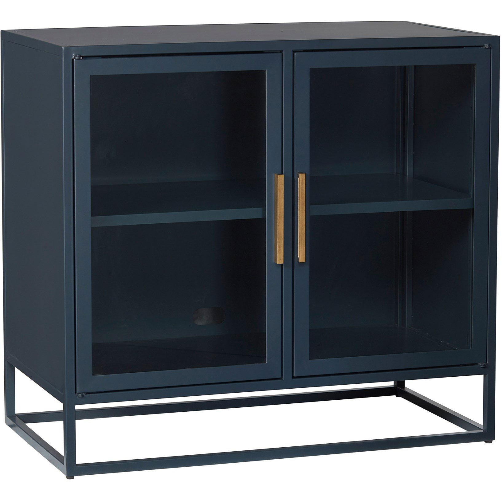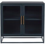 The striking Santorini Metal Kitchen Cabinet elevates interiors with calming seaside vibes, showcasing an alluring deep blue finish, clear glass doors, and sleek gold bar hardware.