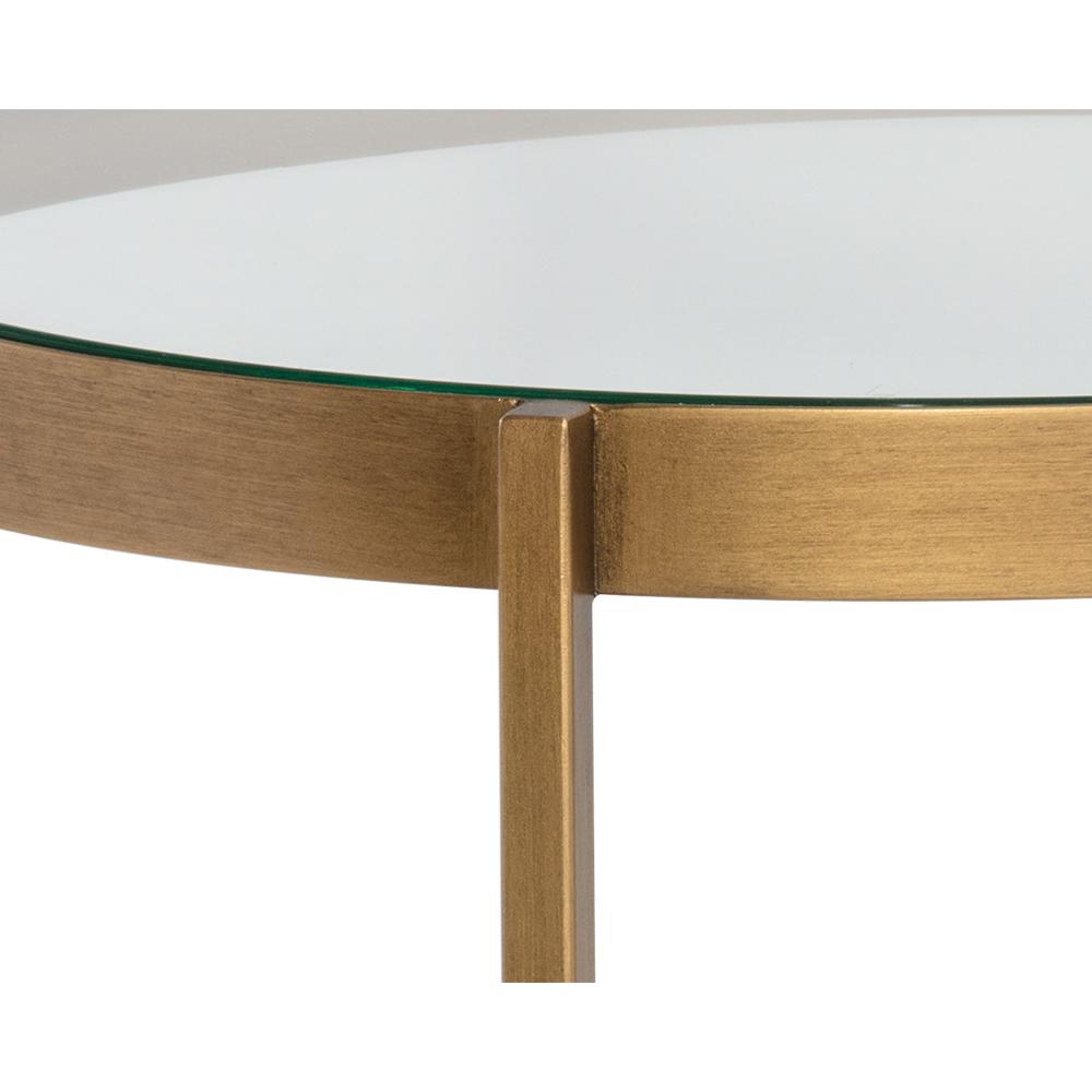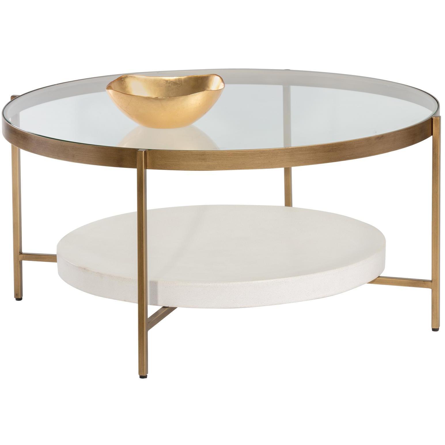Incorporate an air of understated elegance into your designs with this coffee table. A beautiful round glass top and white concrete shelf are supported by a brushed antique brass finished steel frame. Crafted from a natural concrete mix, each piece will look different. Variations in colour, texture, imperfections, surface scratches and non-structural hairline cracks are considered inherent and valued qualities of the material.