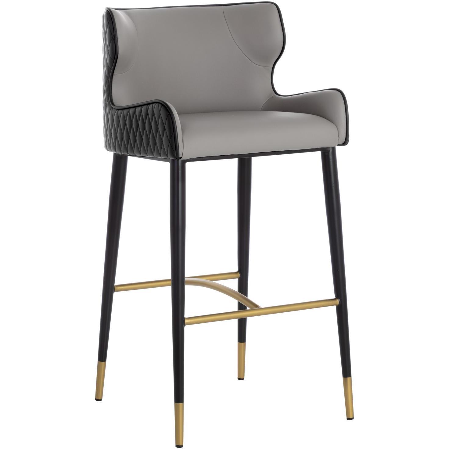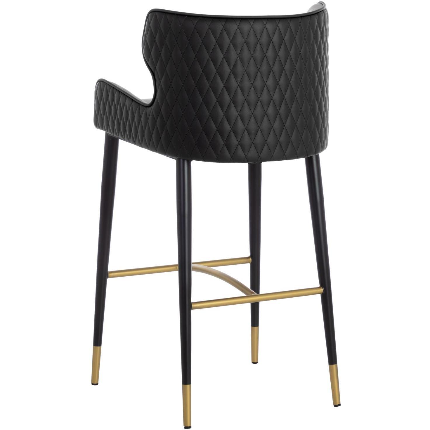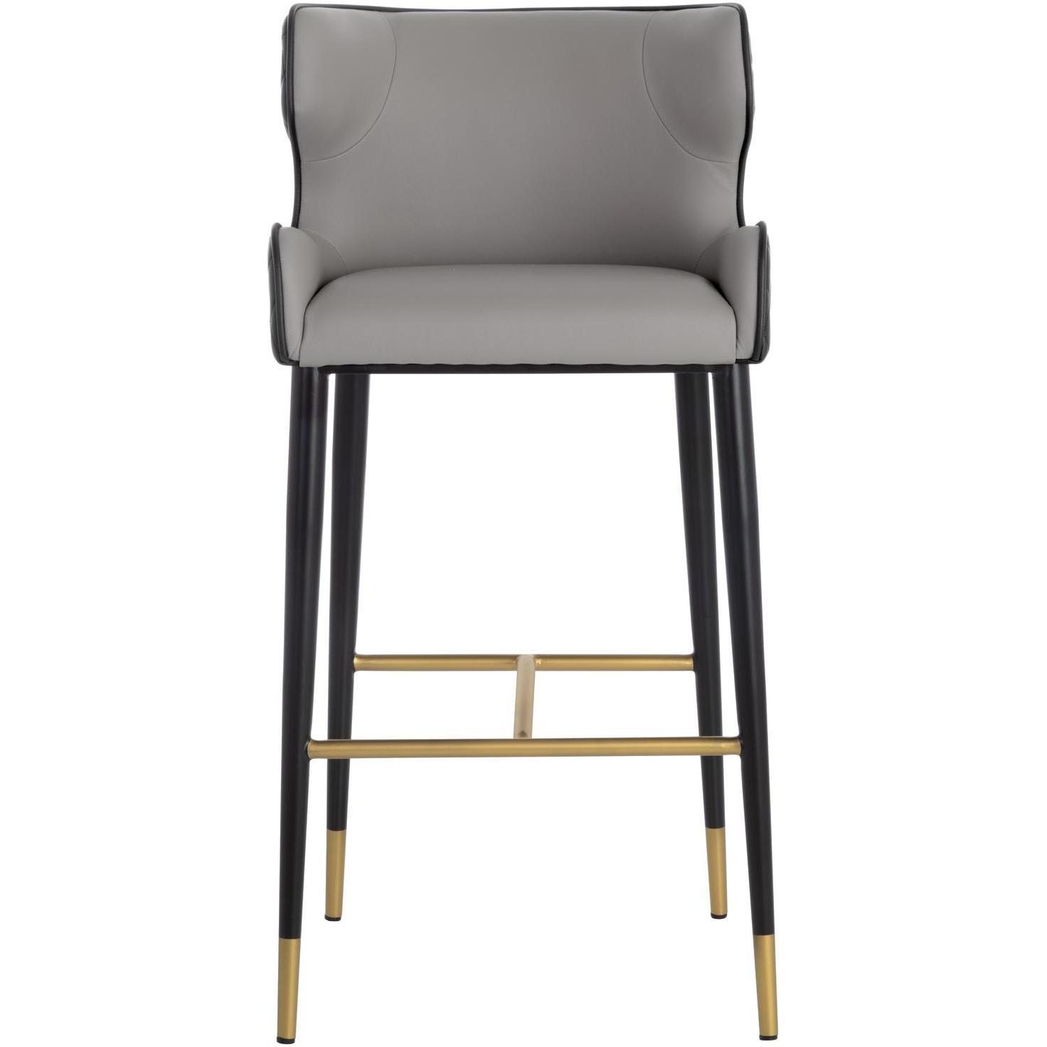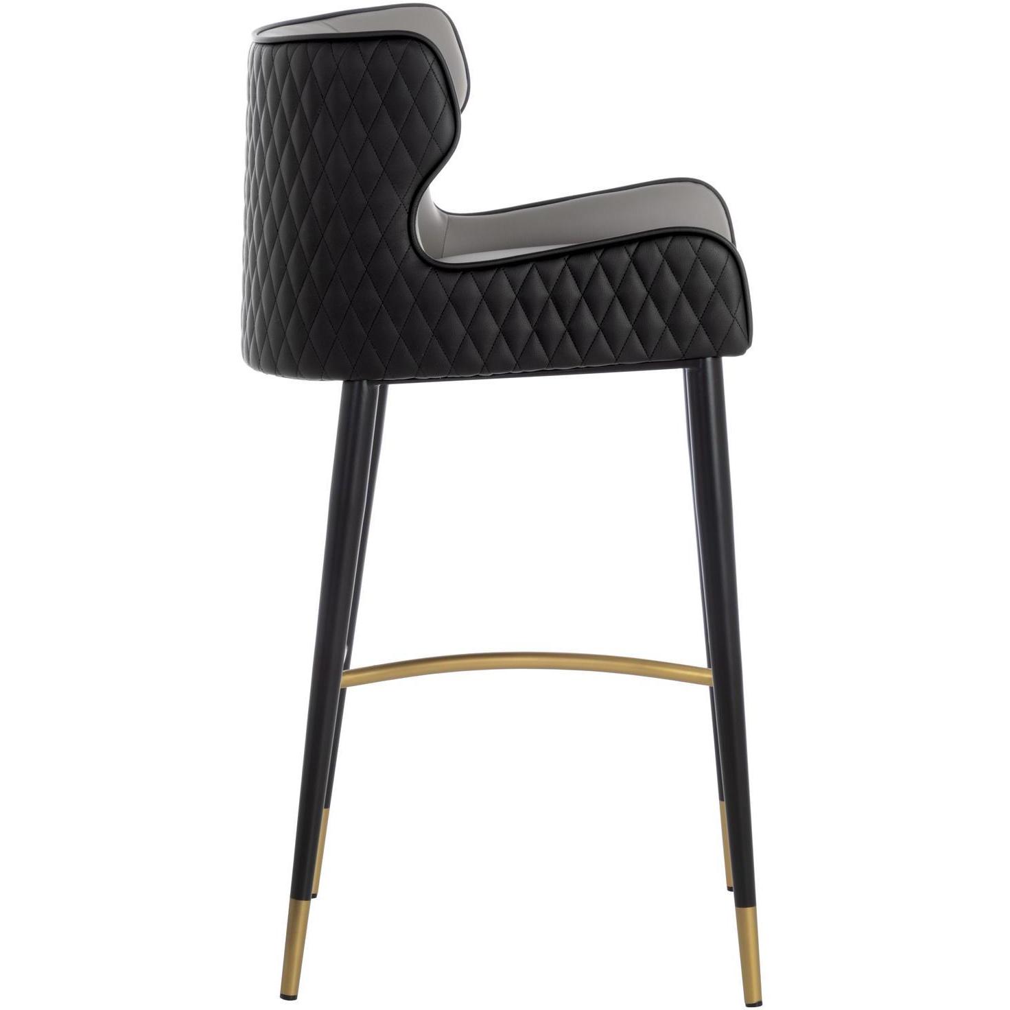 A classic barstool featuring a substantial seat upholstered in contrasting dillon stratus and black faux leather. Diamond stitching on the seatback adds a hint of elegance while black wood legs and brushed gold foot caps complete the look. Handle With Care: This design has been crafted with faux leather. Faux leather is manufactured to reflect the natural characteristics of leather; as such, colour variations, markings, wrinkles, grooves, and light scratches are appreciated characteristics. No two pieces will be alike. Visit our Product Care page for more information on how to ensure the lasting beauty of this piece.