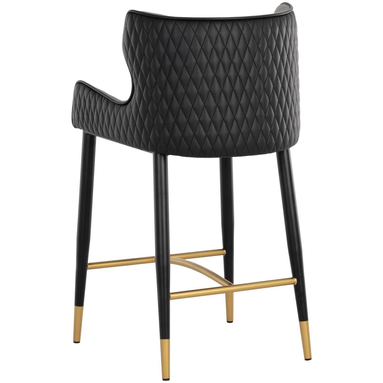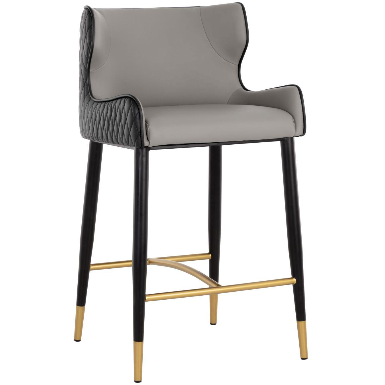 A classic counter stool featuring a substantial seat upholstered in contrasting dillon stratus and black faux leather. Diamond stitching on the seatback adds a hint of elegance while black wood legs and brushed gold foot caps complete the look. Handle With Care: This design has been crafted with faux leather. Faux leather is manufactured to reflect the natural characteristics of leather; as such, colour variations, markings, wrinkles, grooves, and light scratches are appreciated characteristics. No two pieces will be alike. Visit our Product Care page for more information on how to ensure the lasting beauty of this piece.