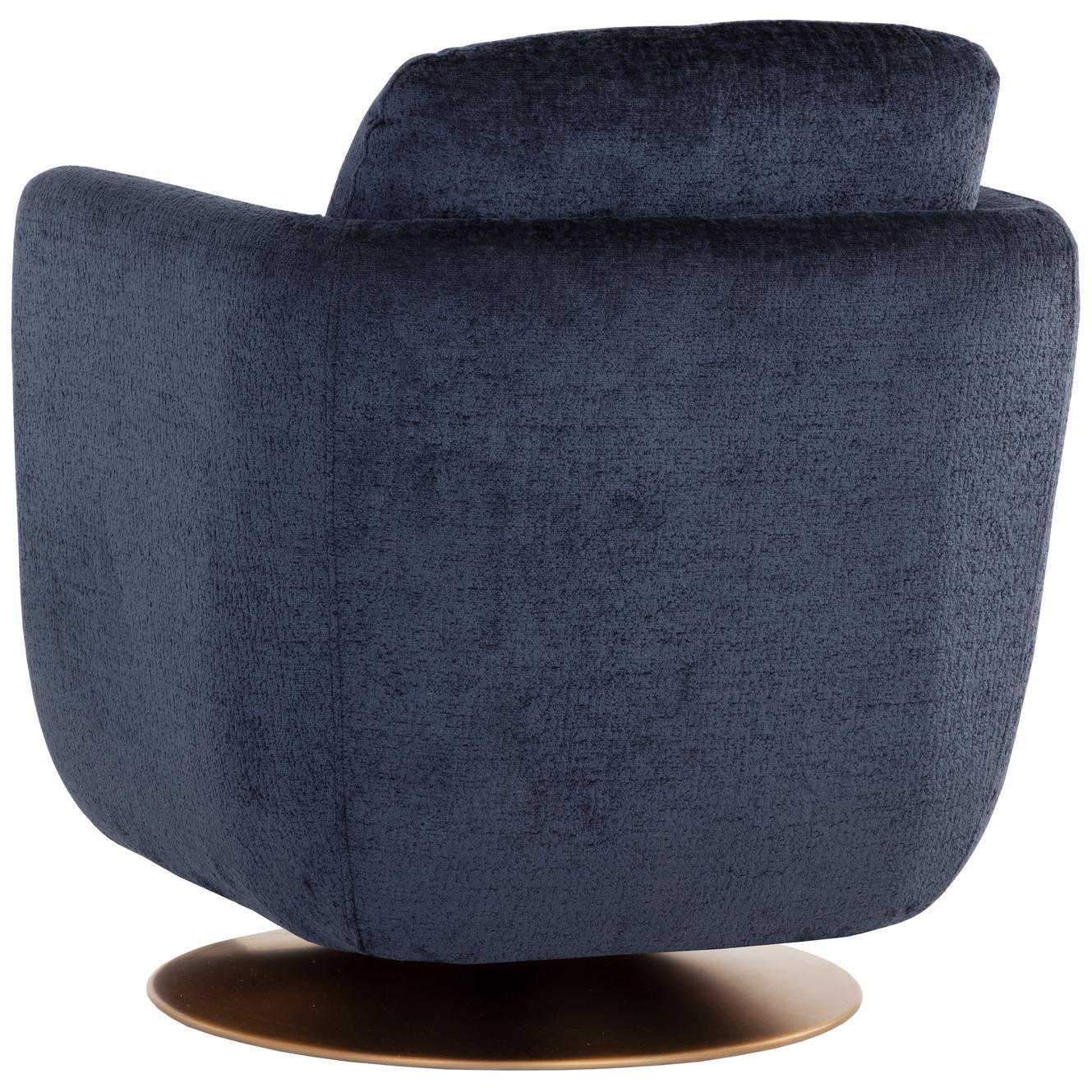 Add a compelling touch of contemporary style with this eye-catching swivel lounge chair. Stocked in bergen navy fabric and completed with a round, antique gold stainless steel base. Also available in meg ash fabric. Not available for sale in Canada.