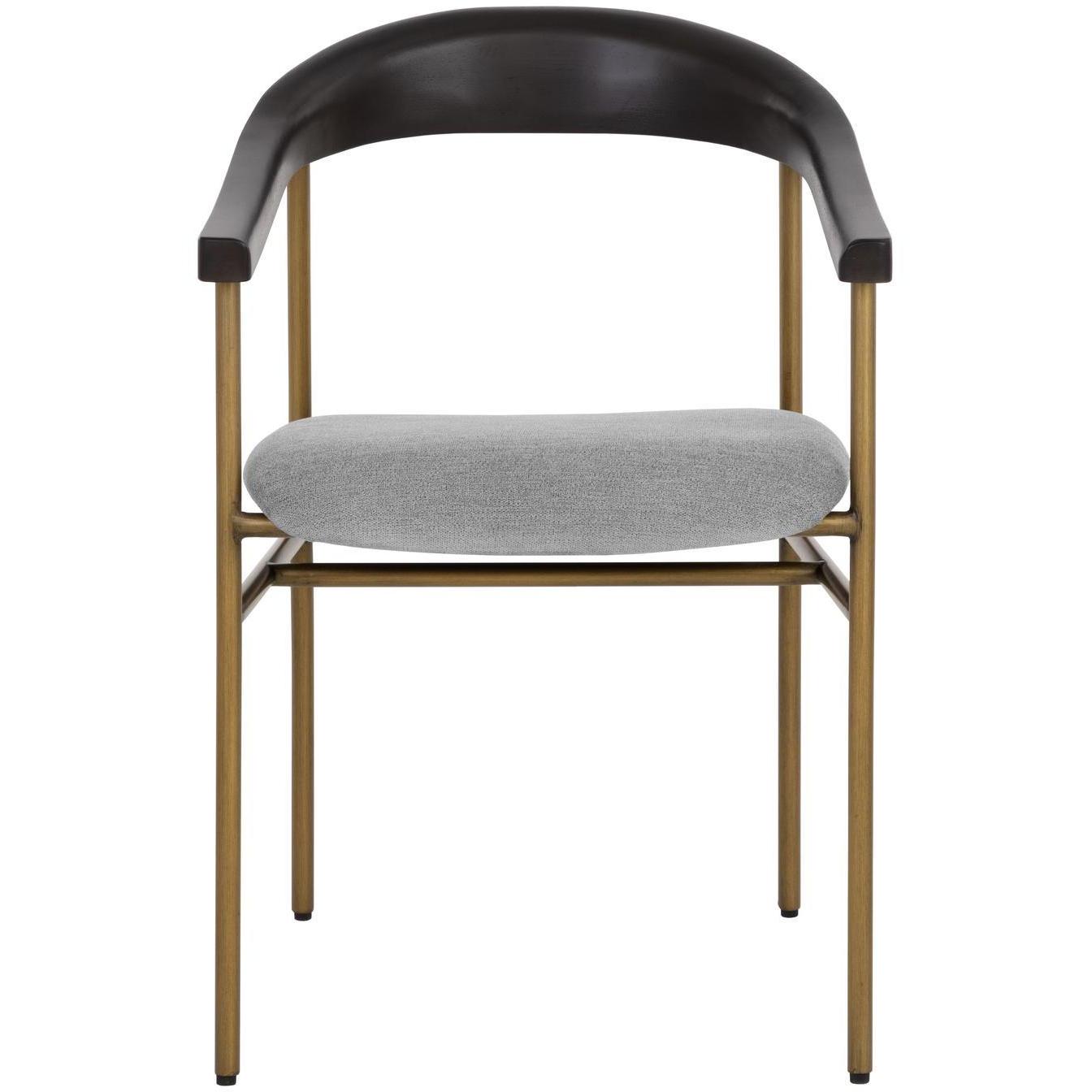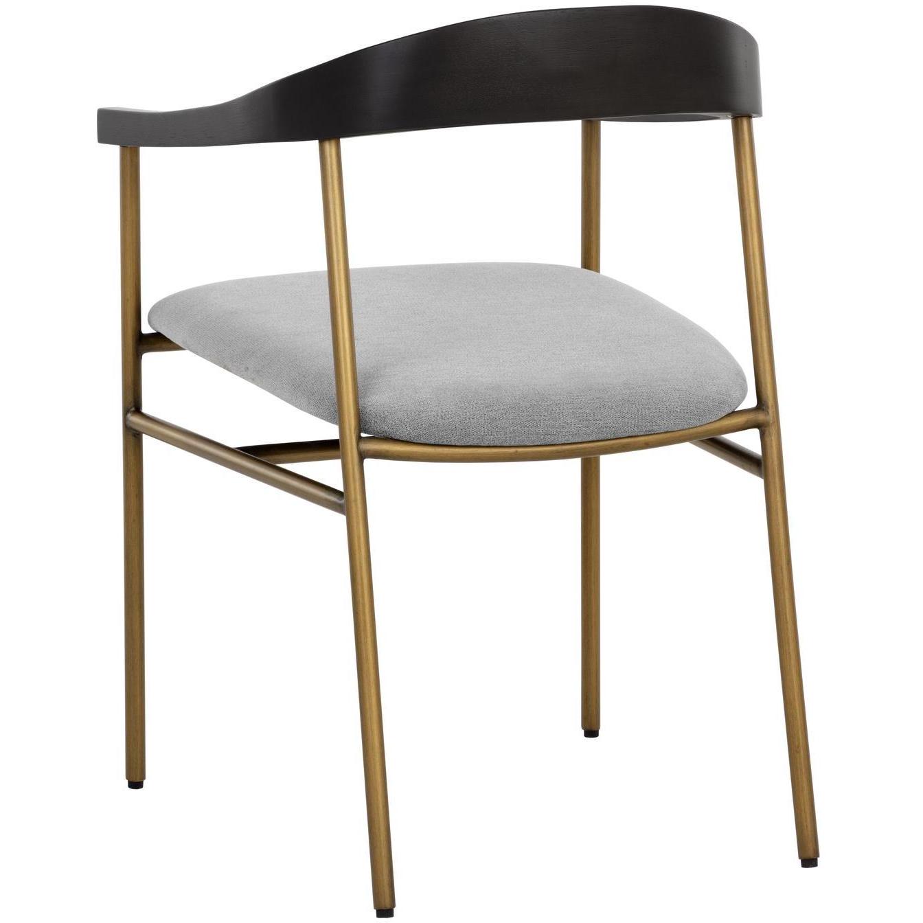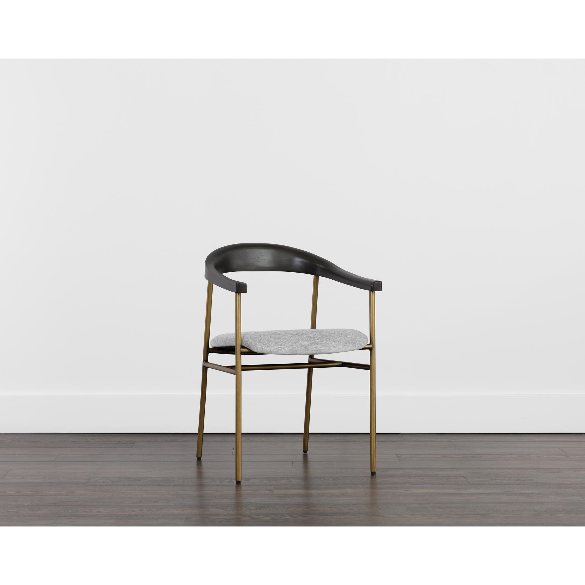 Taking inspiration from mid-century design, this dining armchair is infused with modern elements that result in a beautiful and simple style. Features a smoke grey rubberwood seatbact and an upholstered polo club stone performance fabric cushion. Completed with steels legs in an antique brass finish. Performance fabric is moisture repellent, durable and easy to clean. Suitable for various dining, kitchen and bar spaces of all sizes.