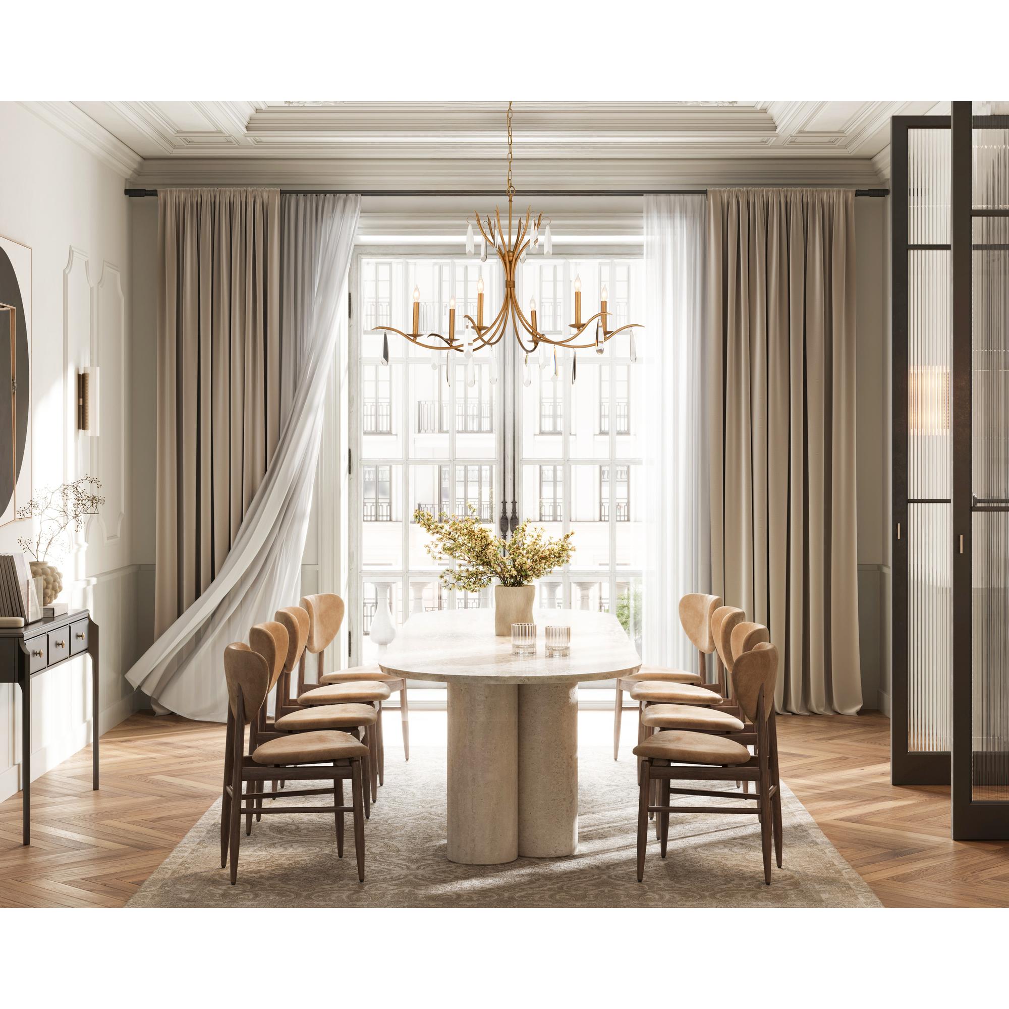 Crafted by Italian artisans, this elegantly tailored chandelier features six graceful swooping arms with candle lights and large drop crystals. The light shimmers off of the crystals for an enchanting effect. Comes with 77″ chain.