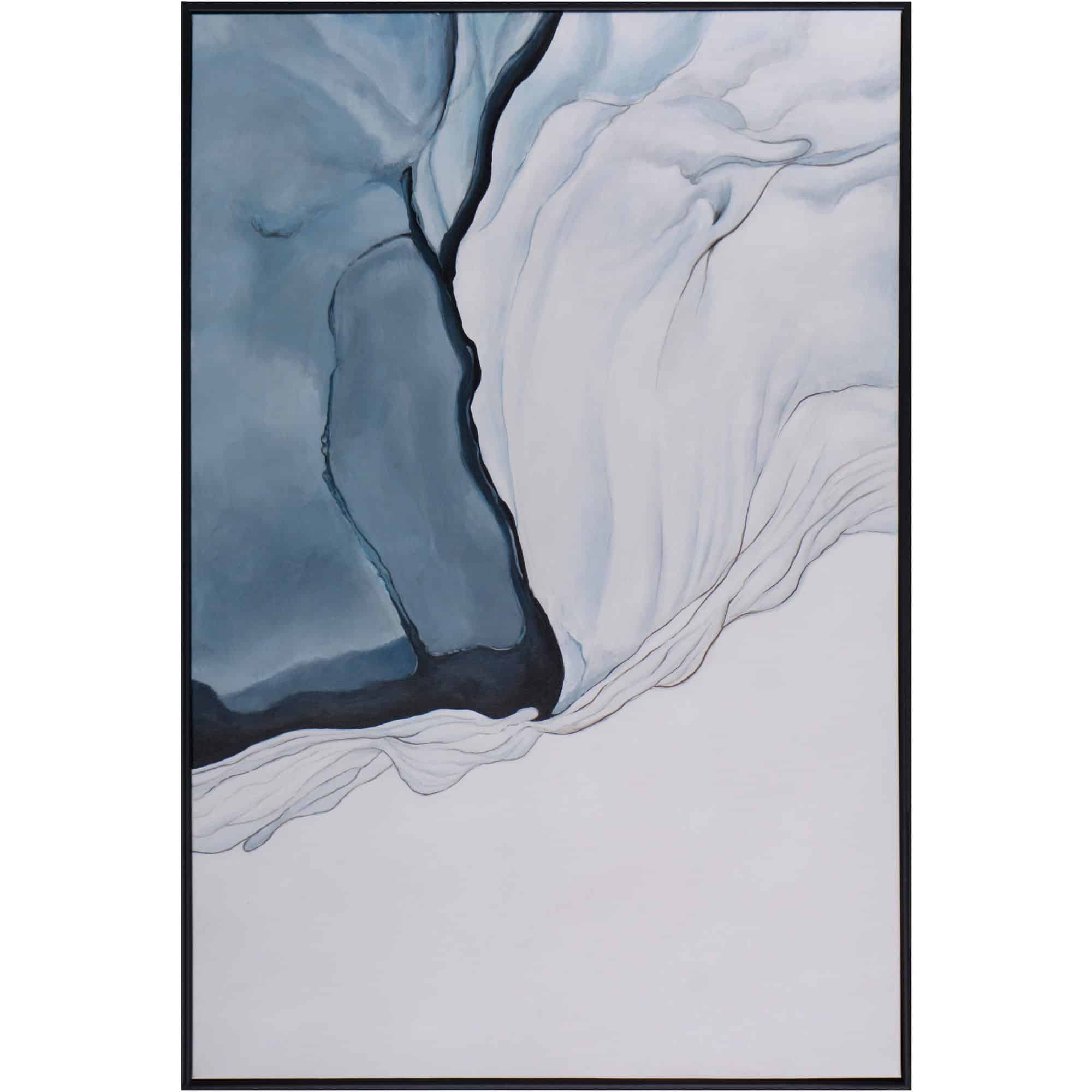 A refreshing, abstract painting filled with calming blue hues, evoking a quiet, glacial scene. Features a black finished wood floater frame. Each artwork is hand-painted and will feature slight variations that make every piece unique.