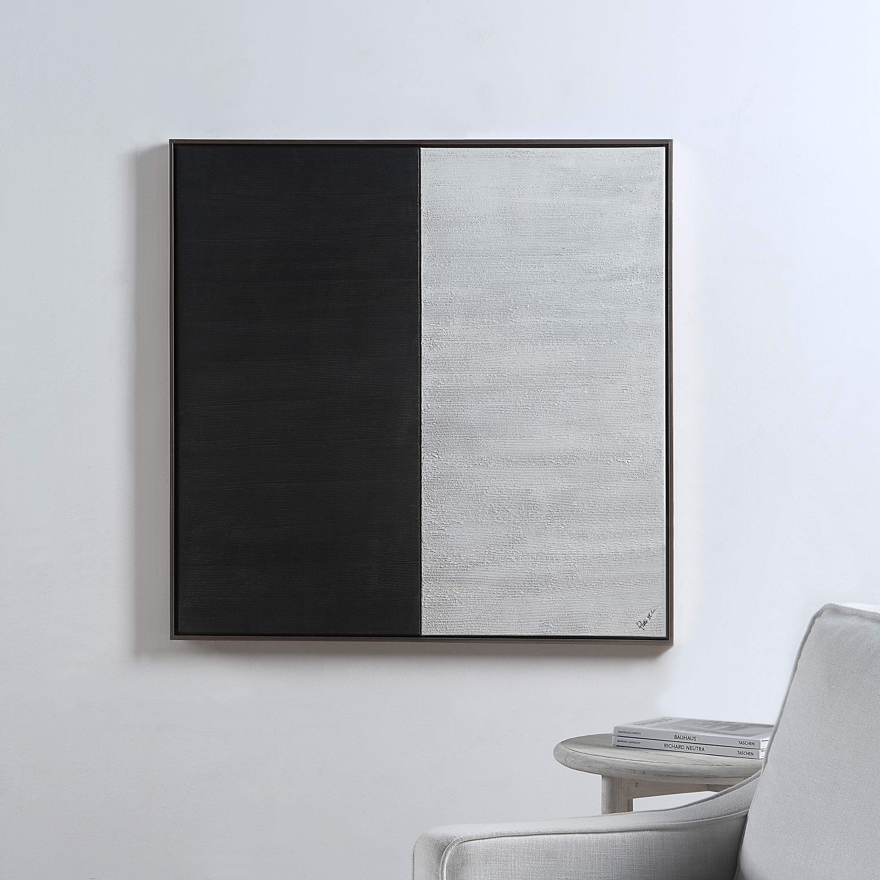 Duality takes center stage in this piece of canvas art. A simple yet impactful design of black and white tones, the framed canvas’ need no embellishment to become a focal point in clients’ contemporary and modern spaces. Depending on the wall color behind, white, vibrant-colored or neutral-hued, this art painting can take on a whole new appeal and influence.