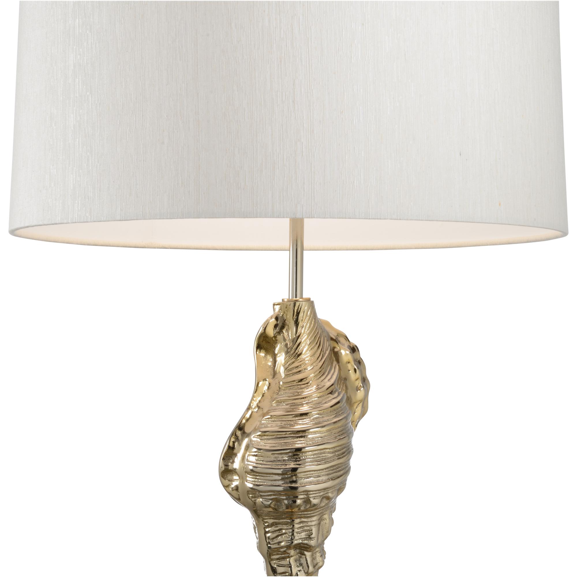Inspired by the exquisite conch shells along the coast of the outer banks, gold shell wishes lamp creates a sophisticated beach vibe in your space. Light reflecting off of the warm polished brass finish elegantly highlights the beautiful textural details of the shell. A cream, raw silk shade complements the chic design perfect an entryway, bedroom or living area in your coastal home.