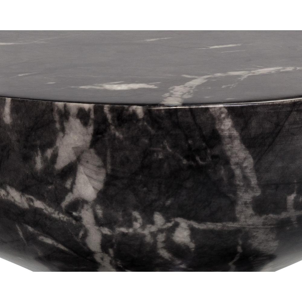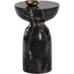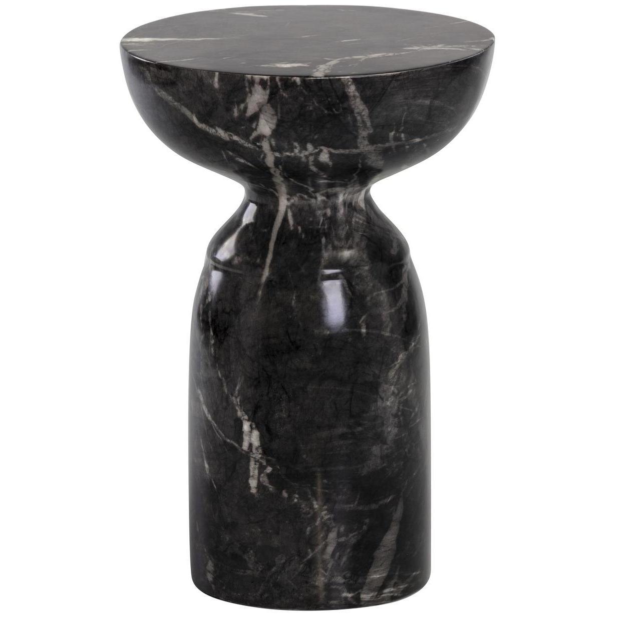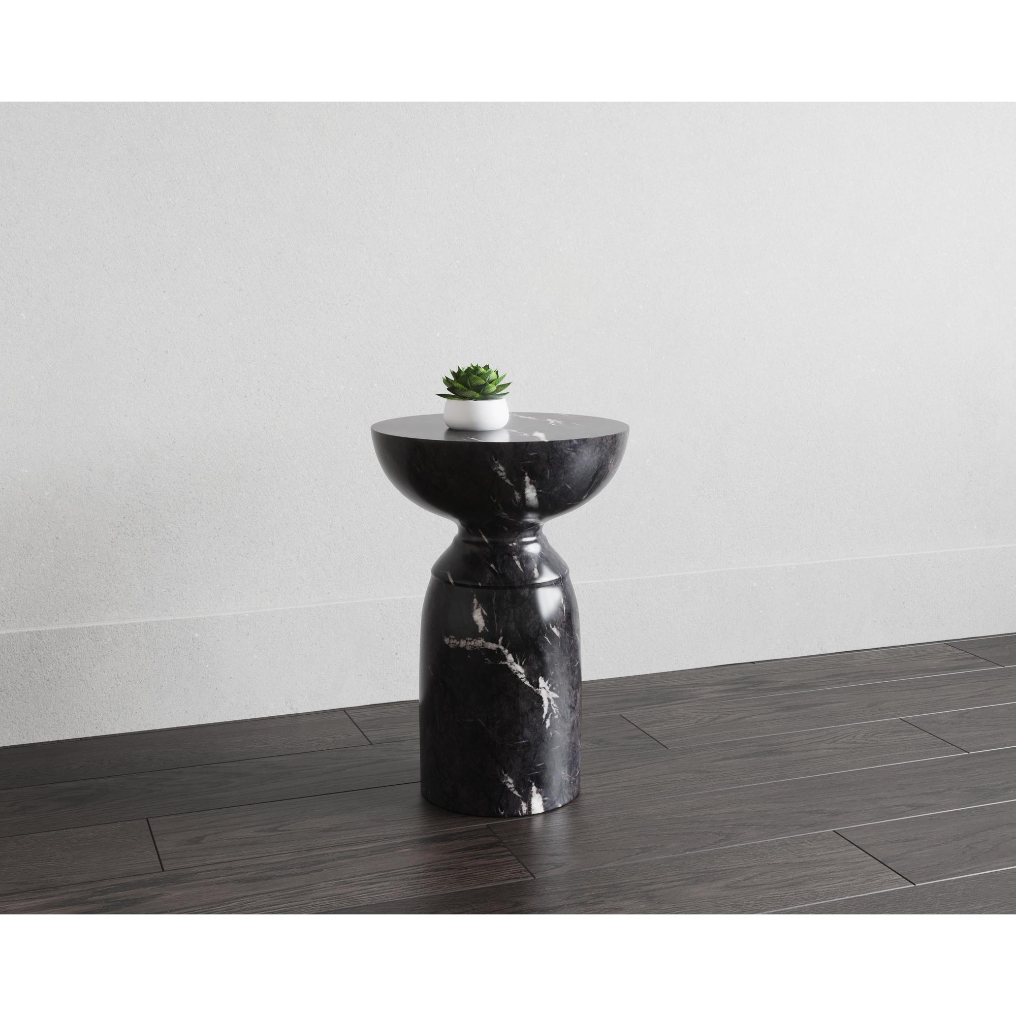 A compact and gracefully sculpted end table. Made with a black marble look finish. This versatile and attractive piece is