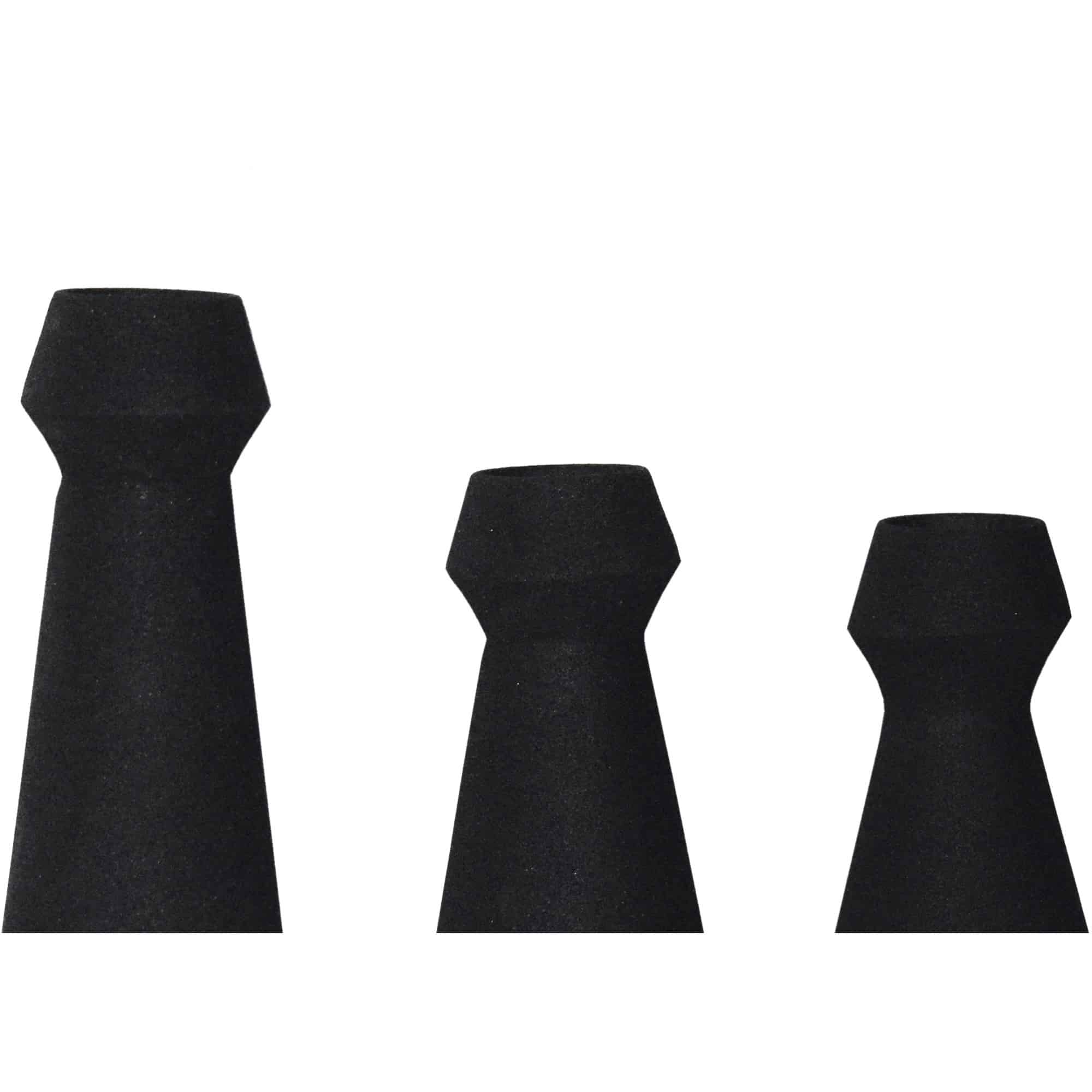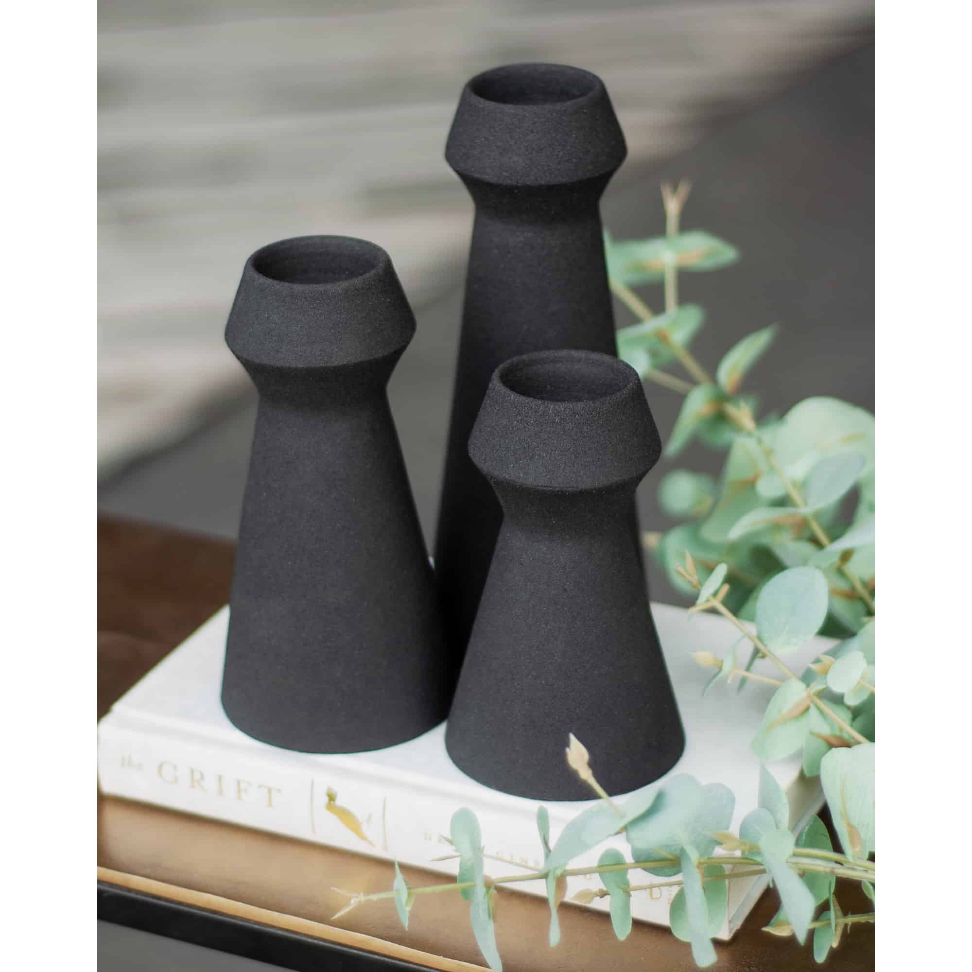 Modern art influences take the spotlight in this unique set of three vases. Place them anywhere to bring dimension and a design influence into the space. Each powder-coated iron, textured matte black piece varies slightly in height, providing endless styling opportunities.