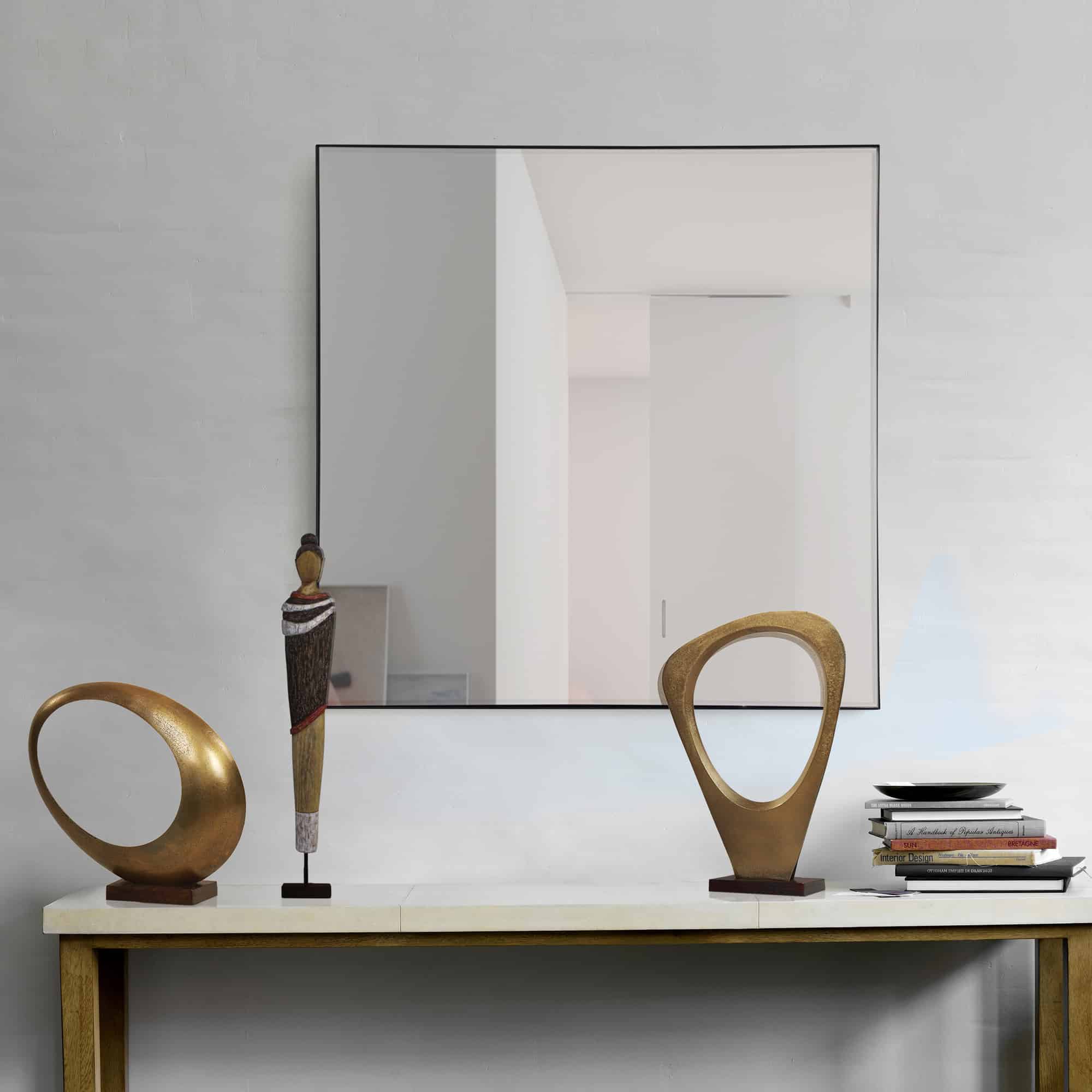 The understated design of this decorative wall mirror exudes classic cool. The thin profile of the iron frame features a black finish that fits beautifully on feature walls in formal and casual rooms. The streamlined style of the square mirror is an instant standout among modern fixtures and furnishings.