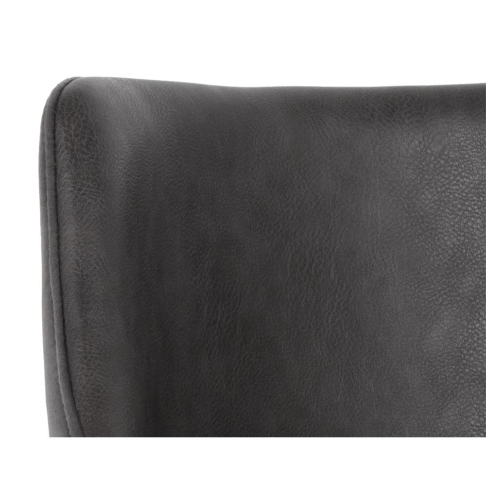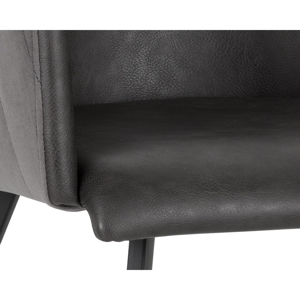This modern dining armchair will provide comfort and style to any residential or commercial space. Features an interior seat in town grey faux leather and contrasting channel stitched exterior seatback in roman grey fabric. Finished with sturdy black powder-coated iron legs. Handle With Care: This design has been crafted with faux leather. Faux leather is manufactured to reflect the natural characteristics of leather; as such, colour variations, markings, wrinkles, grooves, and light scratches are appreciated characteristics. No two pieces will be alike. Visit our Product Care page for more information on how to ensure the lasting beauty of this piece.
