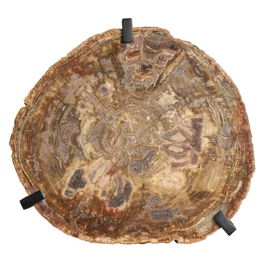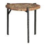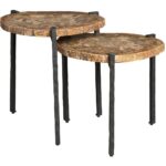 The Griffith Park Bunching Tables are a captivating duo that combines the beauty of natural stone with the strength of metal. The petrified wood stone tops, with their unique textures and colors, contrast dramatically with the sturdy cast iron bases. This dynamic pairing creates a striking visual statement, perfect for any living room or entryway.