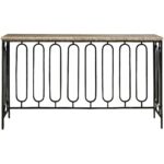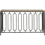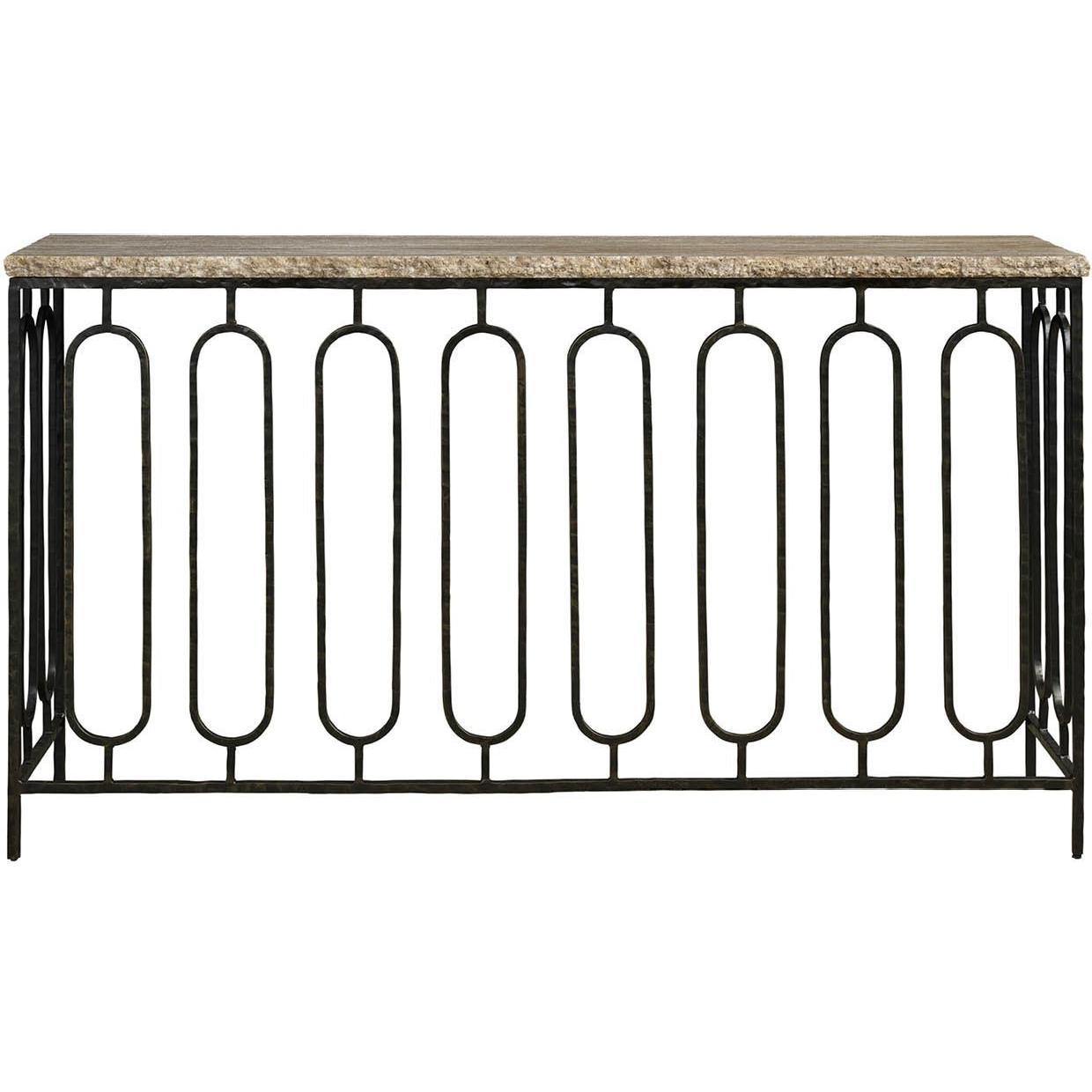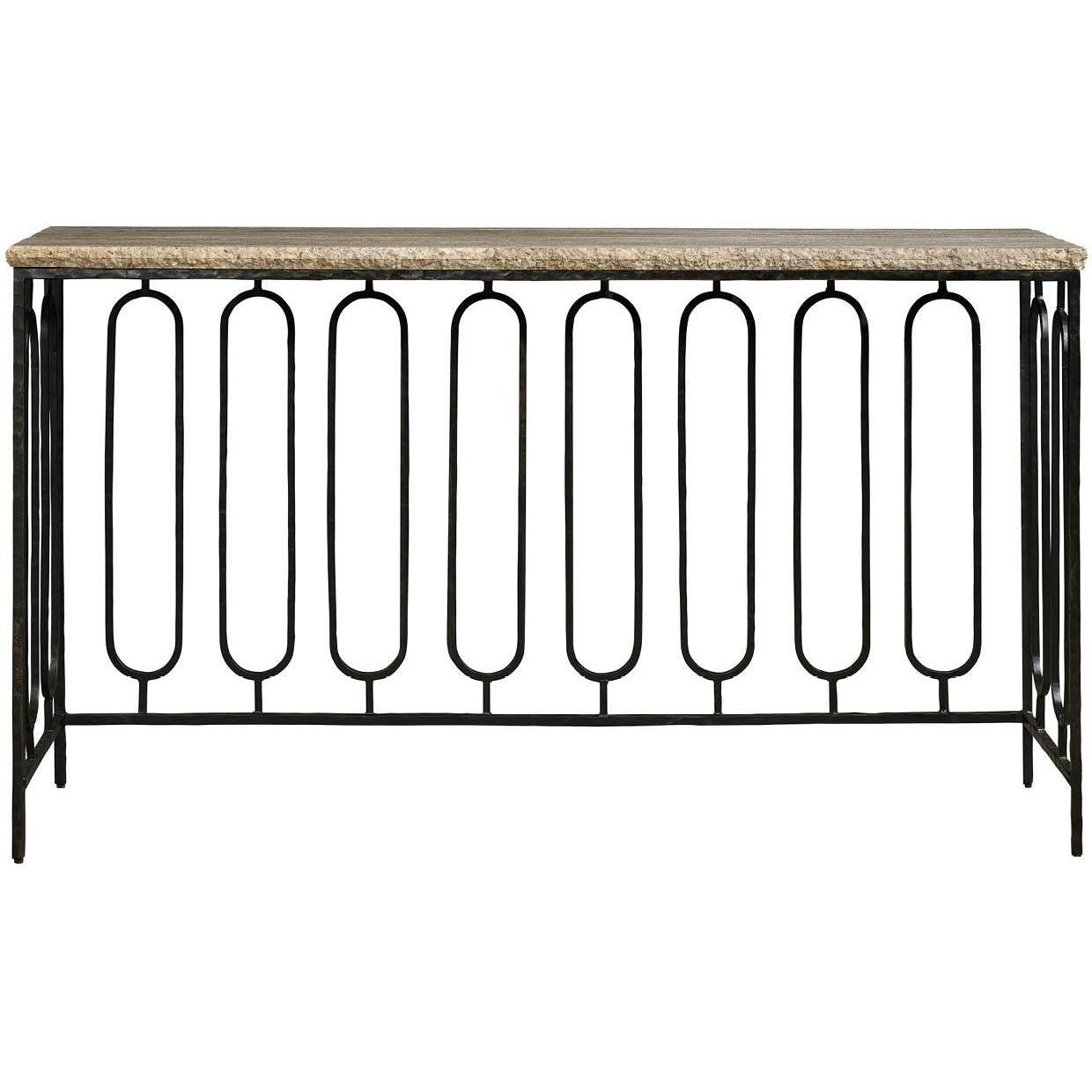 The Griffith Park Console is a stunning blend of natural and industrial elements. Its slender Gray Tavertine stone top, with its subtly chipped edges, contrasts elegantly with the intricate, oval-shaped, oil-rubbed bronze metal base. This captivating piece is a true work of art, sure to be a focal point in any room.