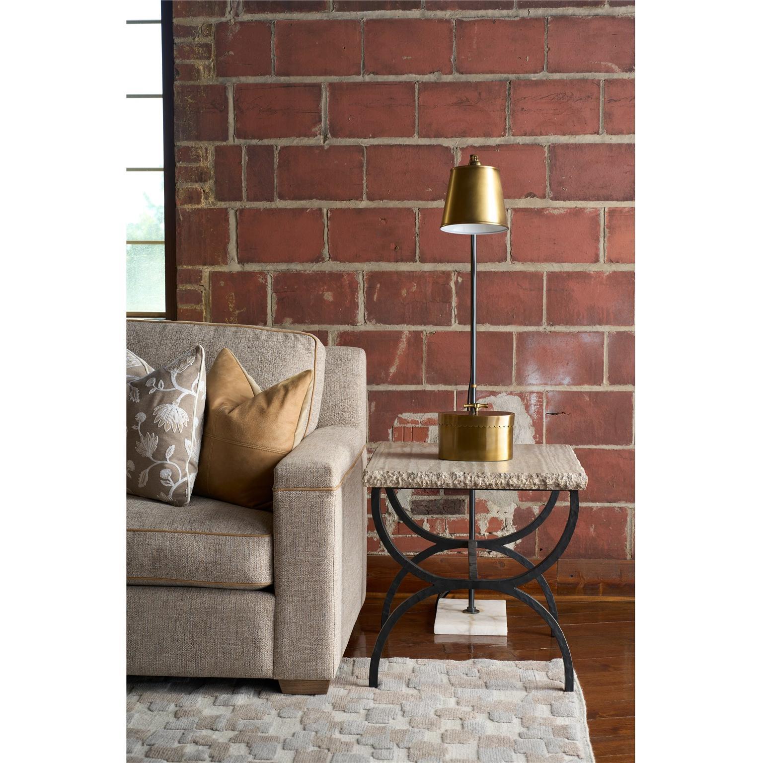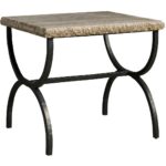 The Griffith Park End Table is a striking blend of natural and industrial elements. Its Gray Tavertine stone top, with its subtly chipped edges, adds a touch of rustic charm. The base, an elegant hourglass shape crafted from oil-rubbed bronze metal, creates a sophisticated and modern look.