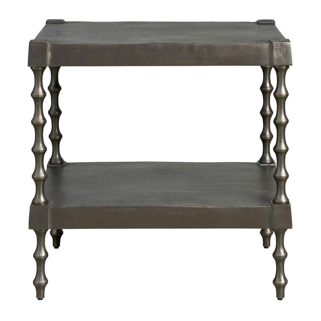 The Griffith Park Side Table is a remarkable blend of form and function. Its distinctive Graphite Brass finish and elegant, curved supports create a sophisticated and modern look. The two open air shelves offer ample storage space for books, magazines, or decorative objects.
