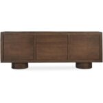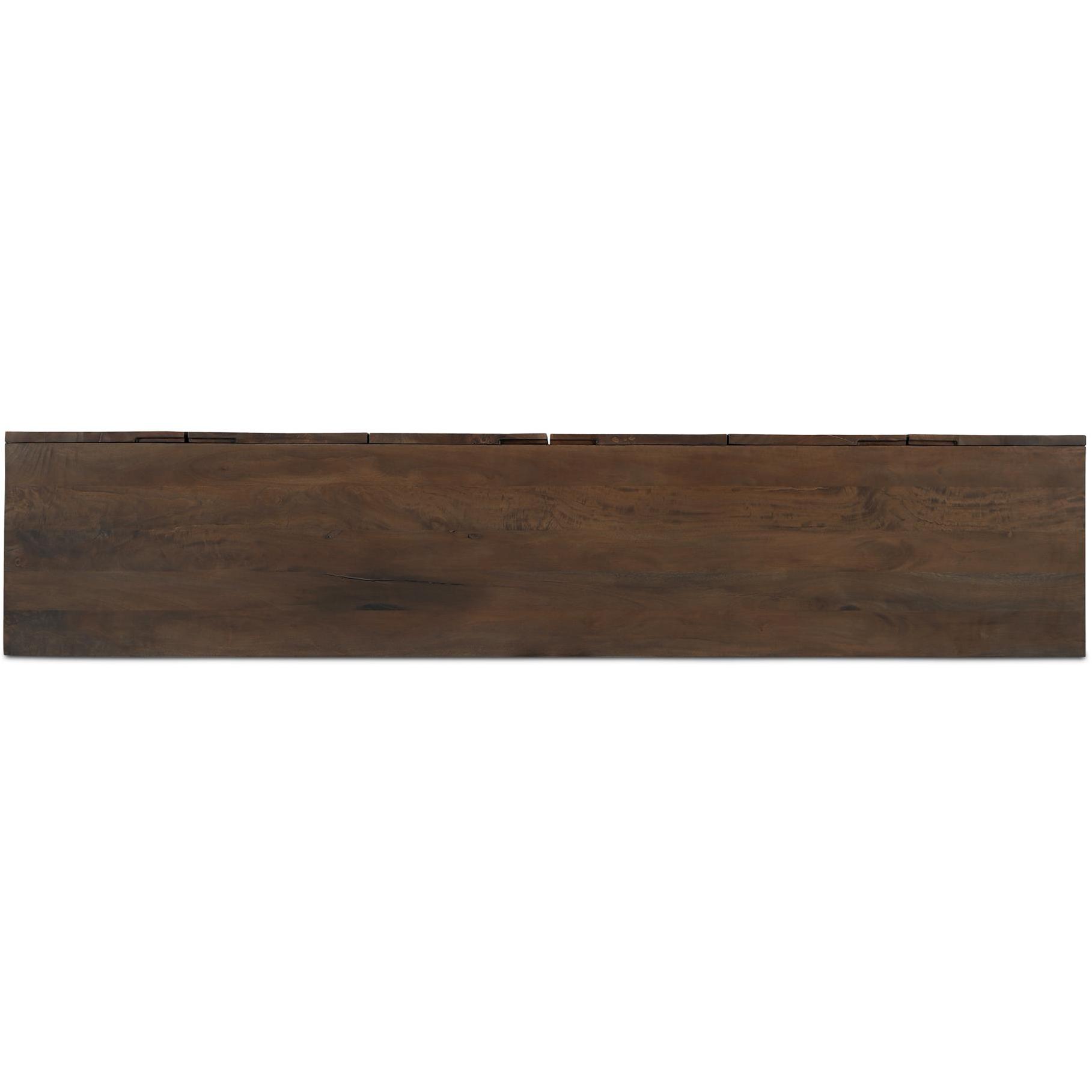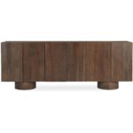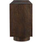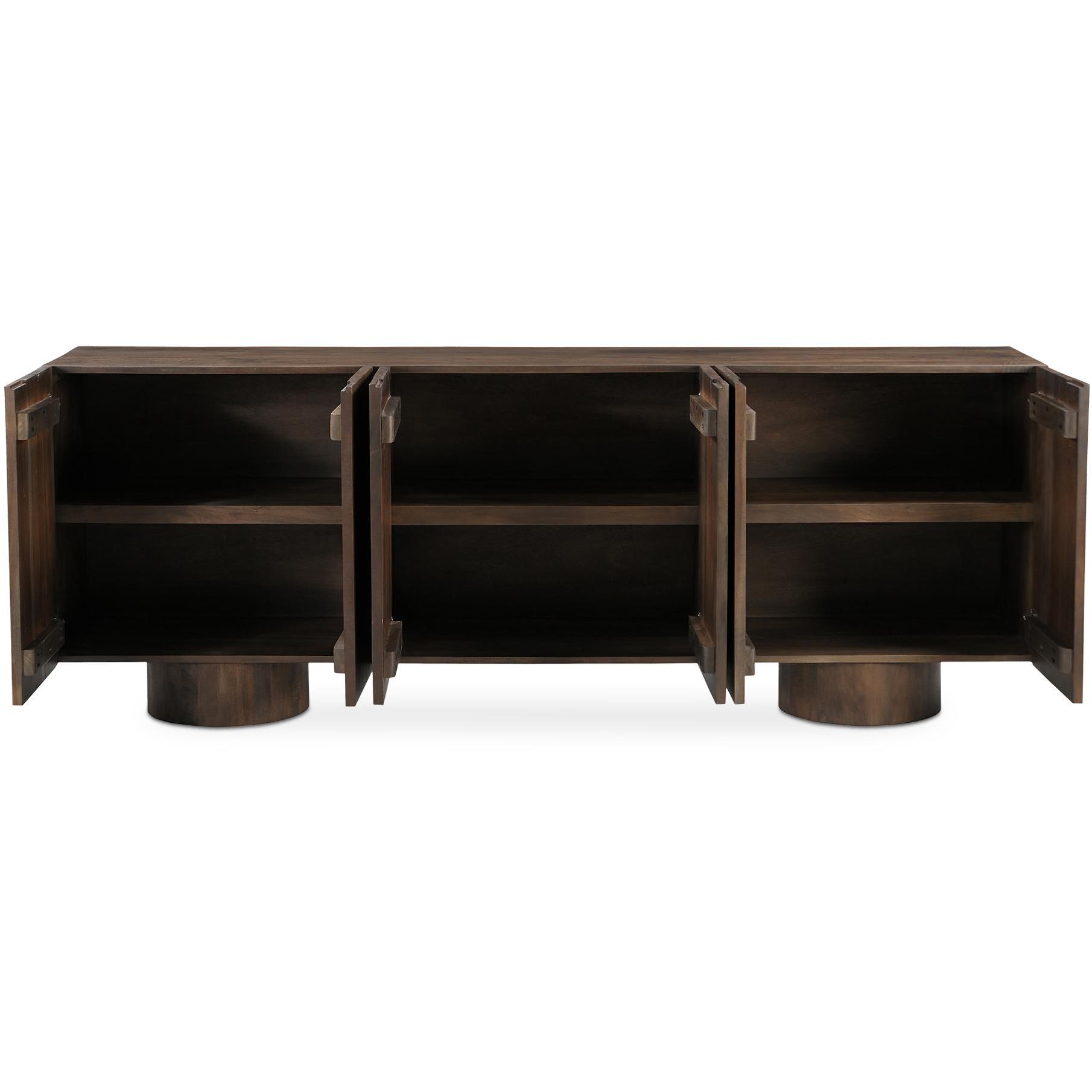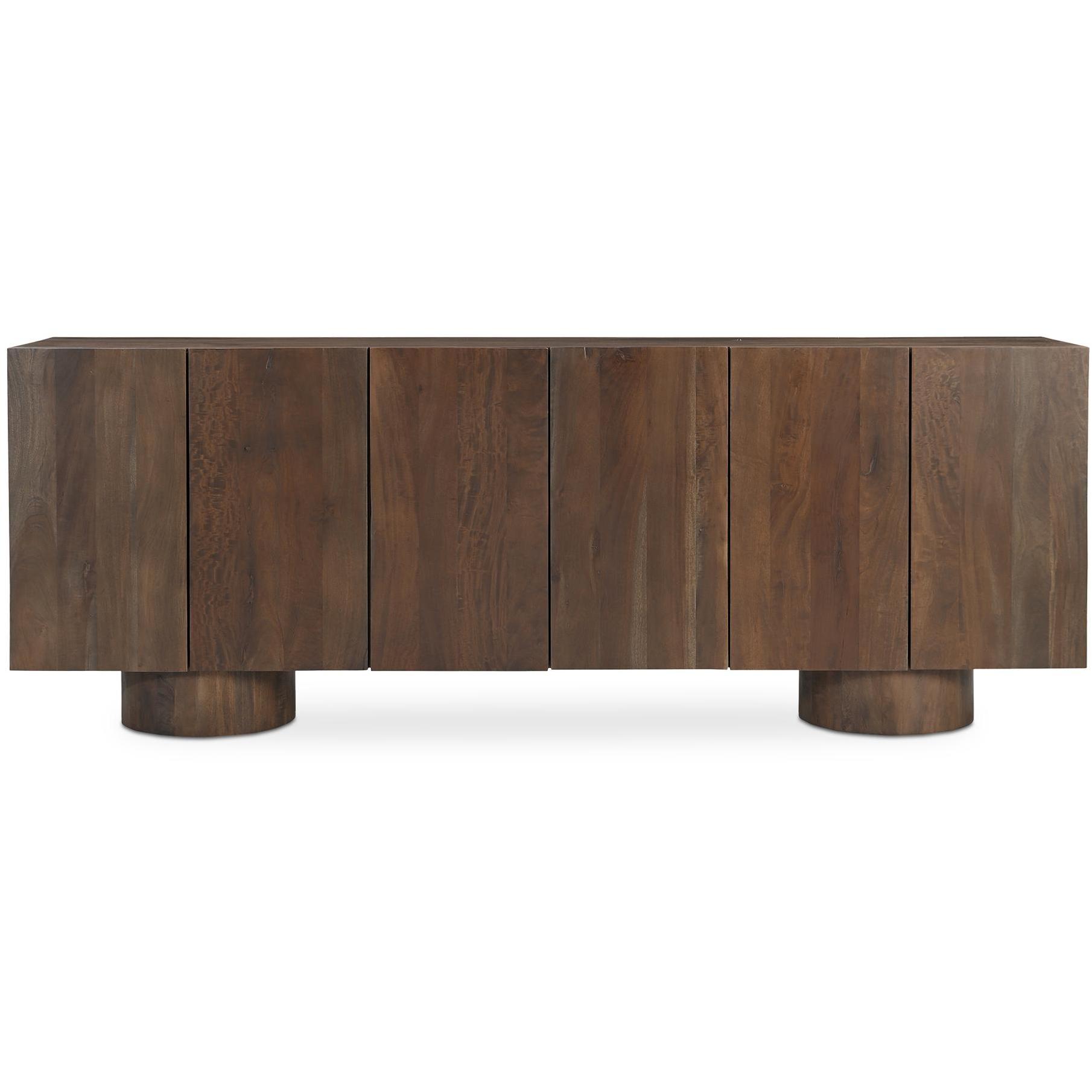 Crafted from reclaimed neem wood, the Hadley sideboard top rests on robust cylindrical bases, grounding the piece with quiet confidence. Six generous doors featuring integrated handles reveal ample storage, while its warm hue and natural wood variations create a uniquely inviting ambiance.