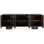 - Six substantial doors open to three shelves. Holes for media cables with swivel chips at the back of the sideboard