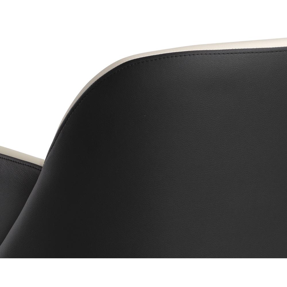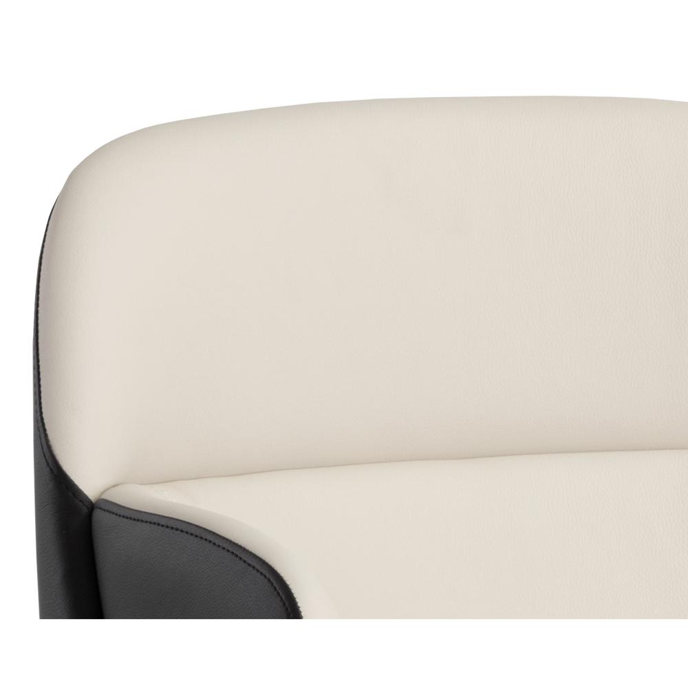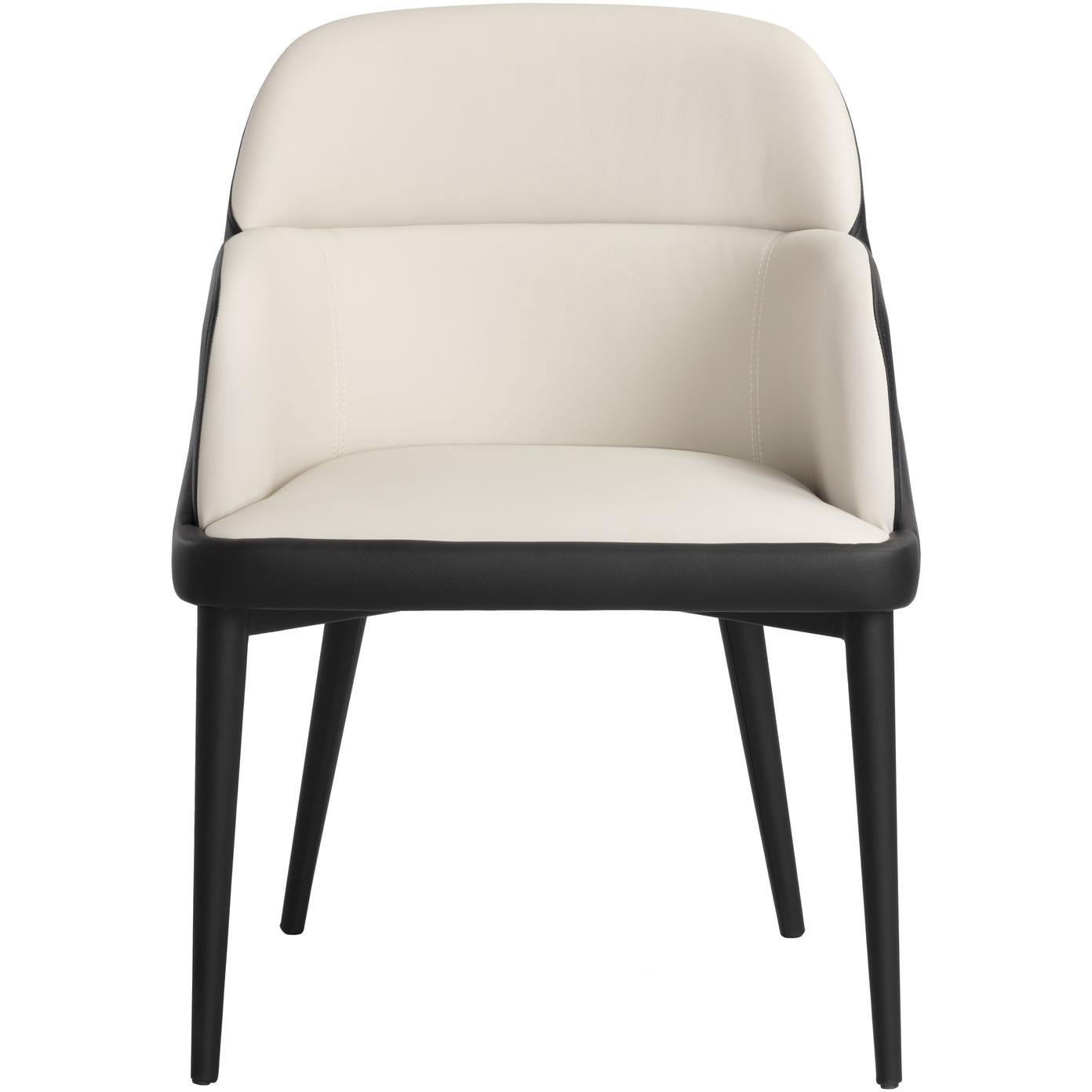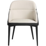 A futuristic dining armchair featuring a modular inspired seat, upholstered in contrasting dillon cream and dillon black faux leather. Handle With Care: This design has been crafted with faux leather. Faux leather is manufactured to reflect the natural characteristics of leather; as such, colour variations, markings, wrinkles, grooves, and light scratches are appreciated characteristics. No two pieces will be alike. Visit our Product Care page for more information on how to ensure the lasting beauty of this piece.