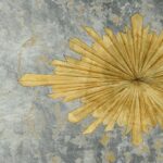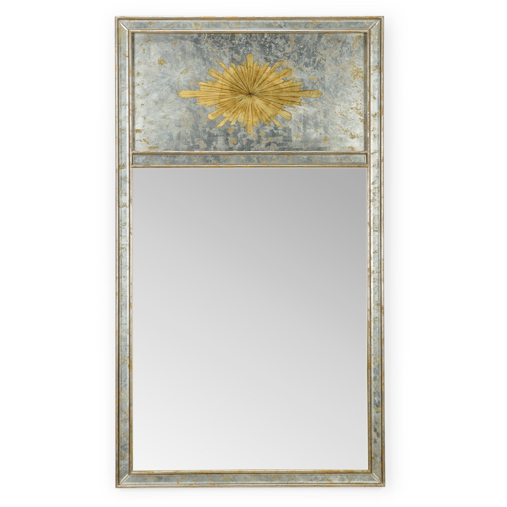 Clear mirror framed in antique silver leaf wood with gold medallion, designed by Jamie Merida.
