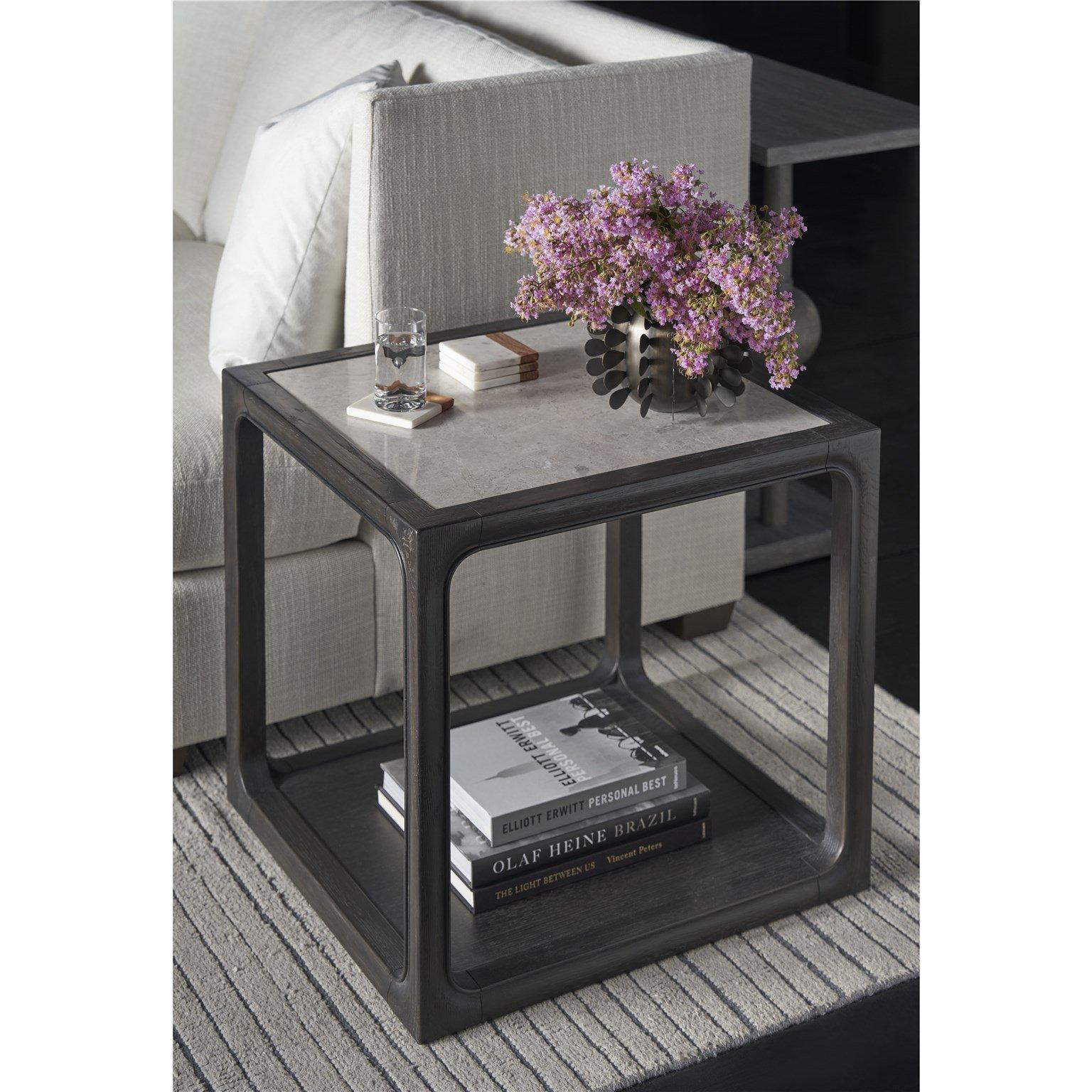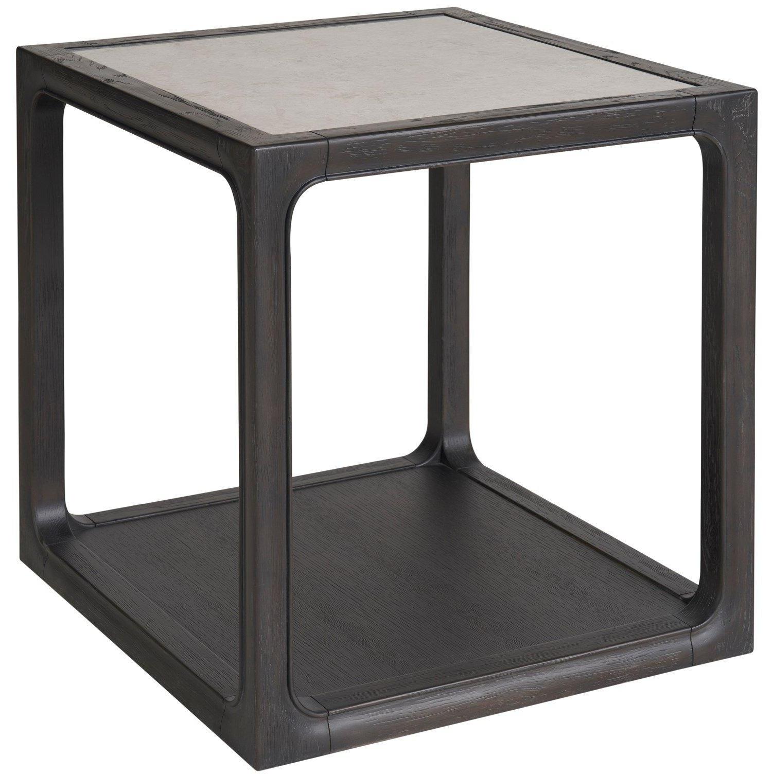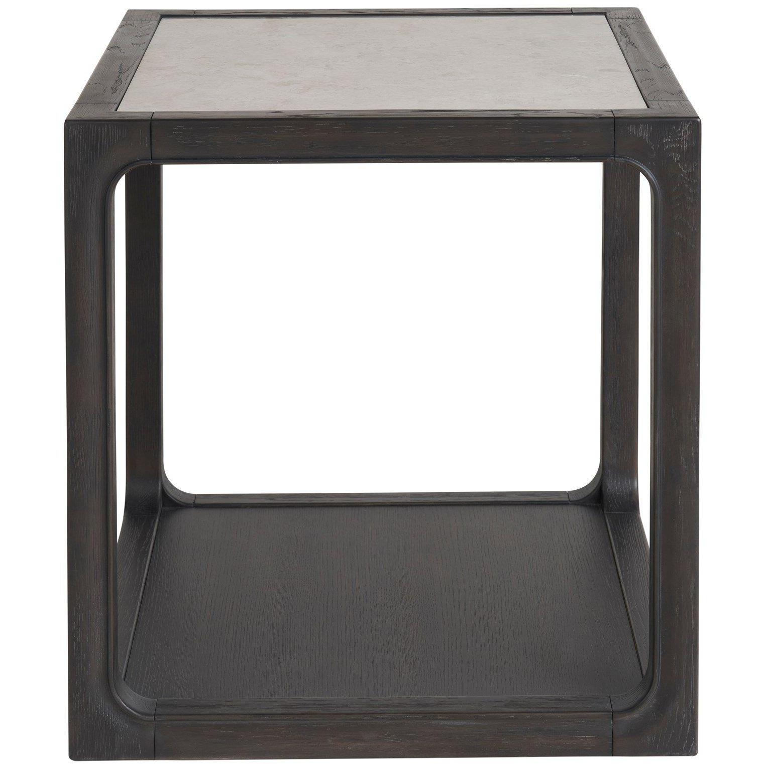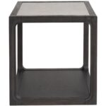 The Halen End Table exudes chic elegance with its slender, square form finished in the sophisticated Ravenwood hue, enhanced by an inset stone top that lends a polished and contemporary air to its sleek design.