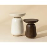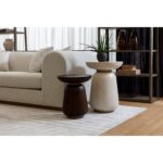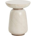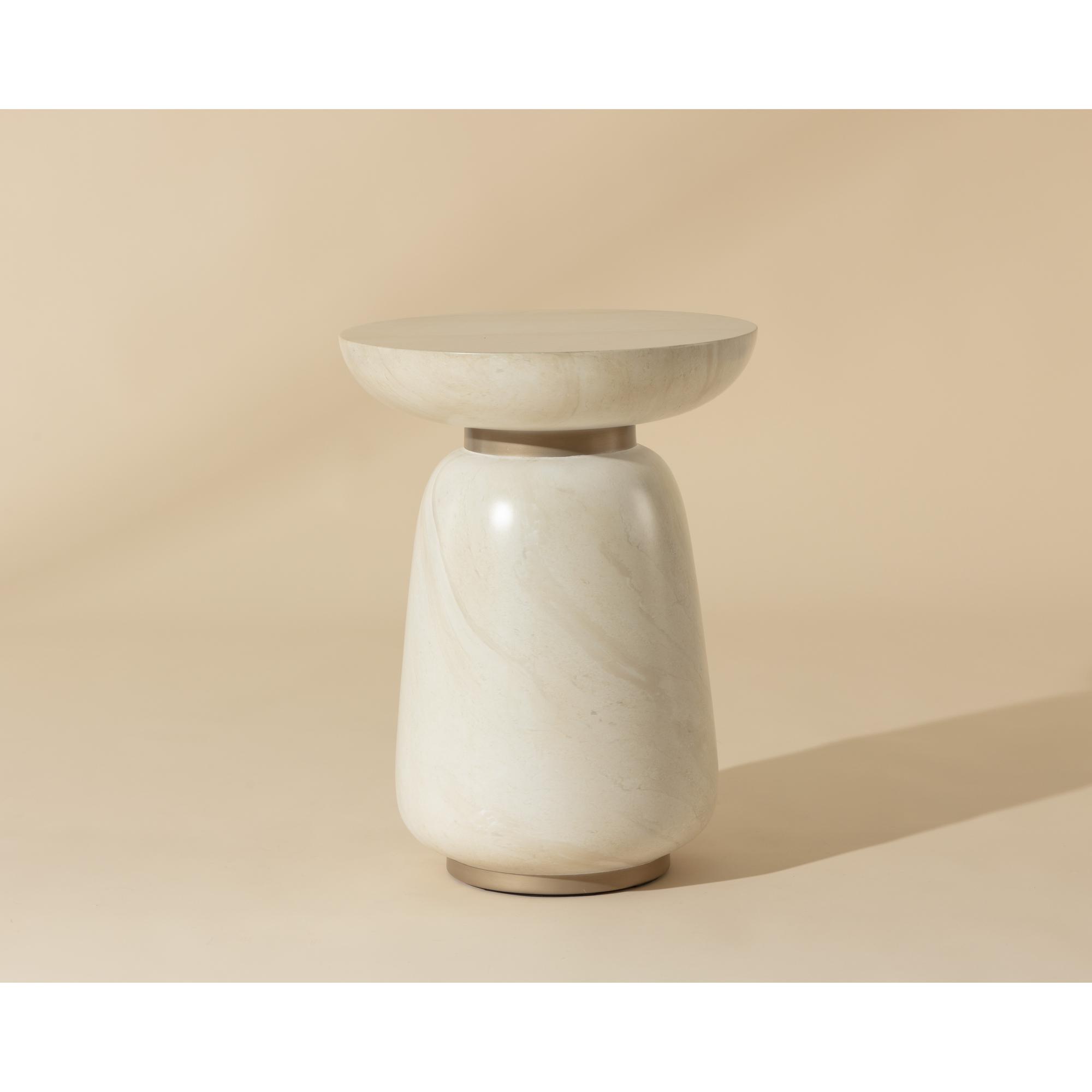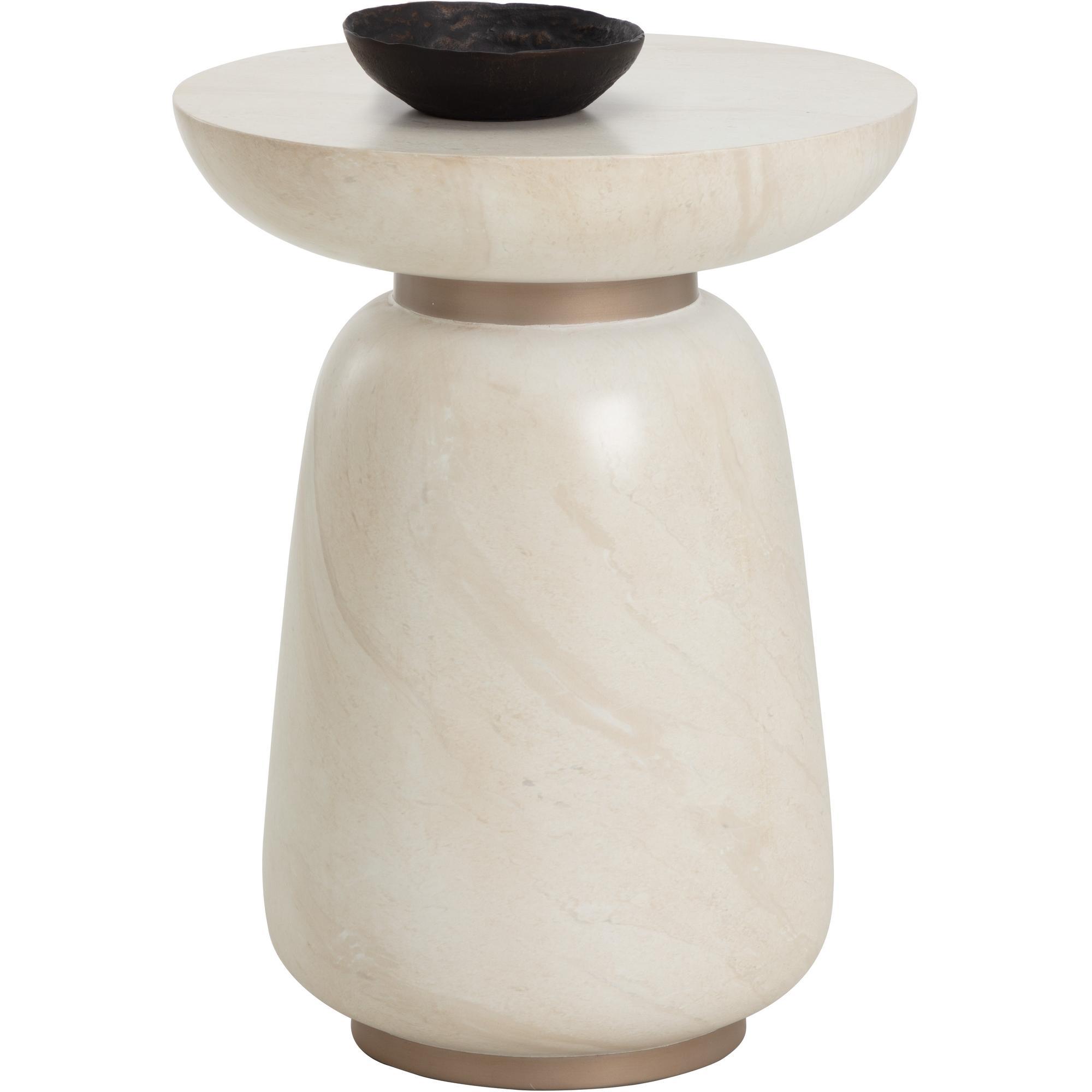 A fresh take on contemporary silhouettes, the Hali End Table pays homage to the natural beauty of travertine with the outdoor resilience of concrete. Each piece is carefully crafted from concrete that is finished with an intricate water transfer technique that recreates the unique veining and subtle variations found in natural travertine. Cinched with a decorative band that is hand-painted to resemble an antique brass metal finish that matches the base.
