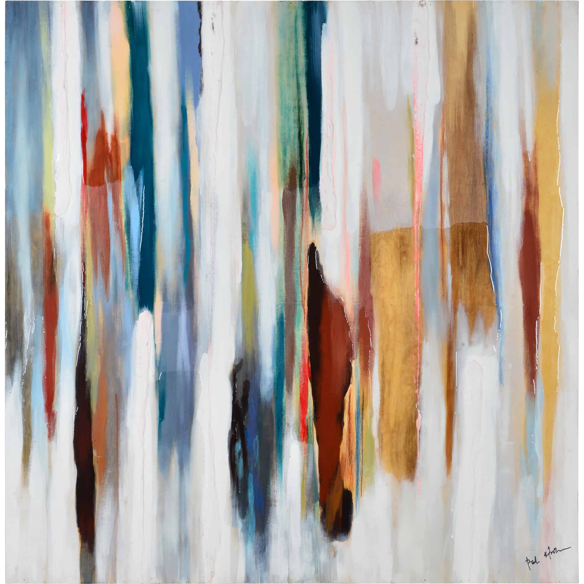Expressionist gestures take on exuberant tones in this colorfully contemporary wall decoration. The interpretive composition on composite wood elevates the abstract art form, as hand-painted strokes of red, blue, brown and green converse with splashes of white. The textural drama is heightened by gel accents and a glossy finish that give this modern art piece a lingering luster.