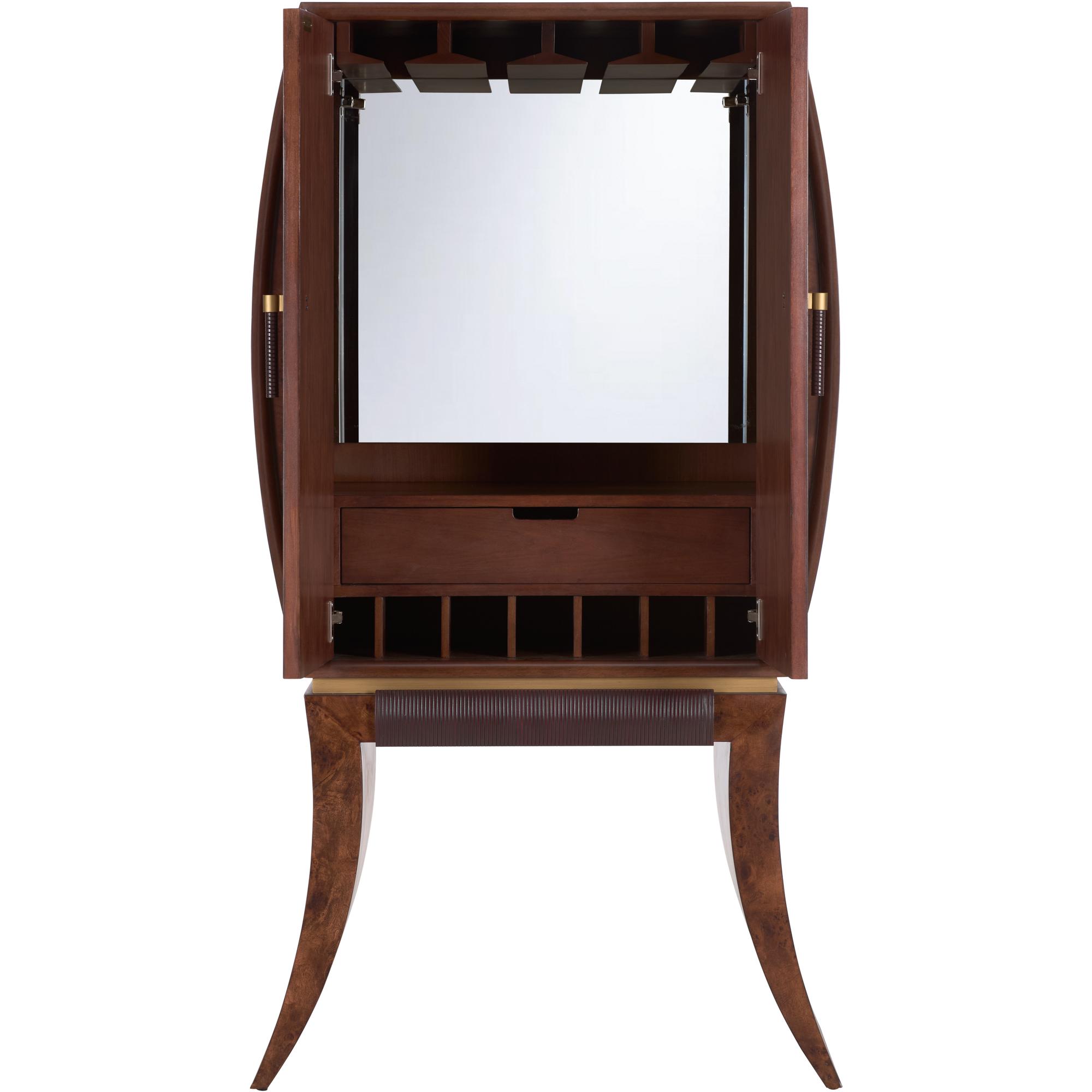 The Harvey Bar Cabinet is a striking blend of Art Deco elegance and modern sophistication. Crafted with luxurious mappa burl veneer, its curved silhouette and rich wood grain exude timeless charm. Inside, a mirrored back panel enhances the display, while dedicated compartments offer ample storage for glassware and spirits.