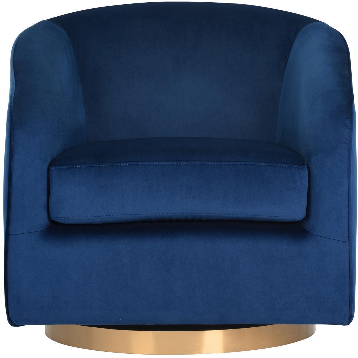 A stylish and comfortable swivel chair perfect for living, lounge and office spaces. Features a barrel back design upholstered in blush, burgundy, deep green, black and navy sky velvet fabric. A brushed antique brass round base with 360 degree swivel completes the design. Not available for sale in Canada.