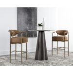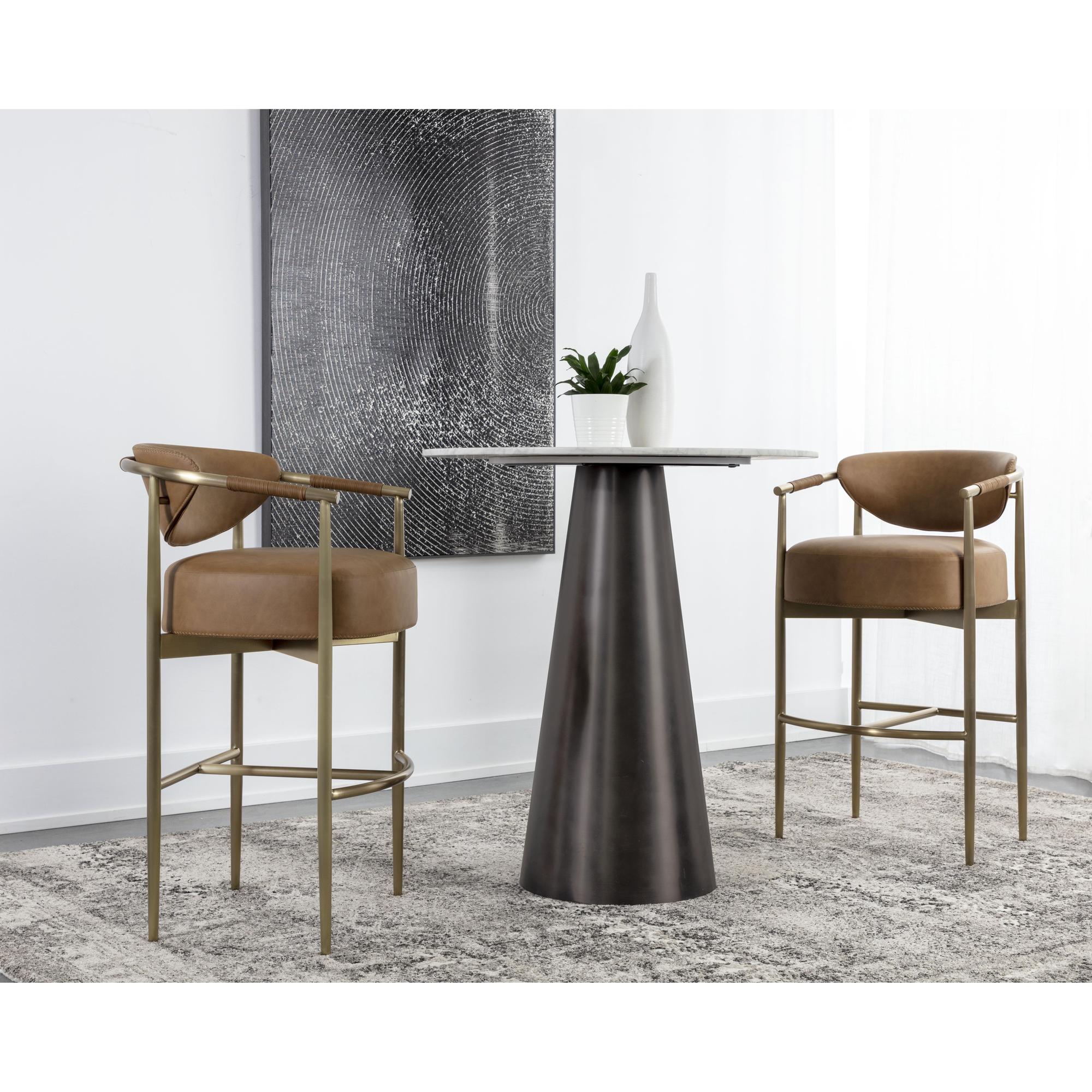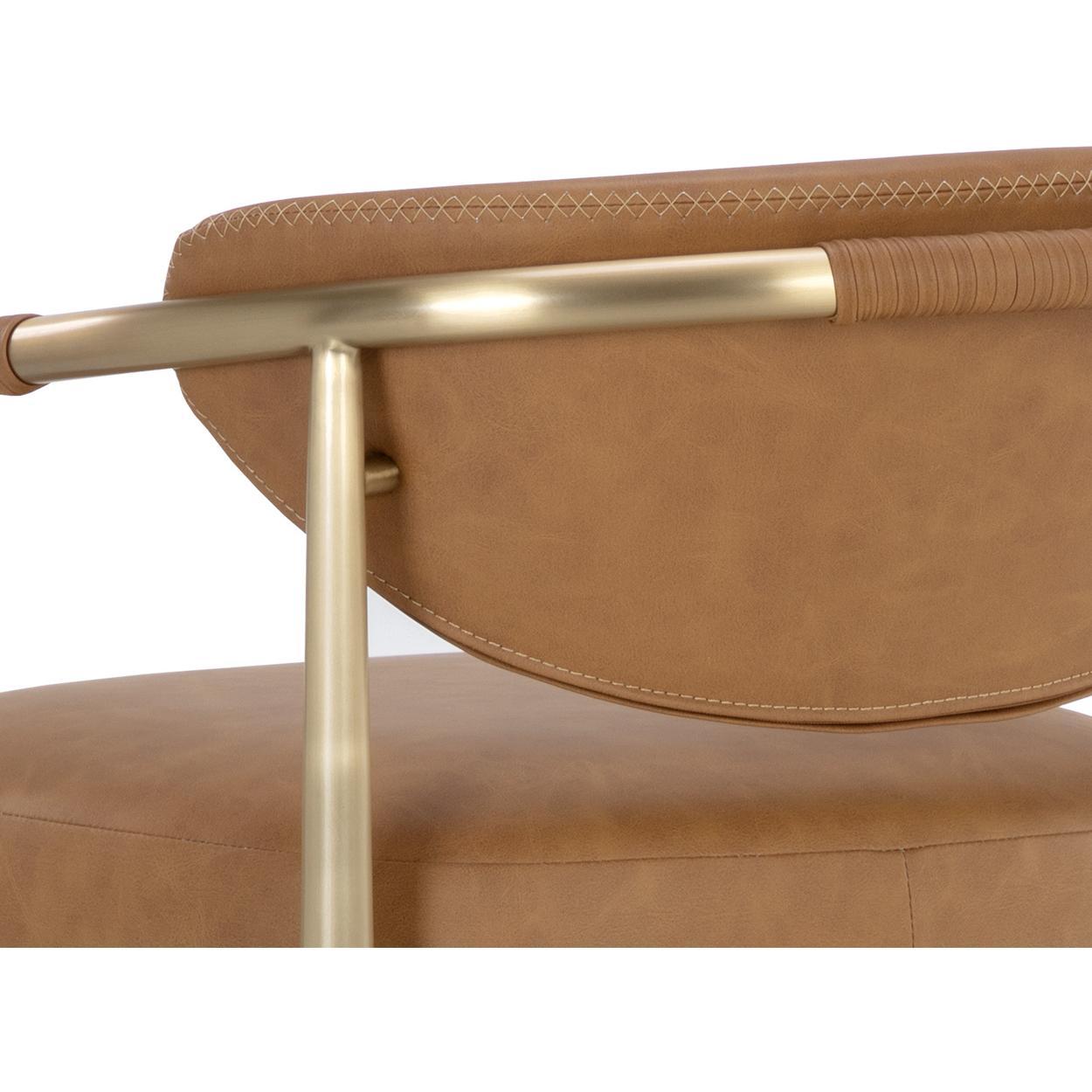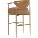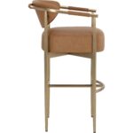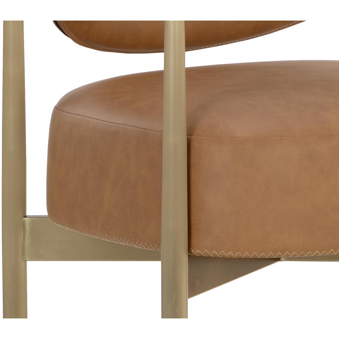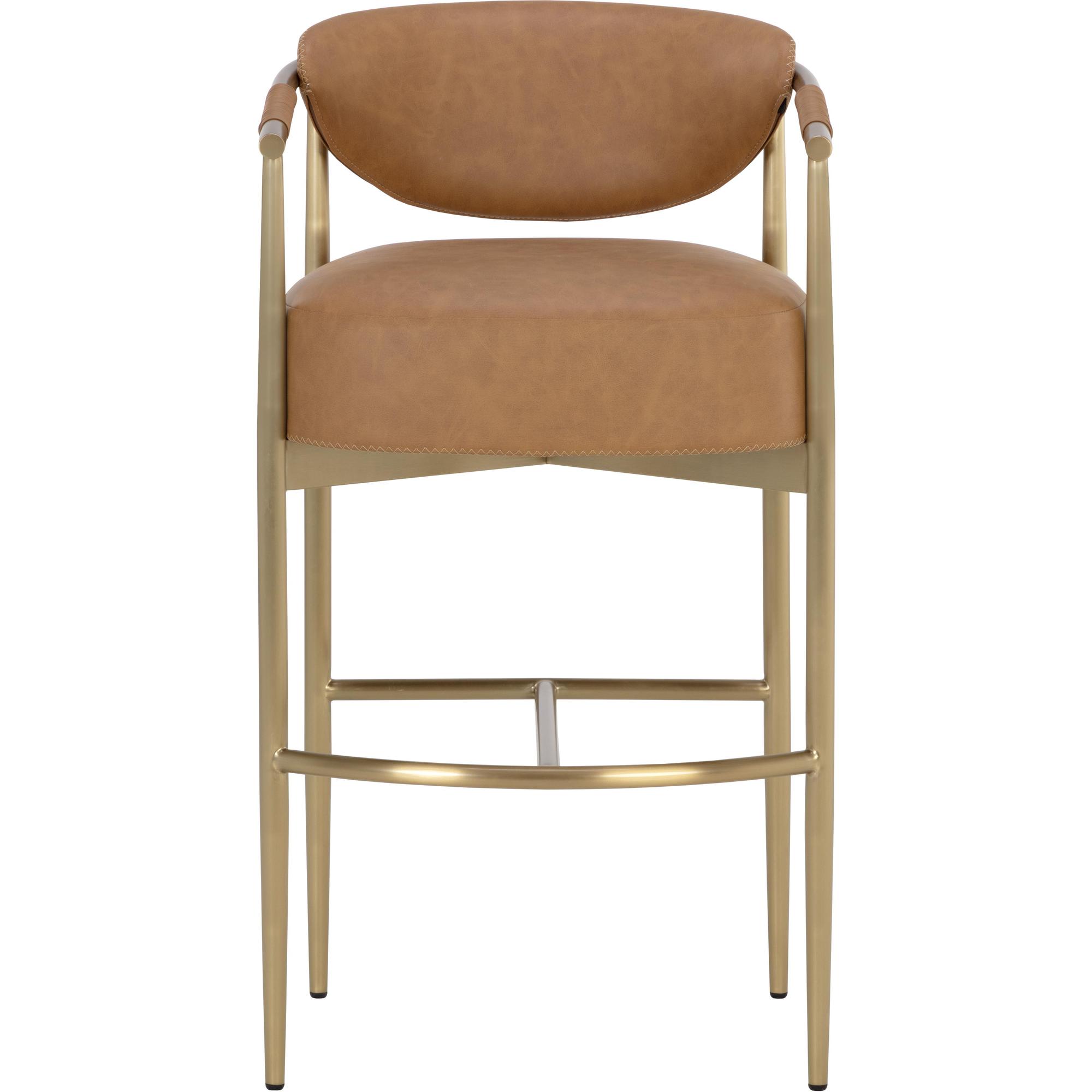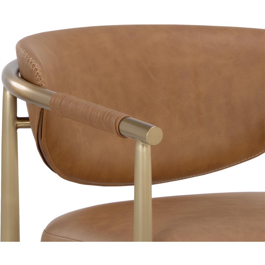 Every detail that makes up the handsome Heloise Barstool is designed with purpose. Milliken cognac faux leather upholstery and rope detailing is paired with powder-coated gold stainless steel for optimal style and comfort. Visible stitching on the seat and backrest accentuates the chair’s smooth contours. This elegant barstool will perfectly complement any dining space. Handle With Care: This design has been crafted with faux leather. Faux leather is manufactured to reflect the natural characteristics of leather; as such, colour variations, markings, wrinkles, grooves, and light scratches are appreciated characteristics. No two pieces will be alike. Visit our Product Care page for more information on how to ensure the lasting beauty of this piece.