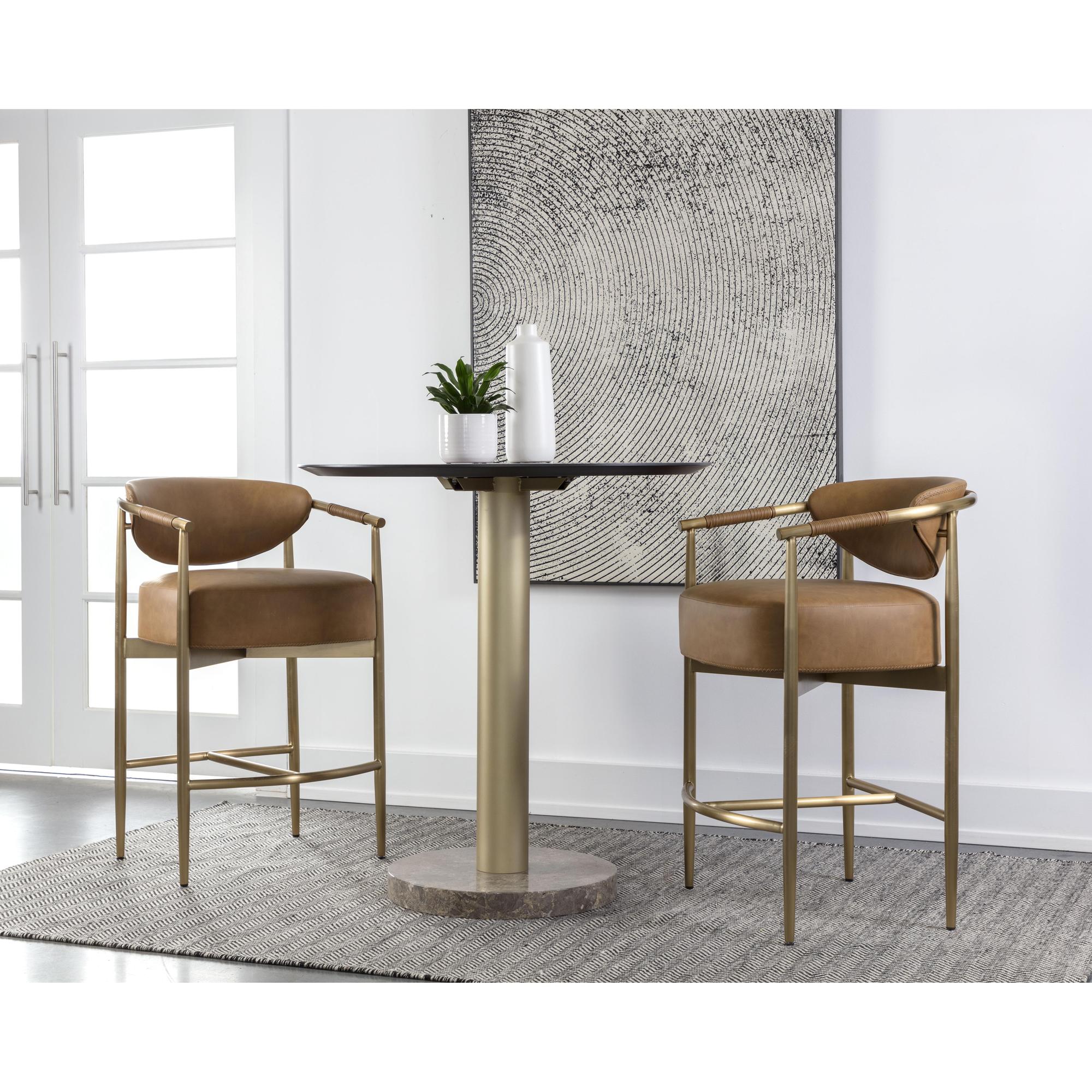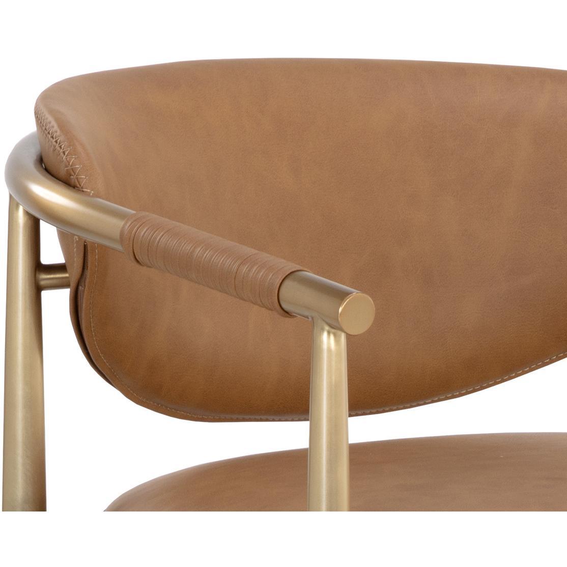 Every detail that makes up the handsome Heloise Counter Stool is designed with purpose. Milliken cognac faux leather upholstery and rope detailing is paired with powder-coated gold stainless steel for optimal style and comfort. Visible stitching on the seat and backrest accentuates the chair’s smooth contours. This elegant counter stool will perfectly complement any dining space. Handle With Care: This design has been crafted with faux leather. Faux leather is manufactured to reflect the natural characteristics of leather; as such, colour variations, markings, wrinkles, grooves, and light scratches are appreciated characteristics. No two pieces will be alike. Visit our Product Care page for more information on how to ensure the lasting beauty of this piece.