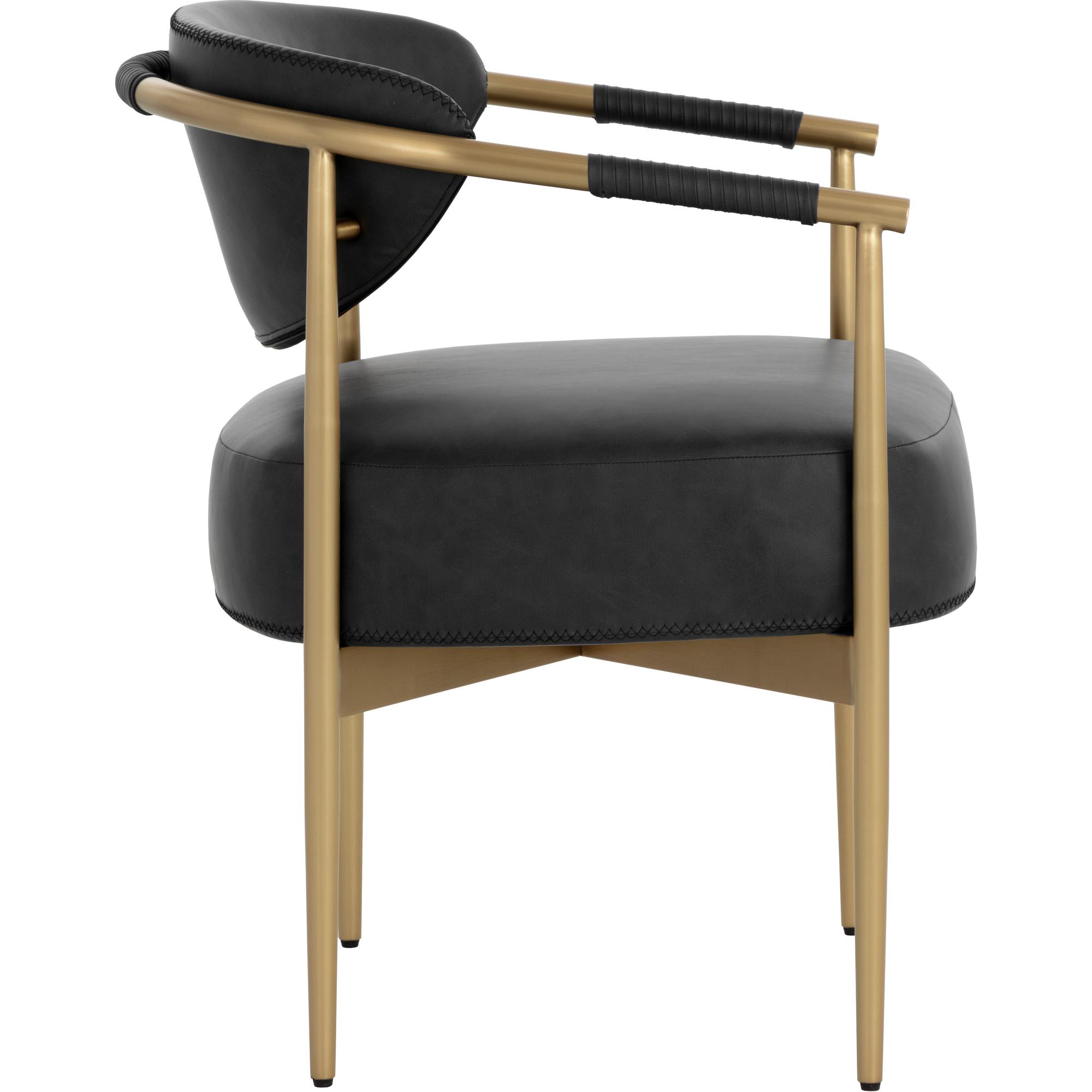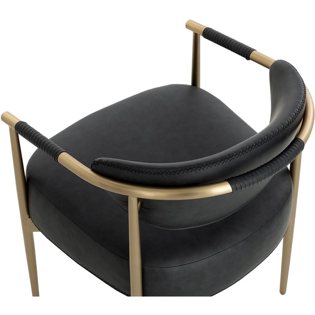 Every detail that makes up the handsome Heloise Dining Armchair is designed with purpose. Bravo black faux leather upholstery and rope detailing is paired with powder-coated gold stainless steel for optimal style and comfort. Visible stitching on the seat and backrest accentuates the chair’s smooth contours. This elegant barstool will perfectly complement any dining space. Handle With Care: This design has been crafted with faux leather. Faux leather is manufactured to reflect the natural characteristics of leather; as such, colour variations, markings, wrinkles, grooves, and light scratches are appreciated characteristics. No two pieces will be alike. Visit our Product Care page for more information on how to ensure the lasting beauty of this piece.