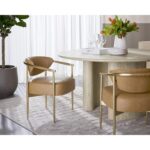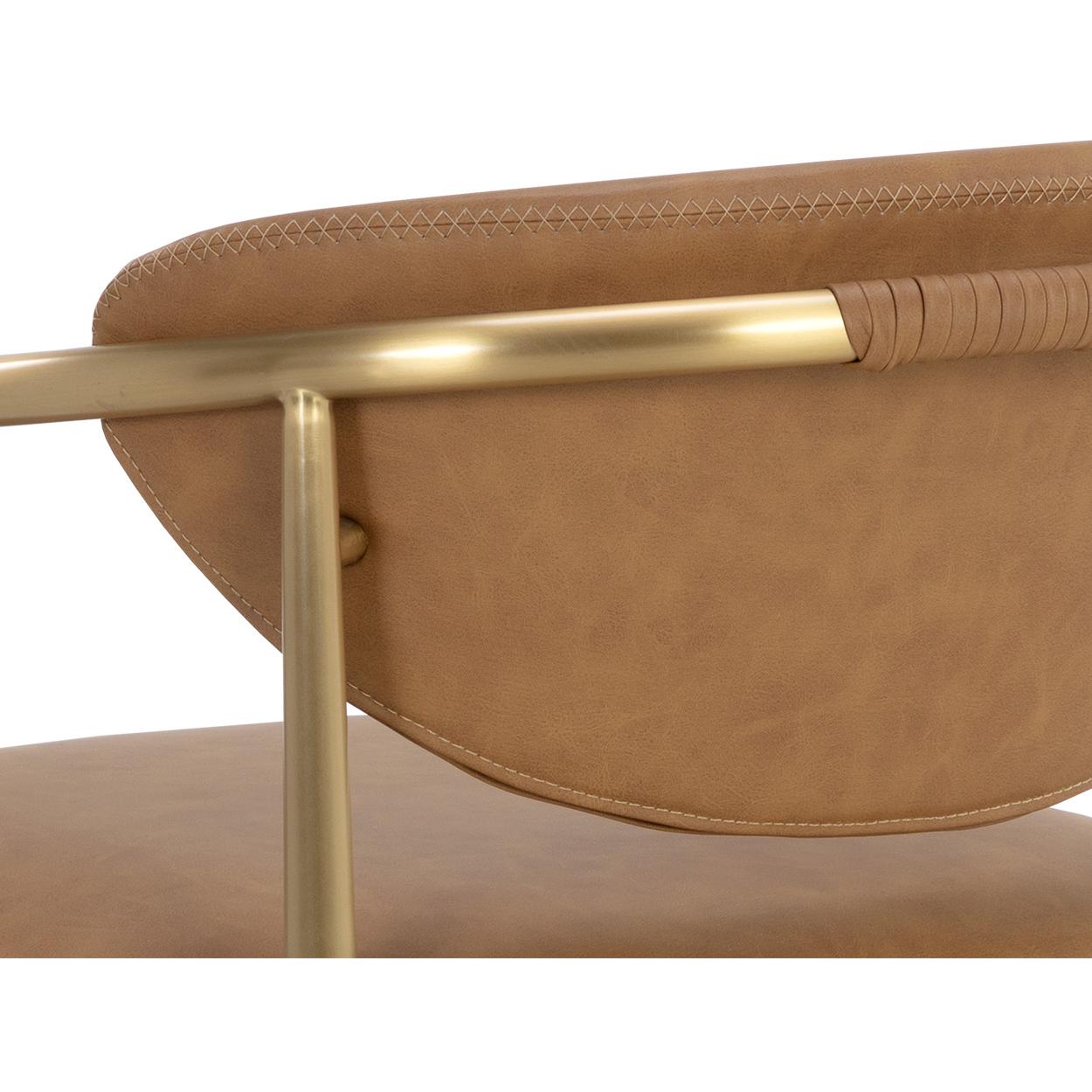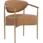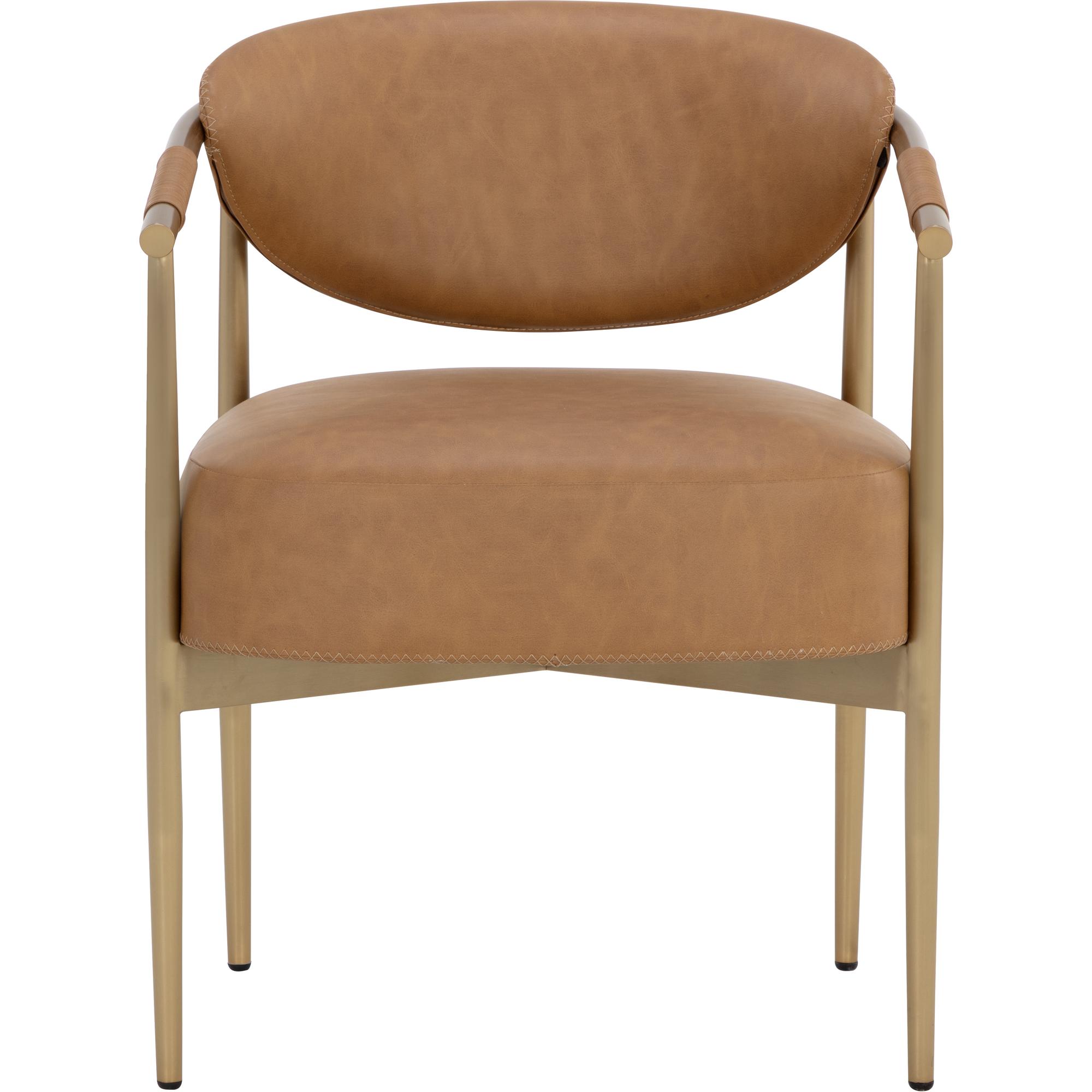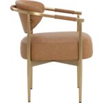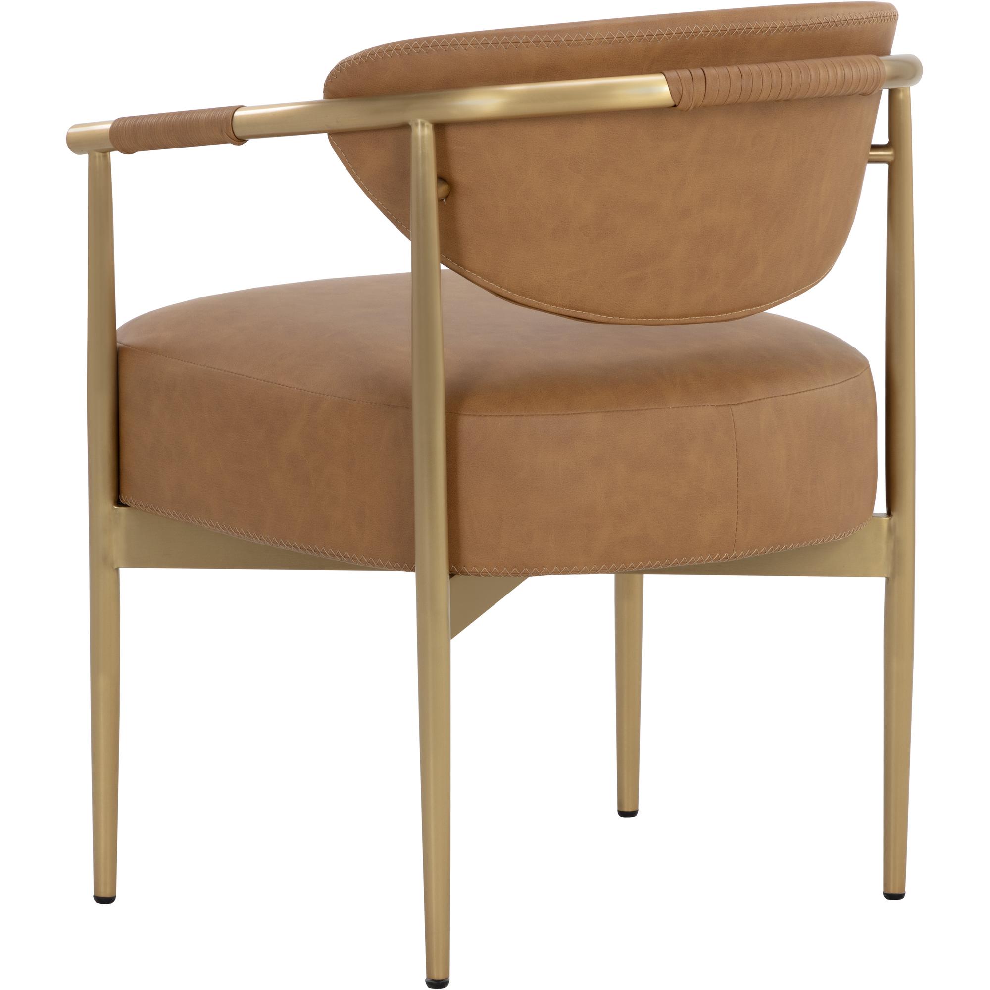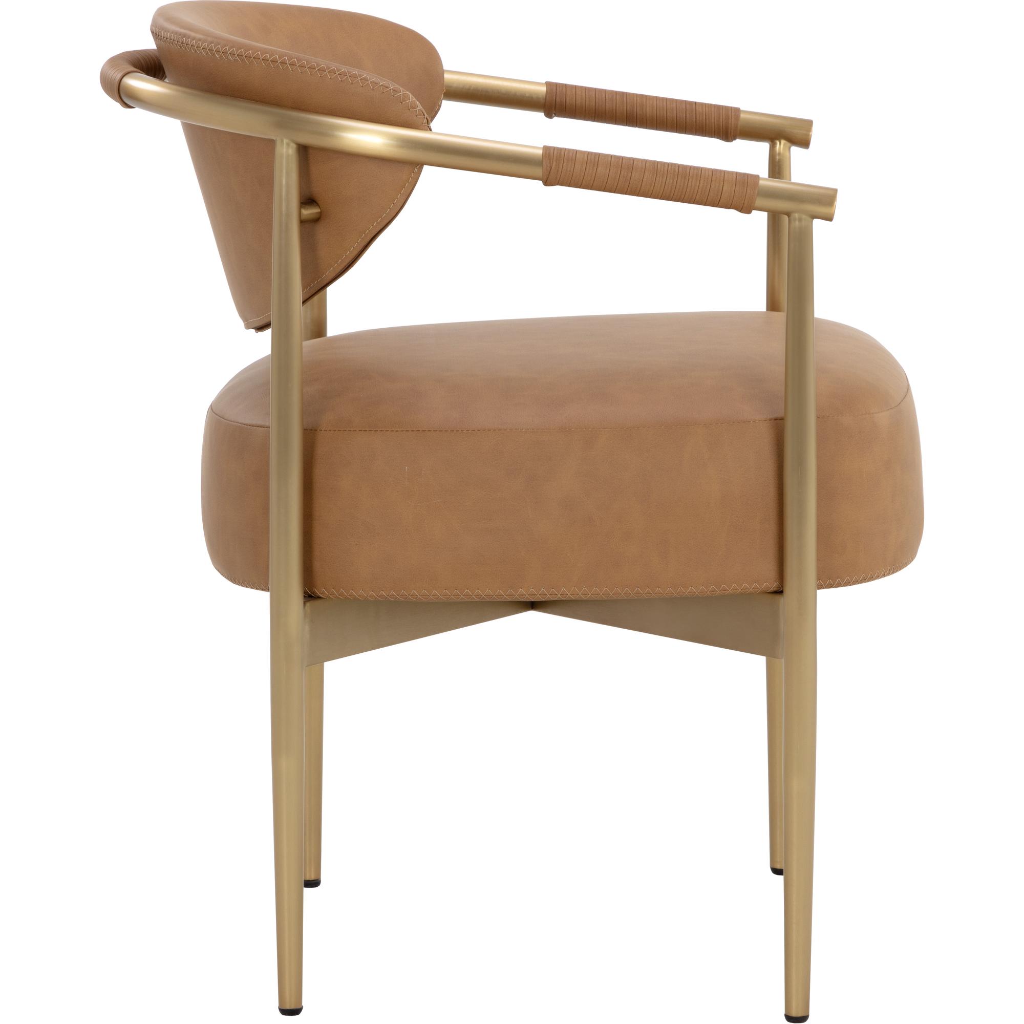 Every detail that makes up the handsome Heloise Dining Armchair is designed with purpose. Milliken cognac faux leather upholstery and rope detailing is paired with powder-coated gold stainless steel for optimal style and comfort. Visible stitching on the seat and backrest accentuates the chair’s smooth contours. This elegant dining chair will perfectly complement any dining space. Handle With Care: This design has been crafted with faux leather. Faux leather is manufactured to reflect the natural characteristics of leather; as such, colour variations, markings, wrinkles, grooves, and light scratches are appreciated characteristics. No two pieces will be alike. Visit our Product Care page for more information on how to ensure the lasting beauty of this piece.