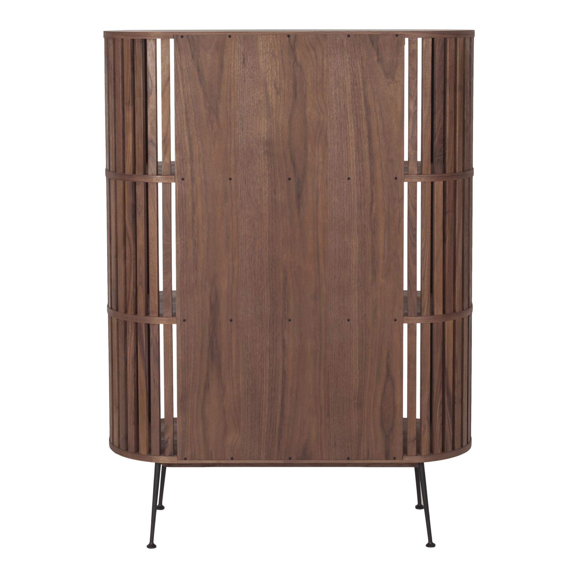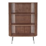 A stunning display for your own arrays. Ideal for your book collection, seashells, or whatchamacallits, this shelving unit is blazed in richly veneered solid walnut with deeper shelves for even those larger Taschen’s. Mid-century modern style with a gently rounded form and gated paneling that details its sides and back, with slightly flared steel legs. Practically perfect, this bookshelf is a multi-functional style that works from room to room.