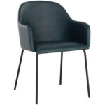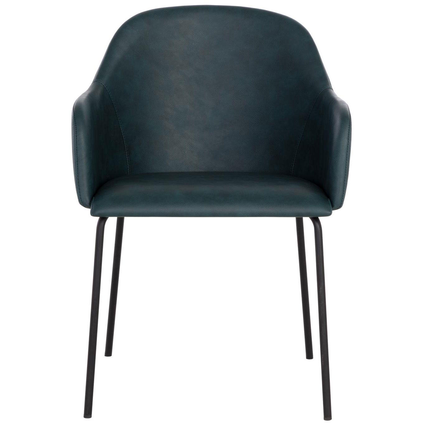 A clean and scompact dining armchair that features a modern and urban style. Stocked in dark teal faux leather and completed with powder coated metal legs in a matte black finish. Handle With Care: This design has been crafted with faux leather. Faux leather is manufactured to reflect the natural characteristics of leather; as such, colour variations, markings wrinkles, grooves, and light scratches are appreciated characteristics. No two pieces will be alike.