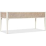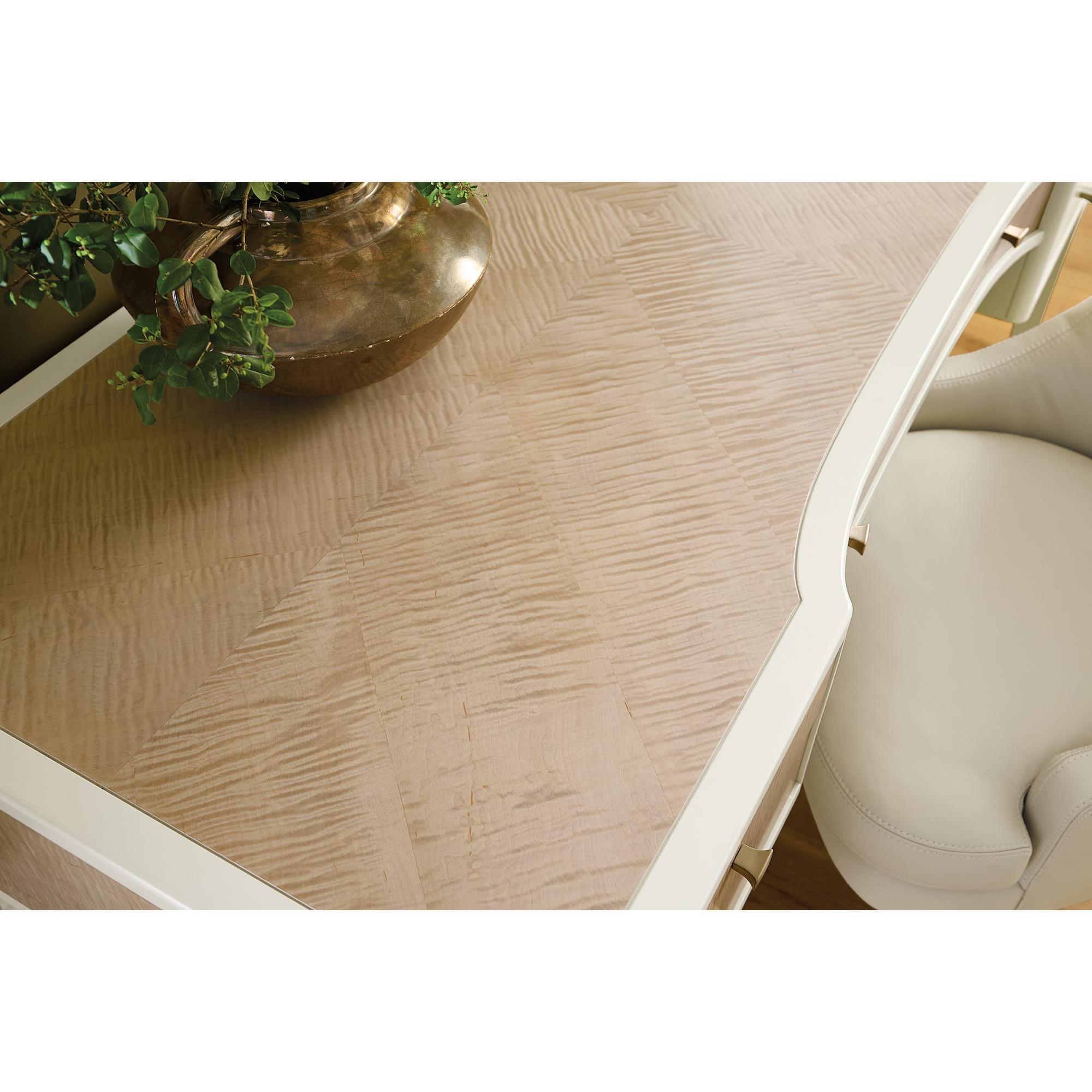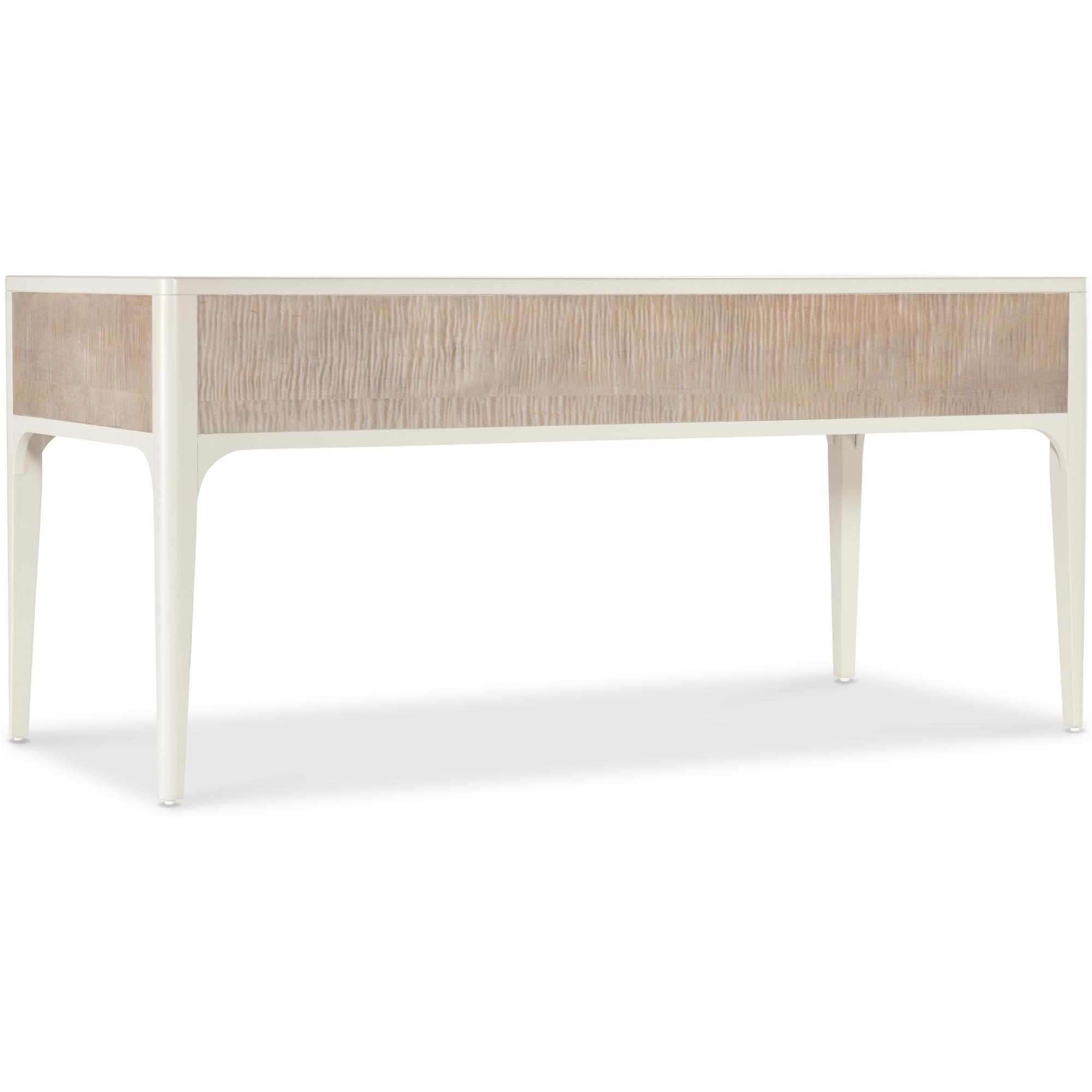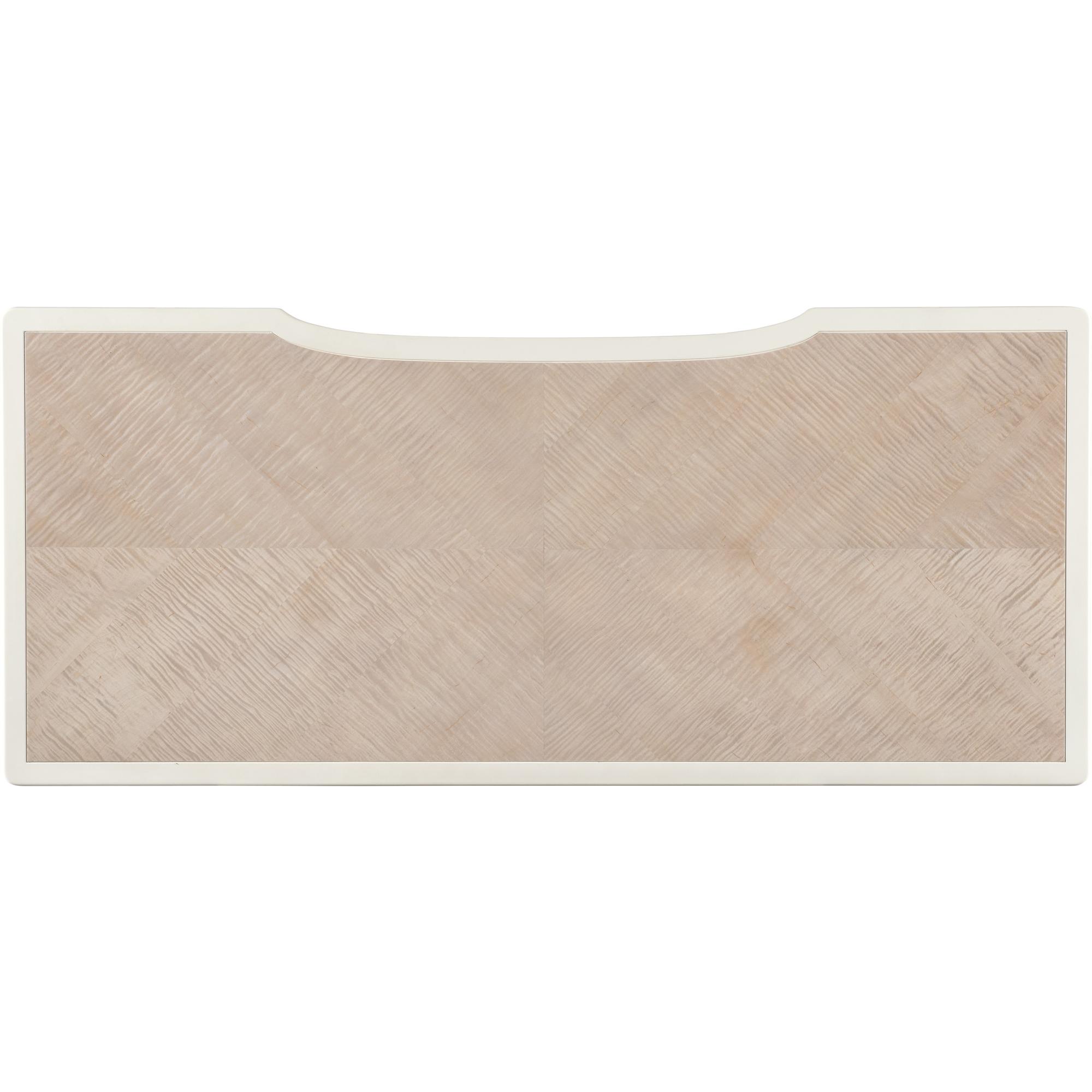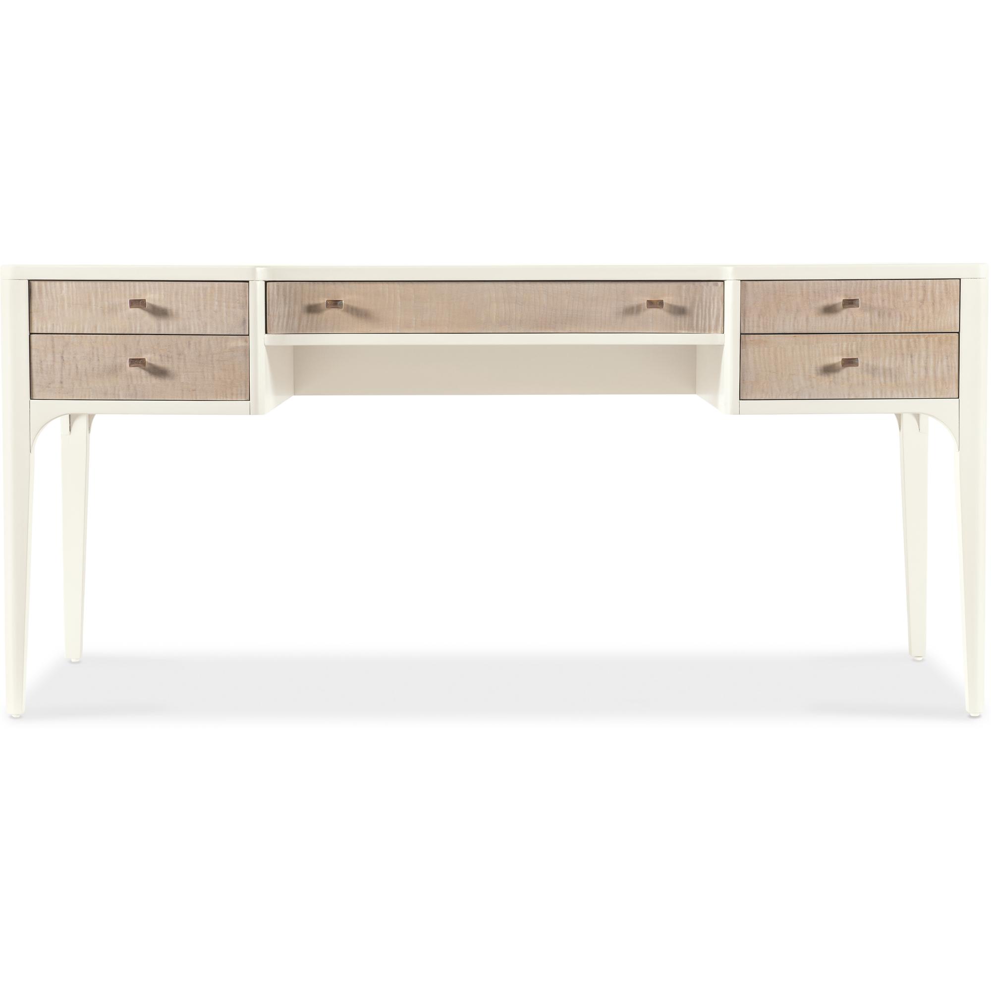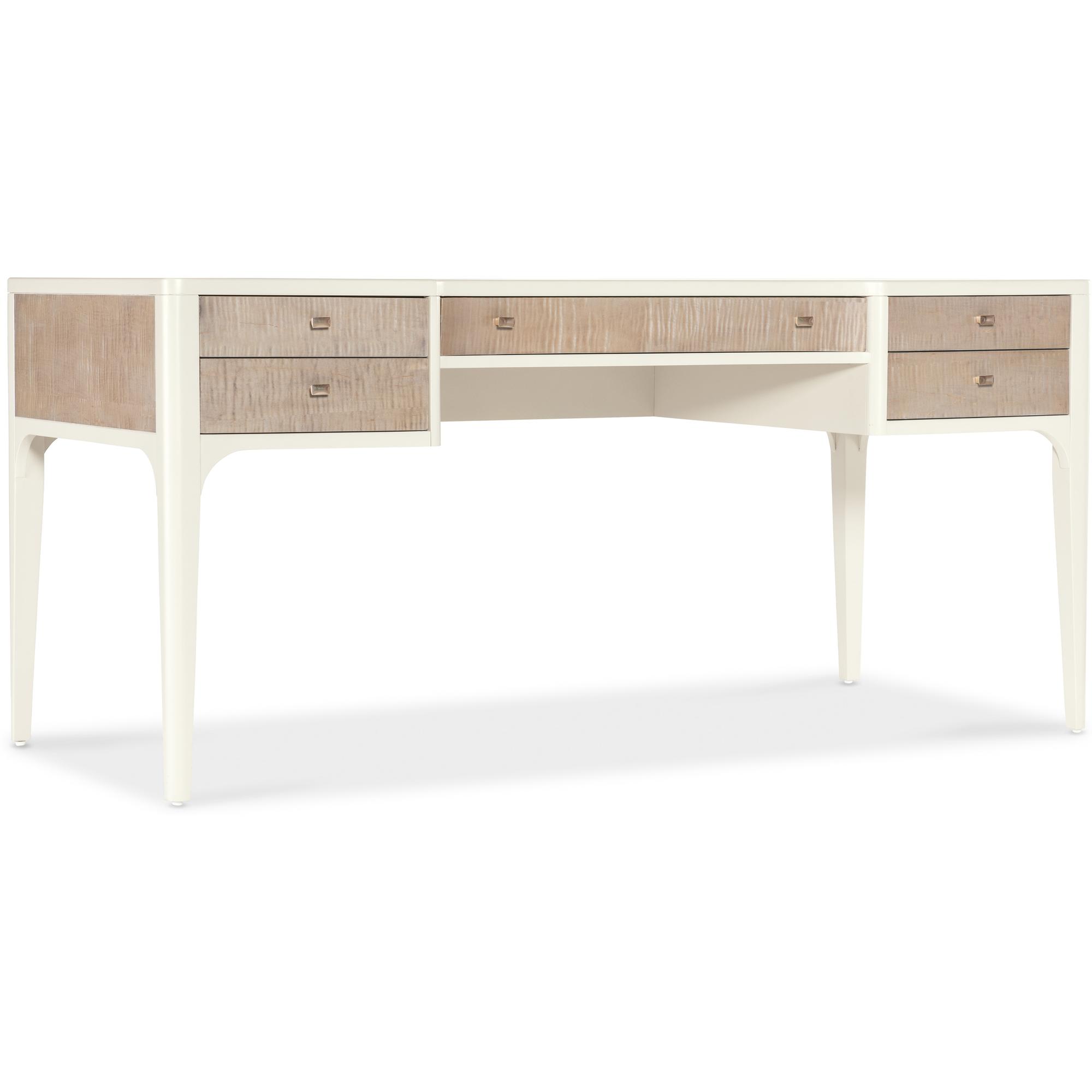 Features: Five drawers Removable/interchangeable writing surface and pencil tray can be used on either side top drawer Each of the top drawers has two removable partitions Center drawer has drop-front writing surface with wire management Two bottom utility drawers Matched veneer top creates visual interest