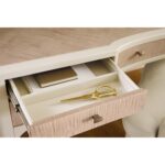 Finish: Almond white finish with contrasting light figured maple veneers on top, drawer fronts and sides. Small gold knob pulls.