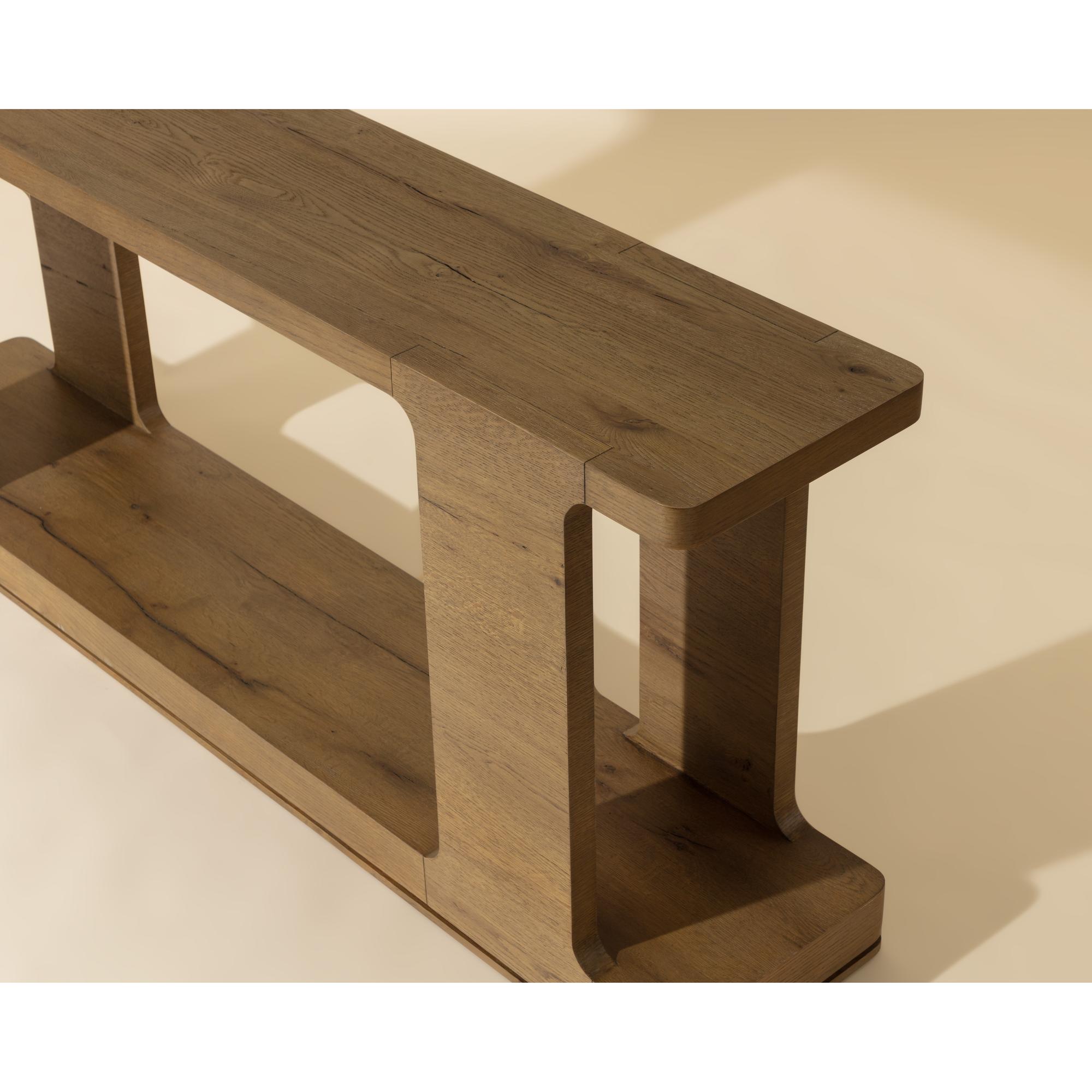 The Hercules Console Table is a seamless union of flared curves and precise lines that lend a refined, architectural silhouette. Expertly crafted from reclaimed oak veneer, each piece retains the natural knots, cracks, and graining found in wood to bring enhanced texture and distinct character to the design.