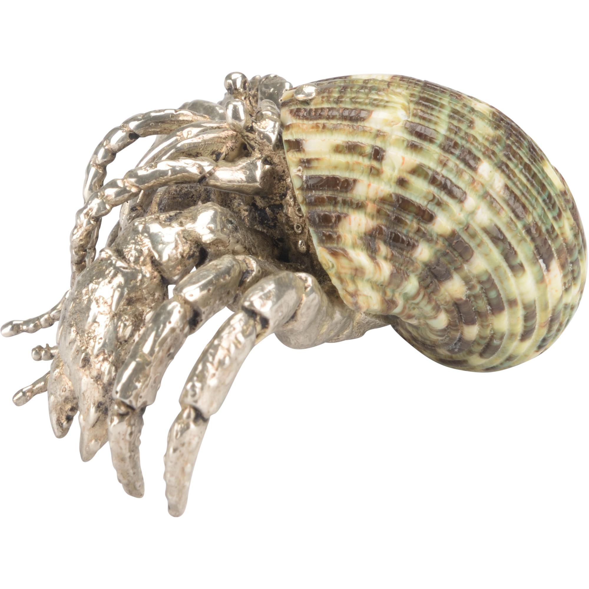 A small creature with unique detail the Hermit Crab Paperweight is made of a silver plated body and jade turbo shell. A fun accessory to add to any surface.