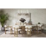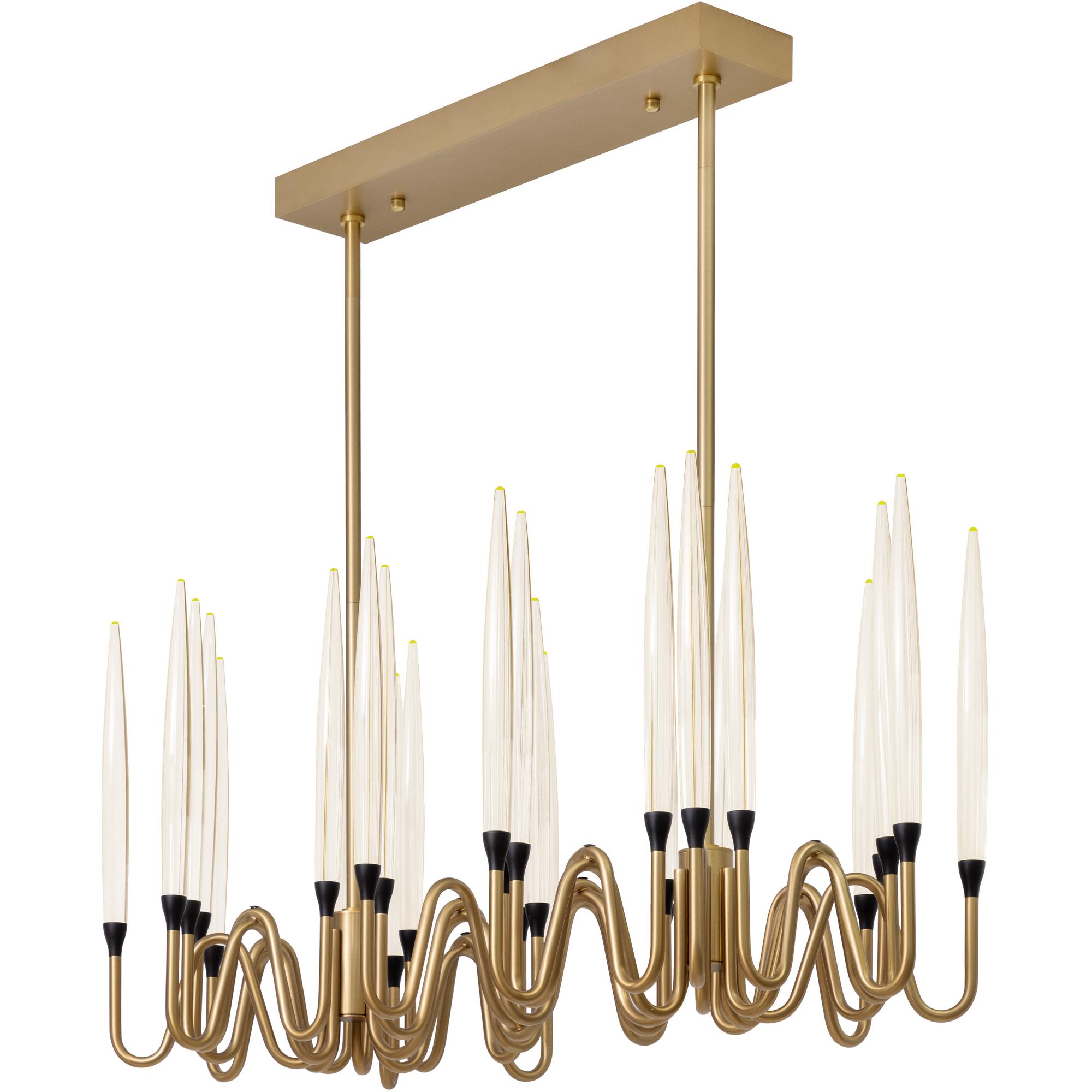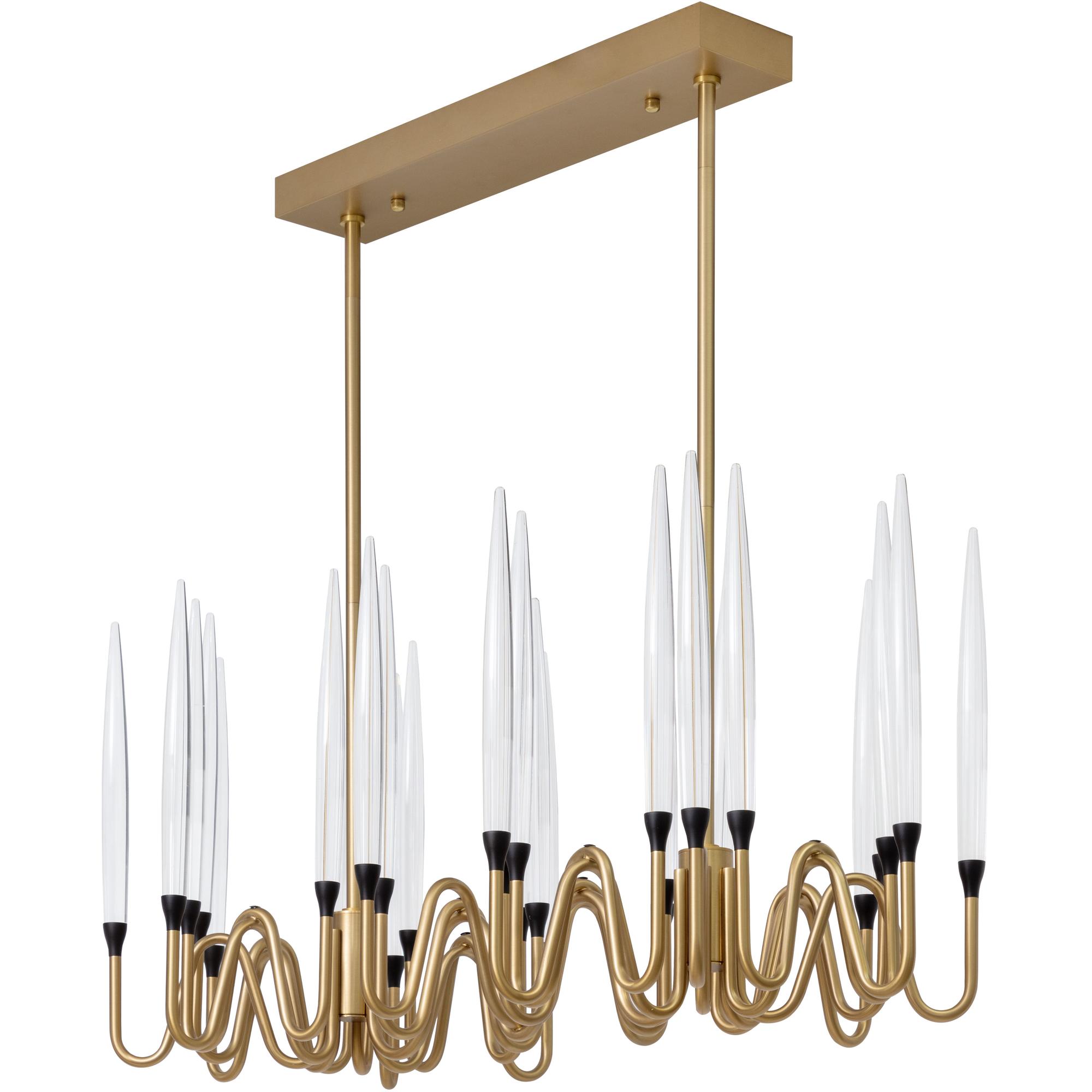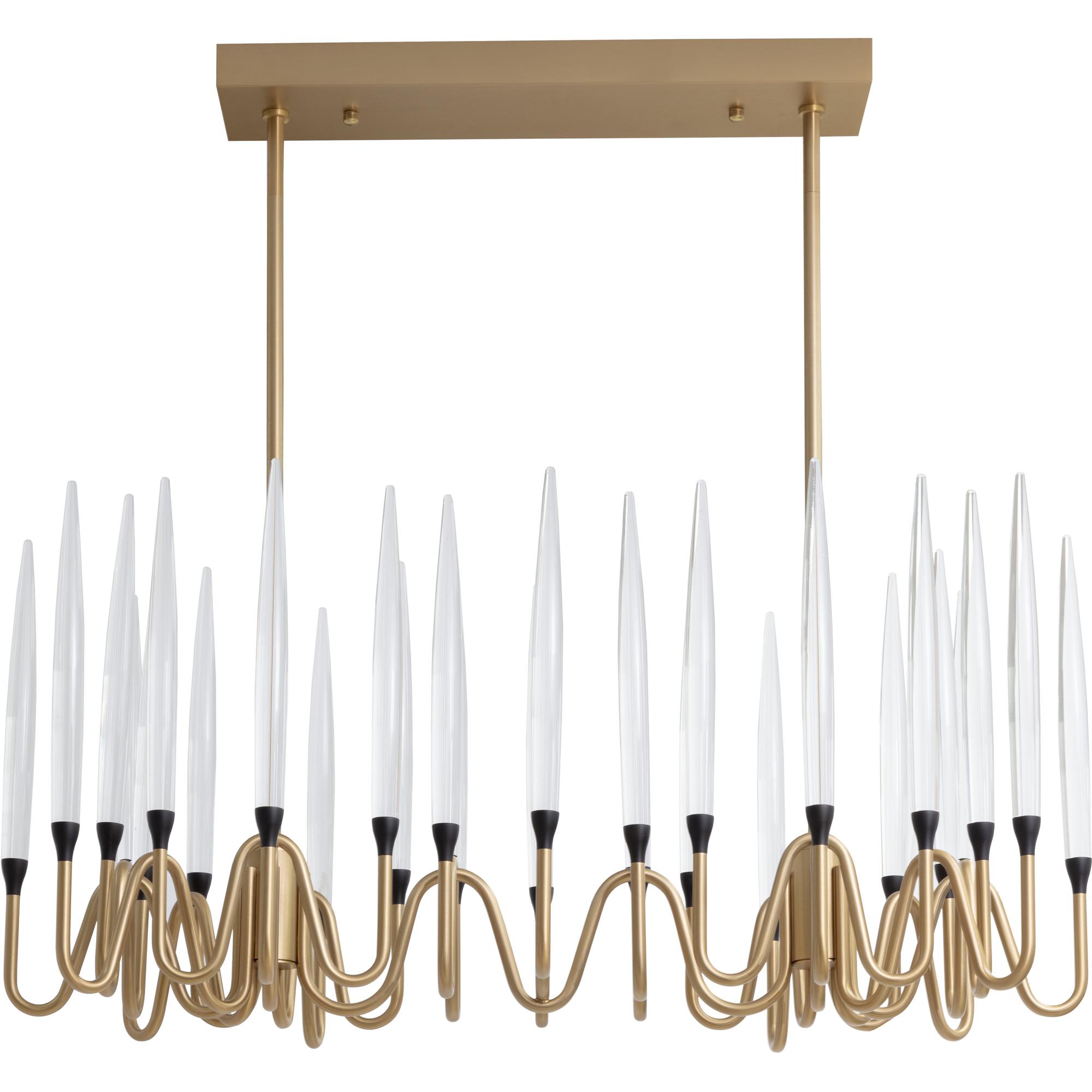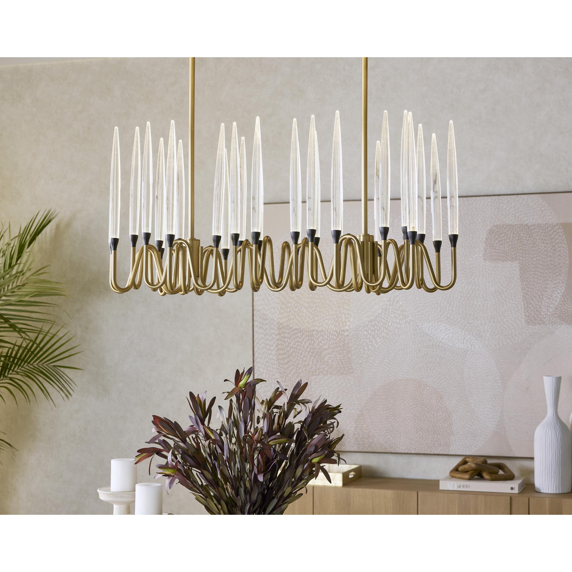 The Hestia Chandelier gives a nod to classic style. Cleverly crafted from an iron frame in a brushed gold finish. Acrylic rods sit atop the sinuous curves of the suspended fixture.
